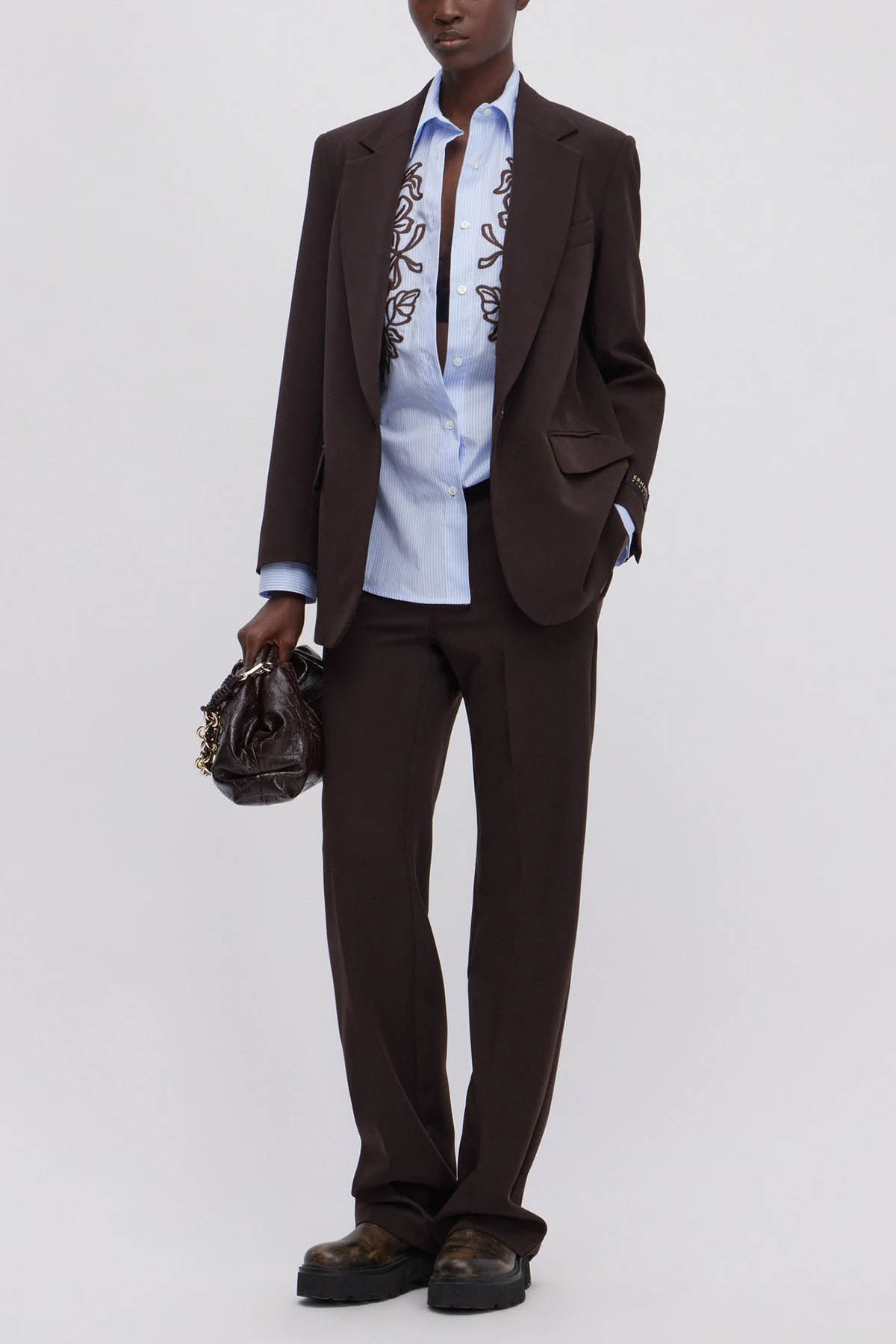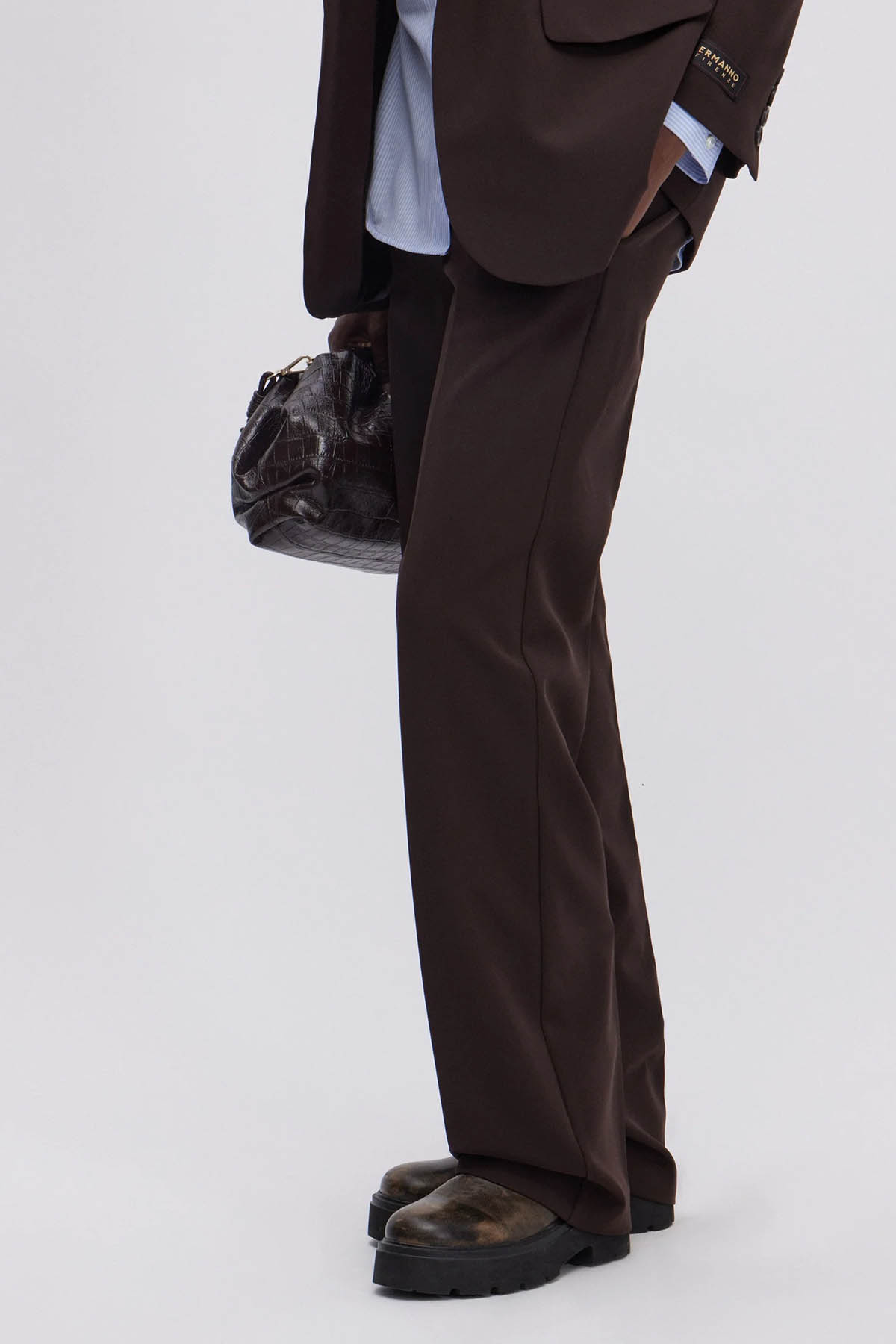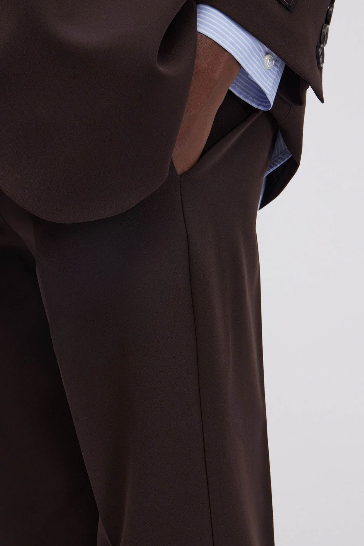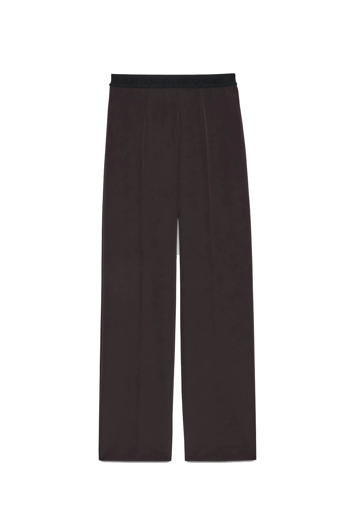 Modello in cadì stretch con elastico logato in vita, tasche nei fianchi e gamba morbida dritta, piega stirata.