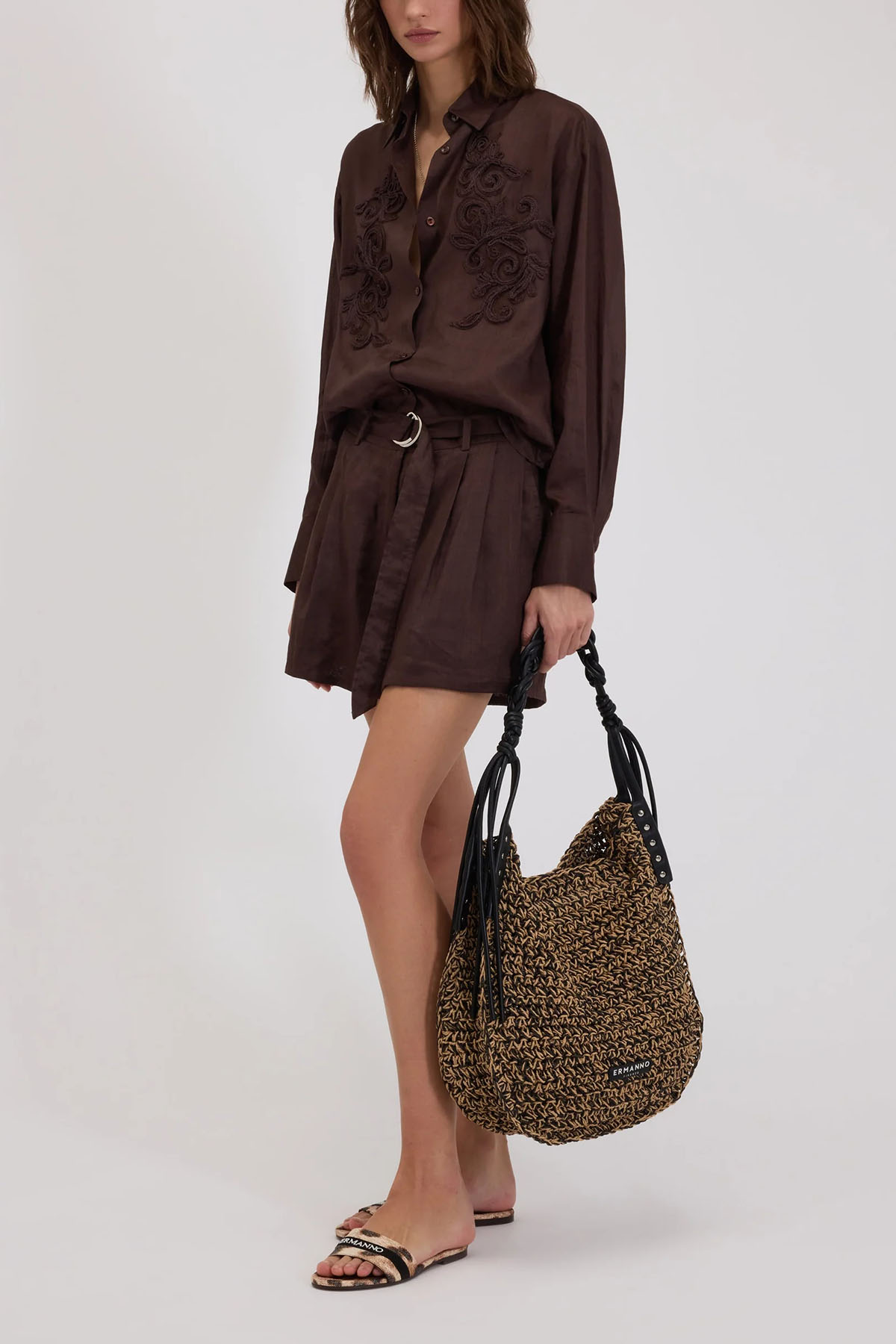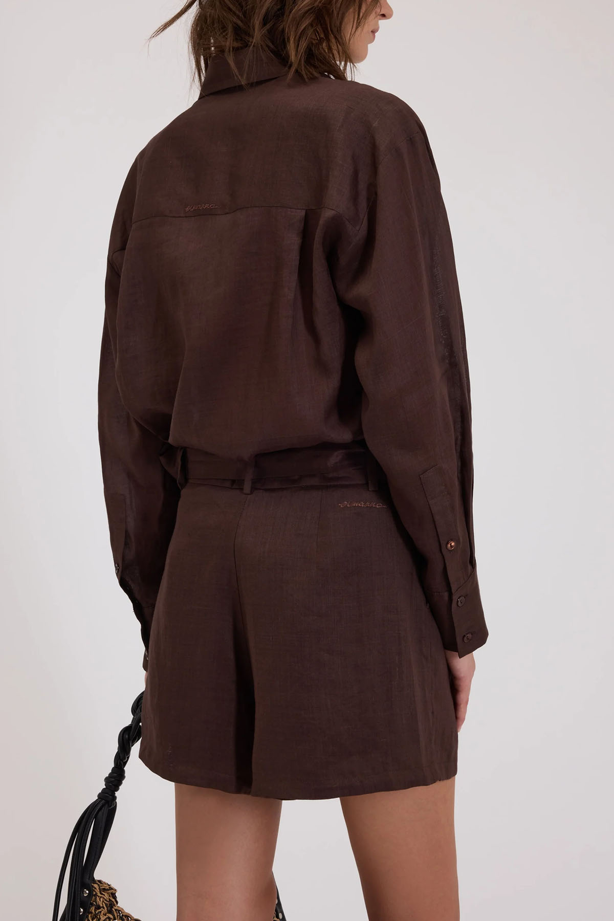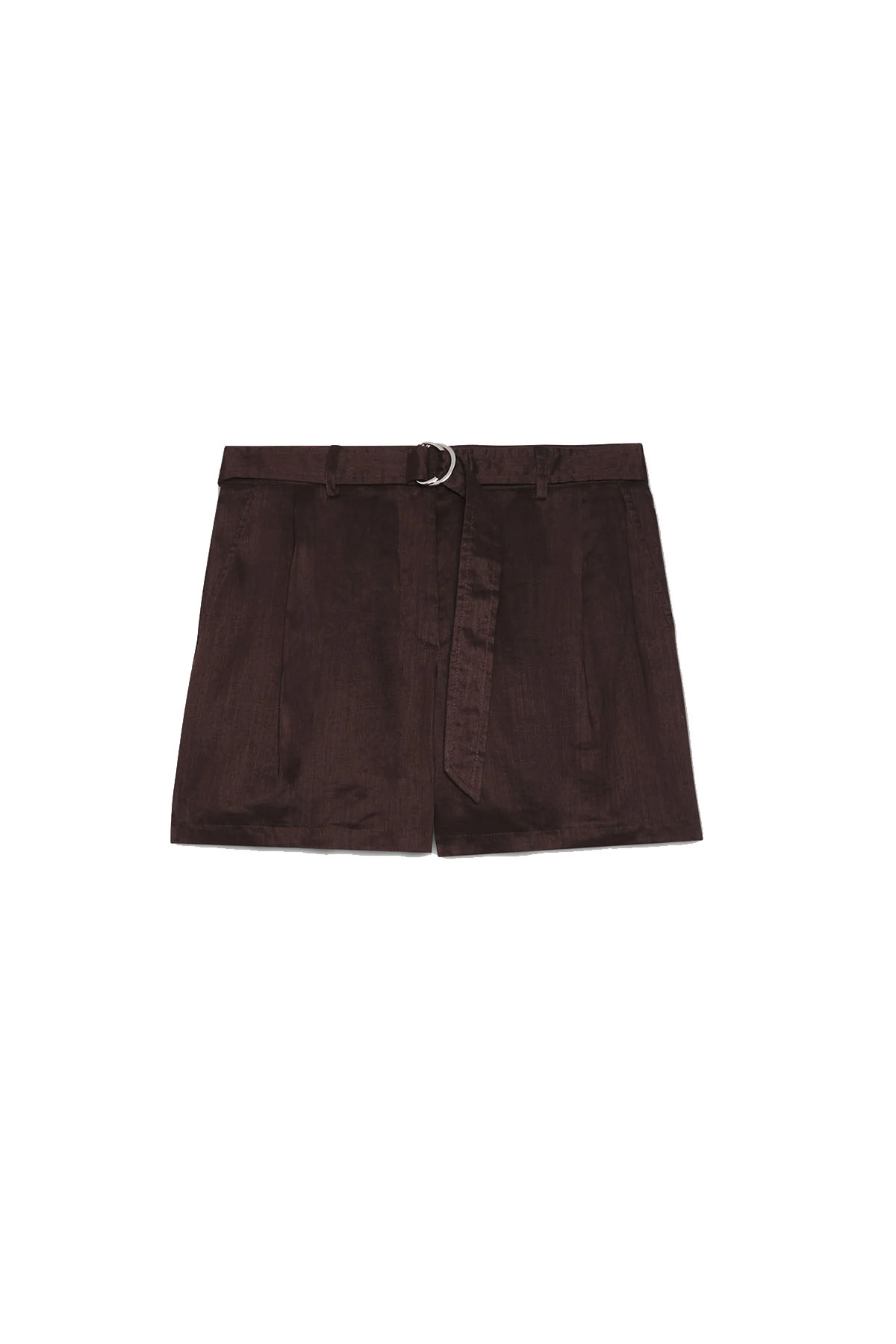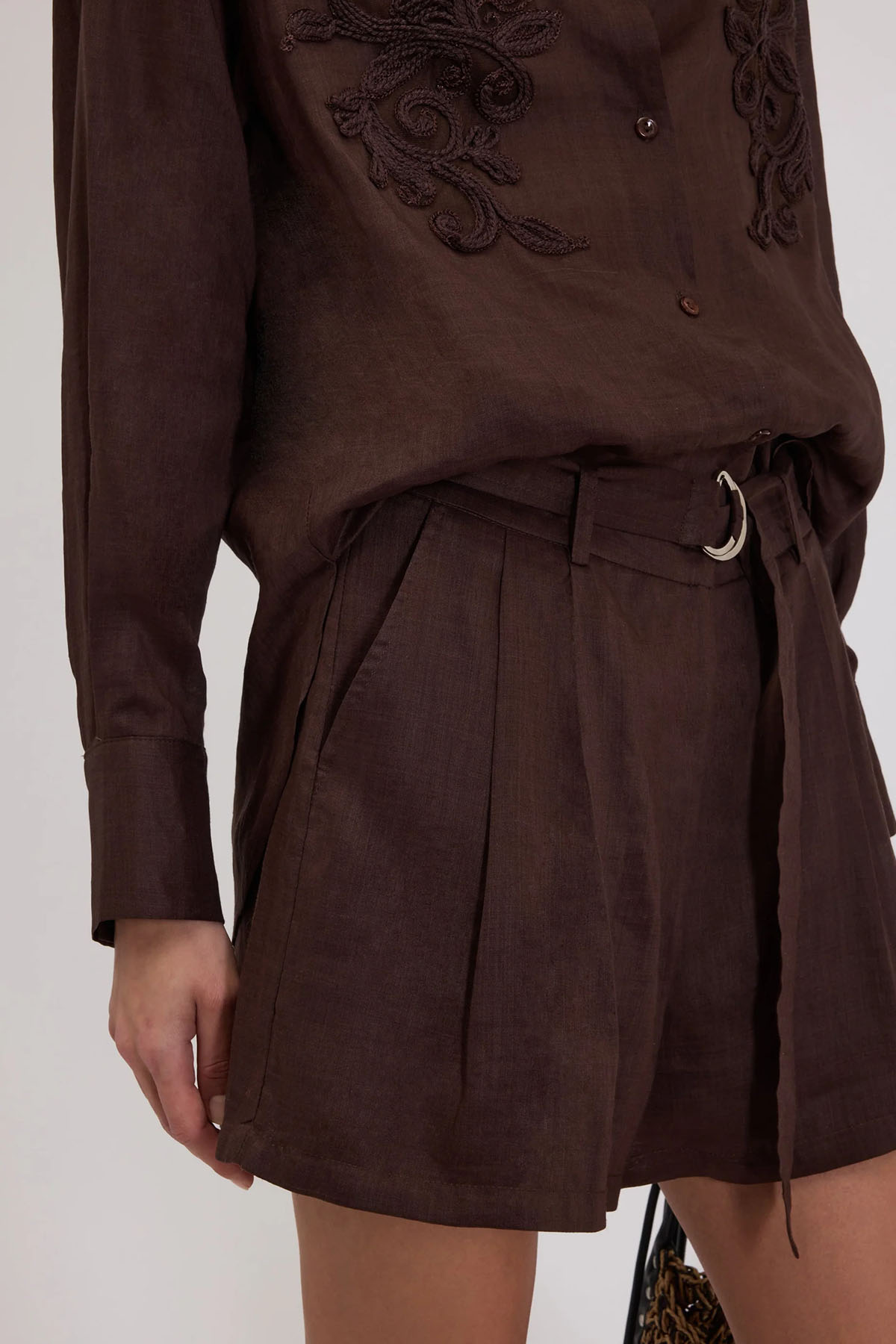 Bermuda sartoriale in lino, vita regolare con cintura di tessuto regolabile, gamba ampia con pieghe sul davanti, tasche nei fianchi e logo ricamato sul retro.