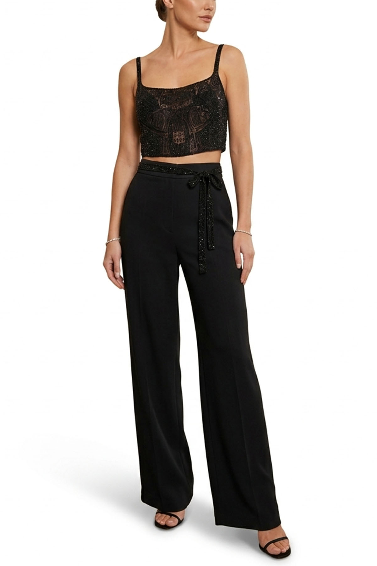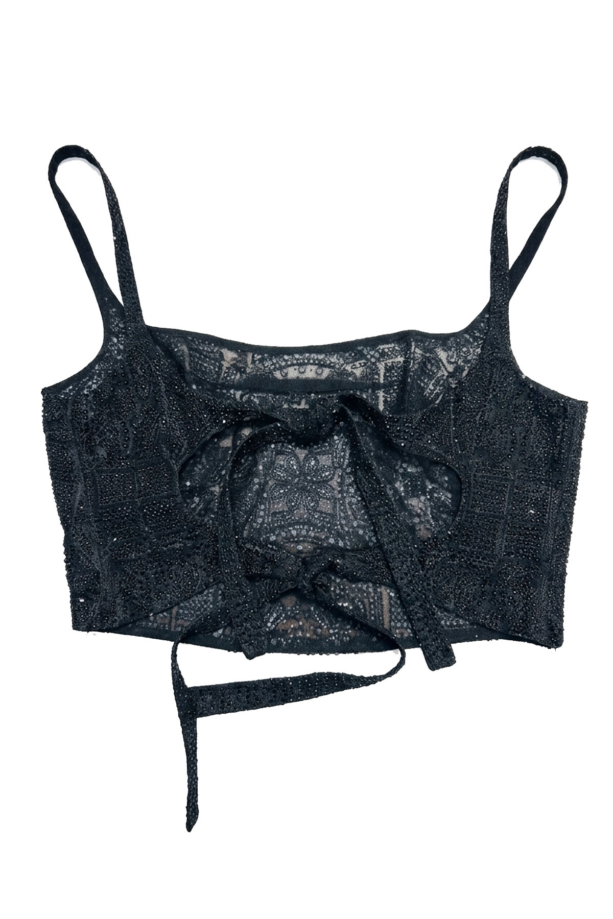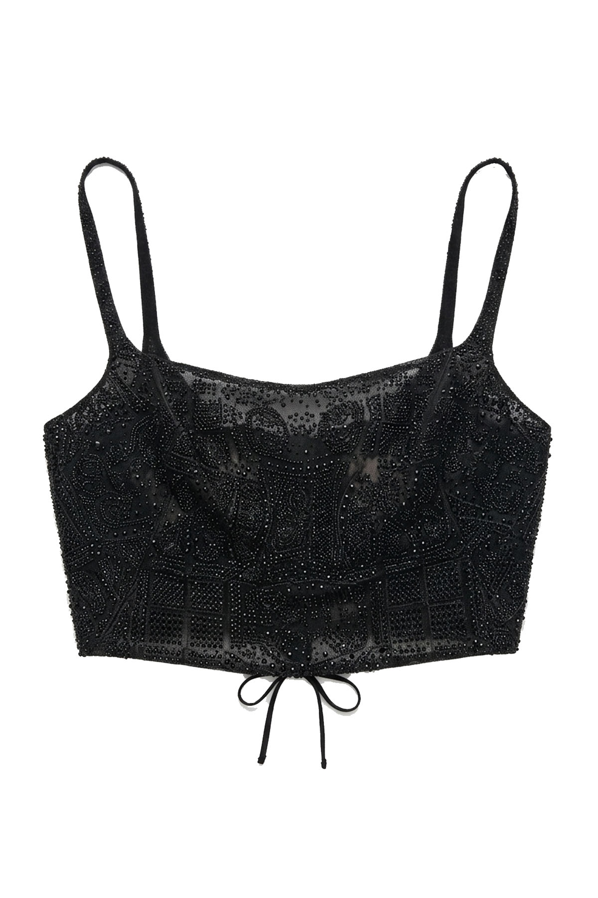 top nero con spalline sottili, micro swarovski applicati, colore nero, chiusura posteriore con fiocchi, design semitrasparente, design crop.