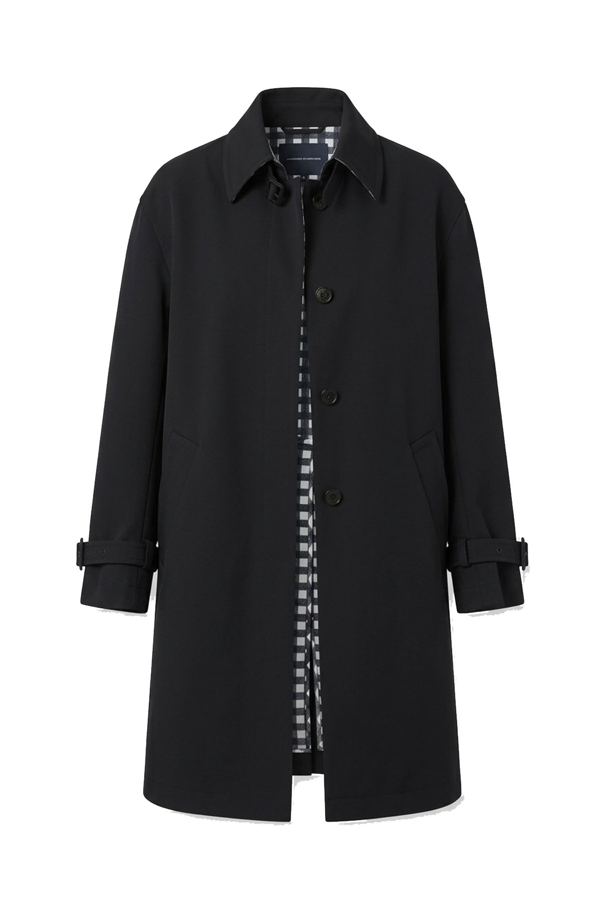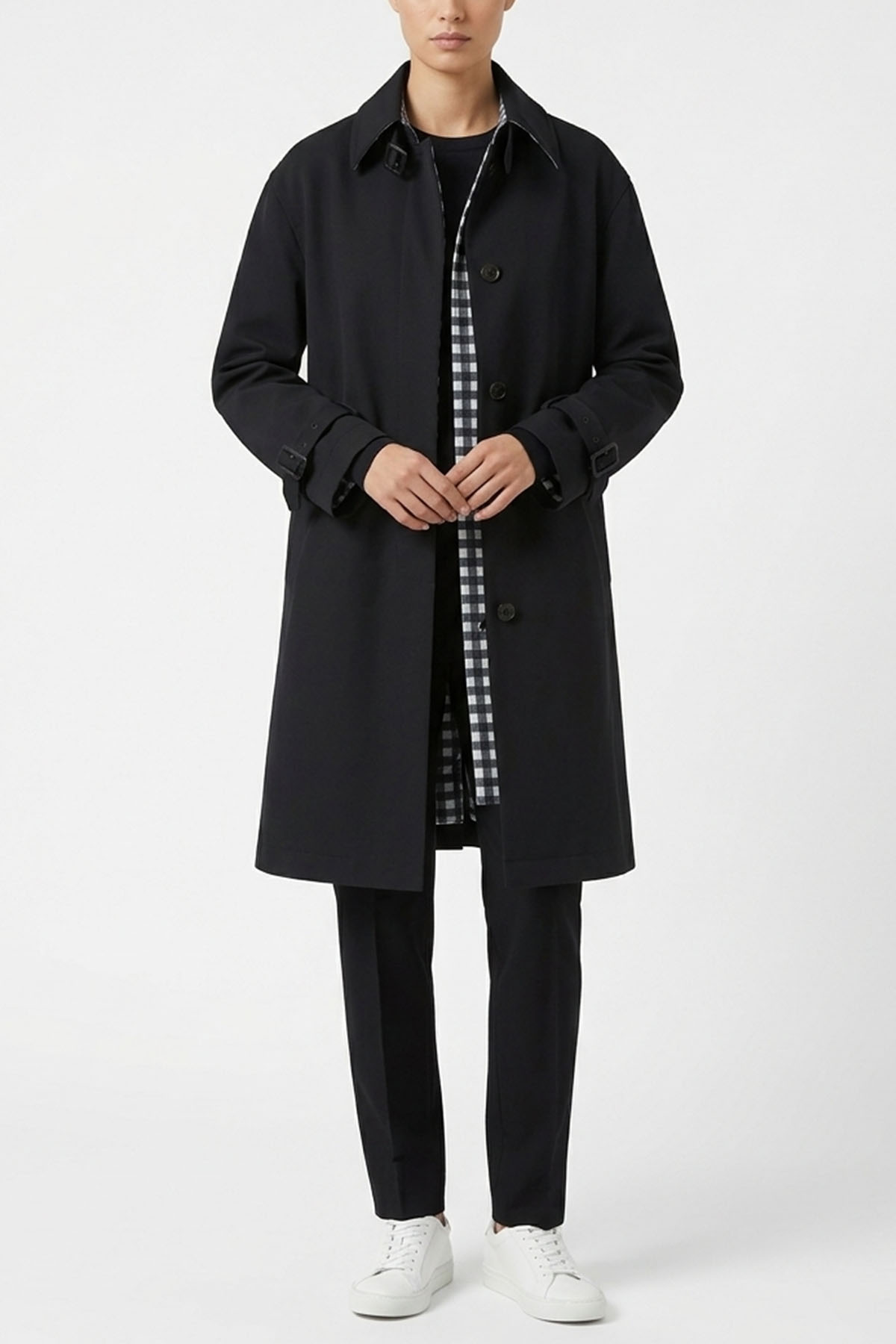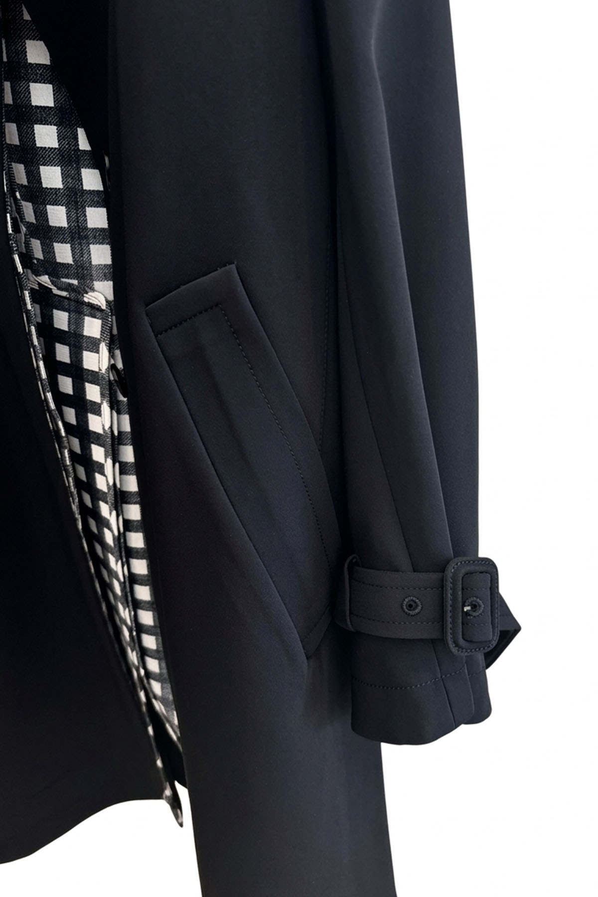 modello monopetto nero con fodera interna in stampa vichy, manica lunga, colletto classicco, abbottonatura frontale nascosta, cintura in vita regolabile e rimovibile, tasche laterali, lunghezza al ginocchio.