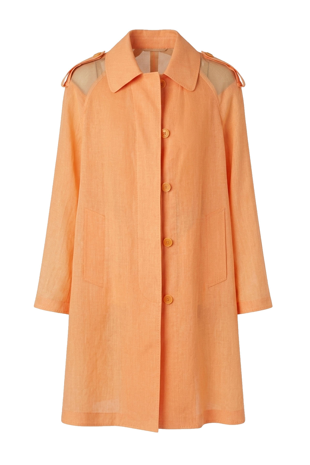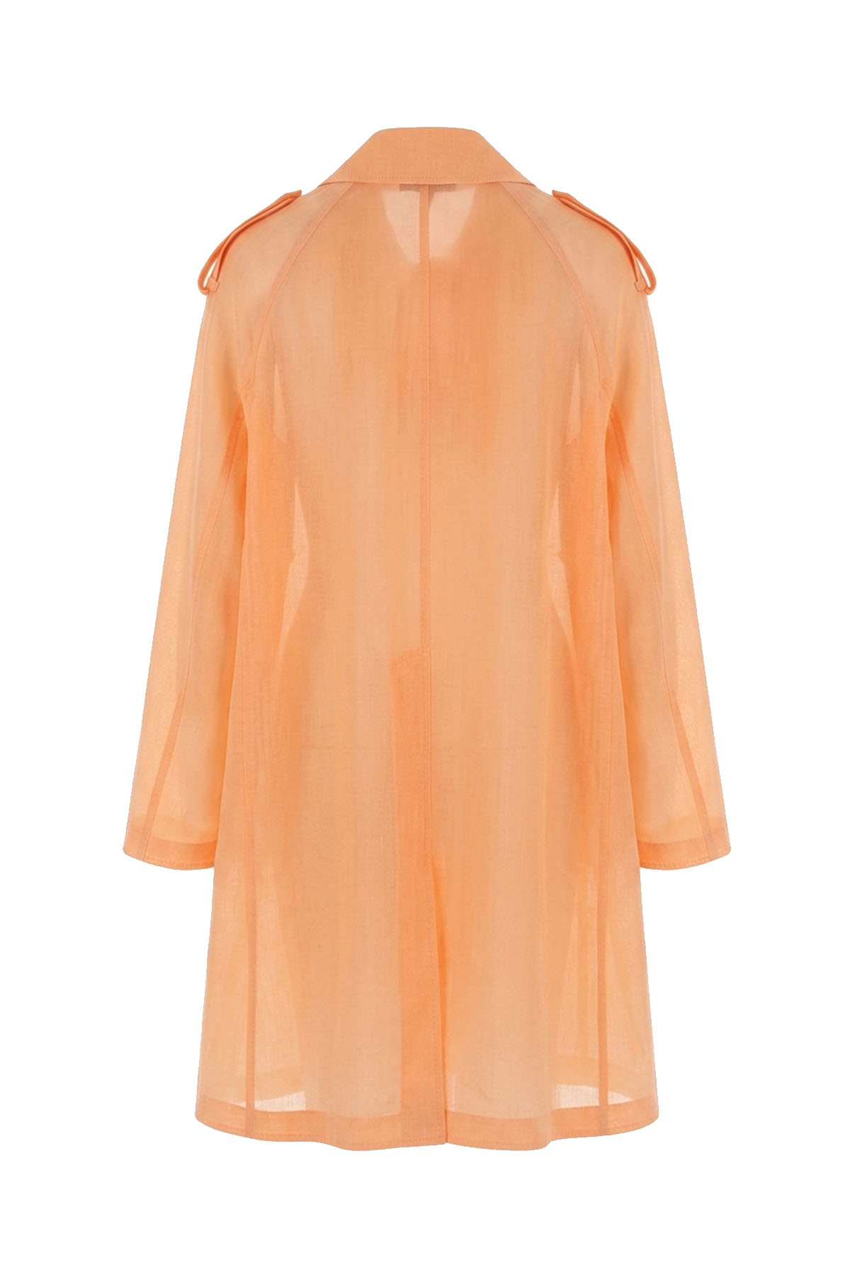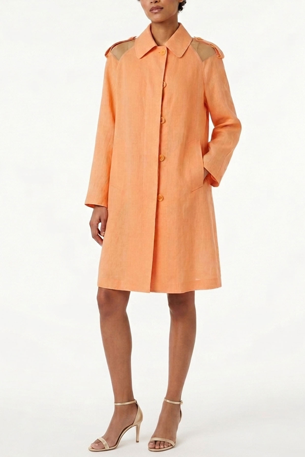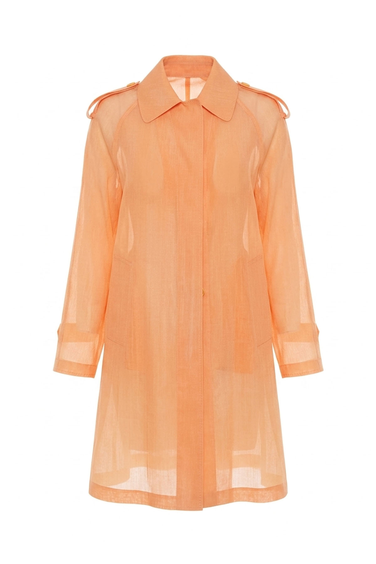 modello con colletto, colore arancio, manica lunga, abbottonatura frontale nascosta, design velato, tasche laterali, media lunghezza.