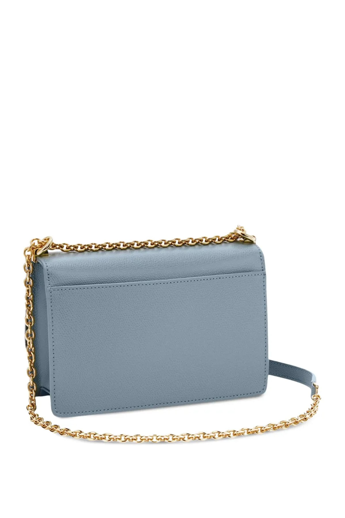 mini bag da indossare a spalla o a tracolla, colore azzurro, Realizzata in pregiata pelle stampata dalla finitura granata, Tasca interna aperta per carte di credito e documenti, Tasca esterna aperta sul retro, Tracolla fissa in catena con spezzone regolabile in pelle abbinata, Chiusura a girello con logo Arco.