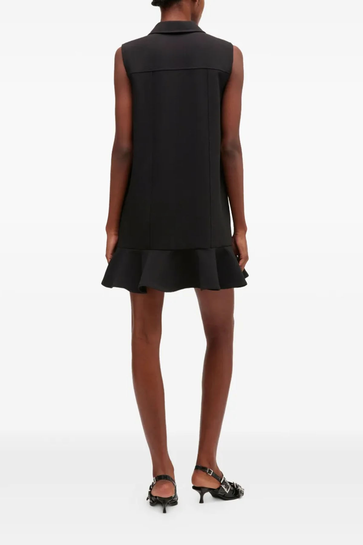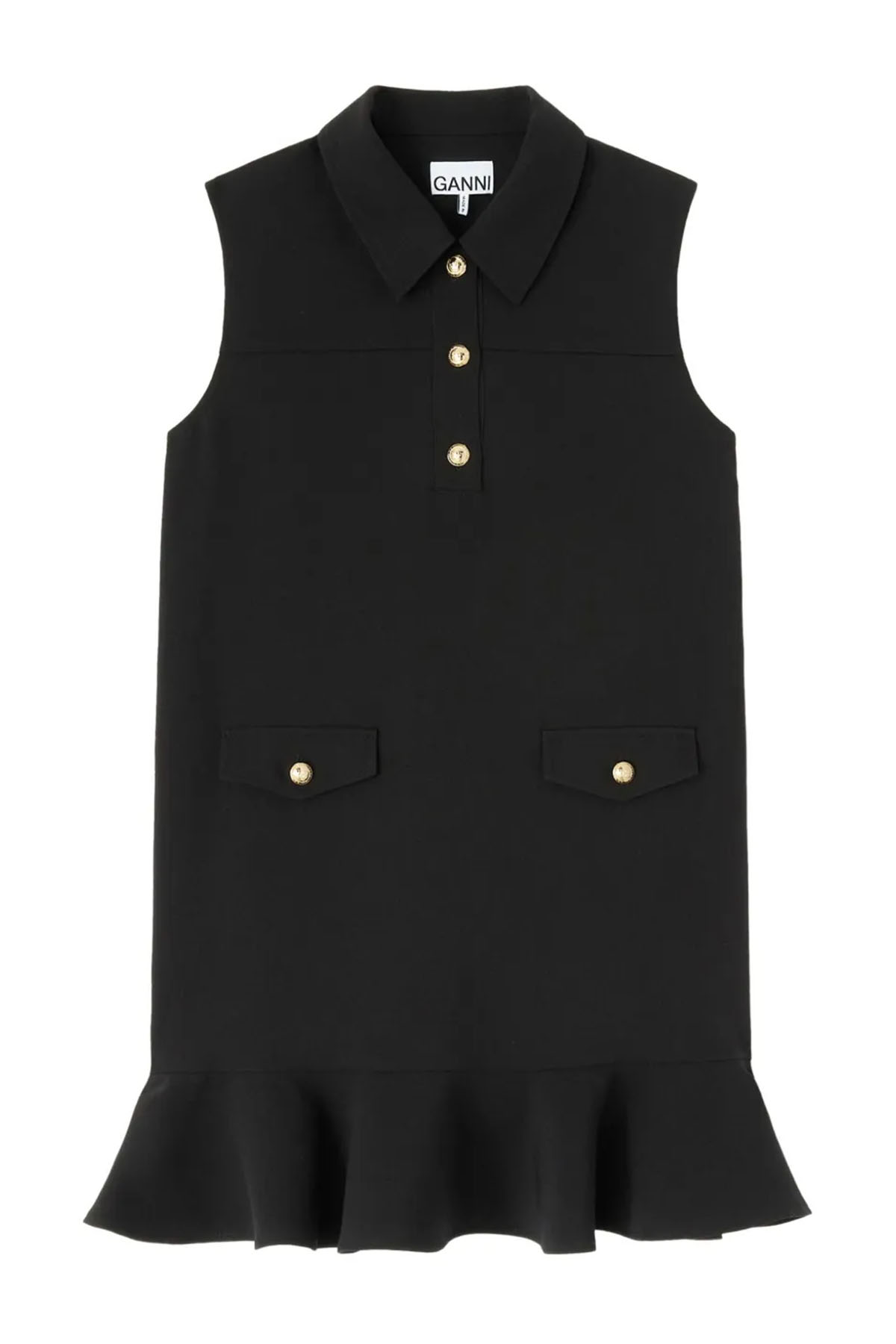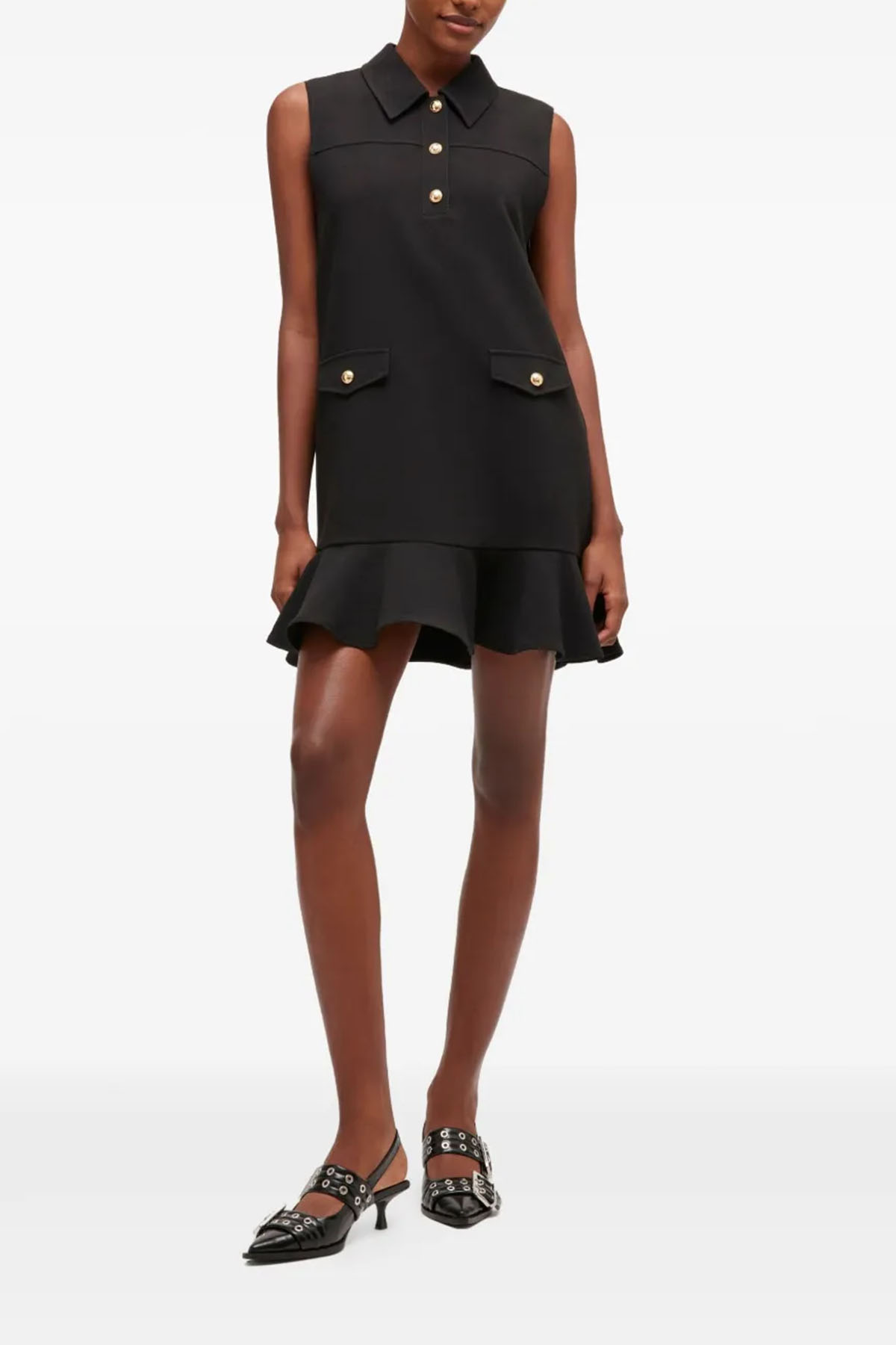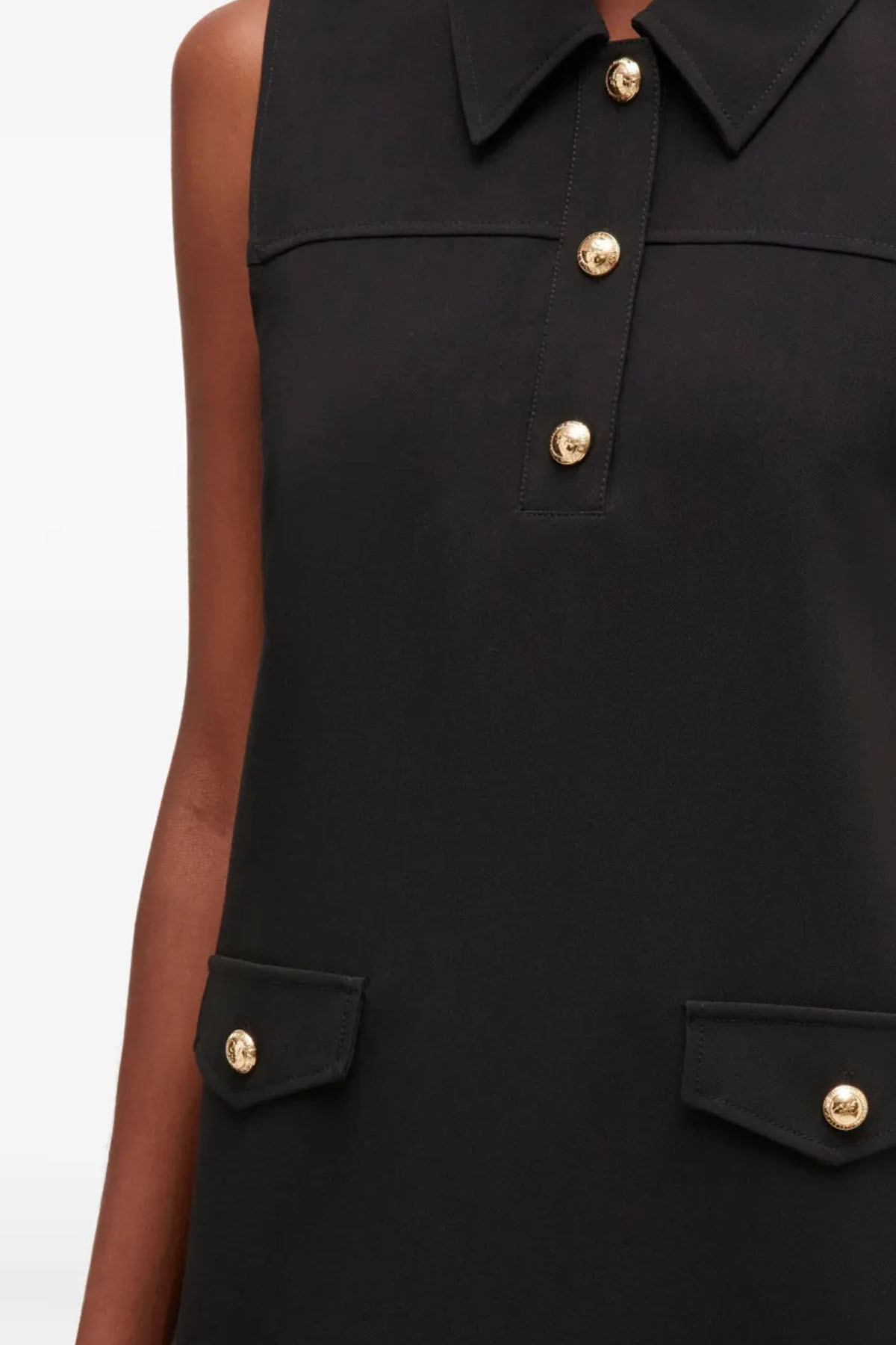 Modello con bottoni color oro, colore nero, colletto a punta, senza maniche, due tasche frontali, ruches, lunghezza sopra al ginocchio.