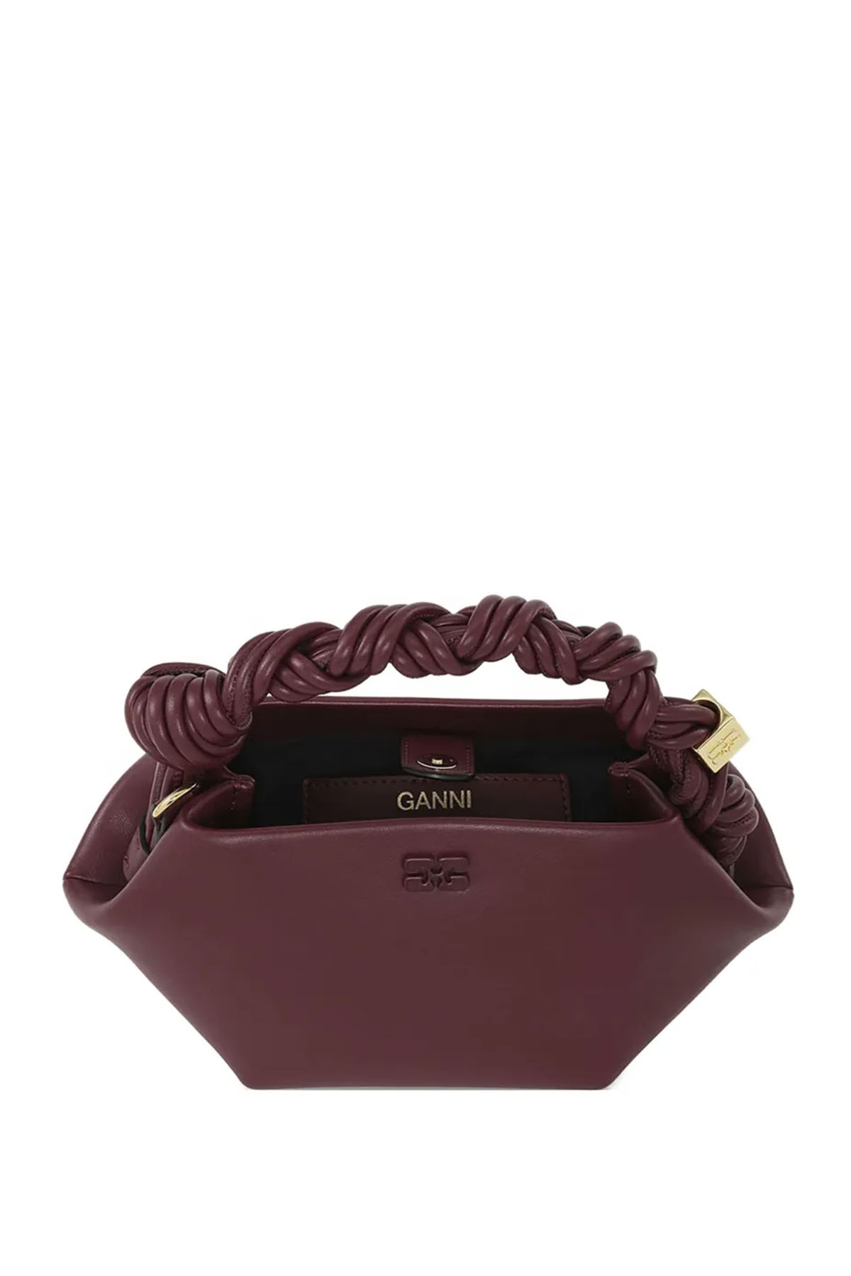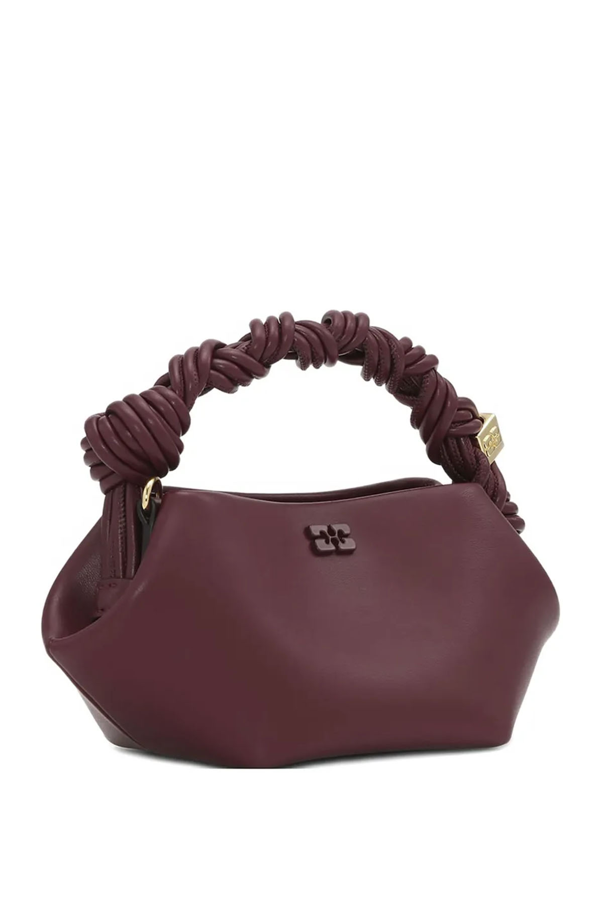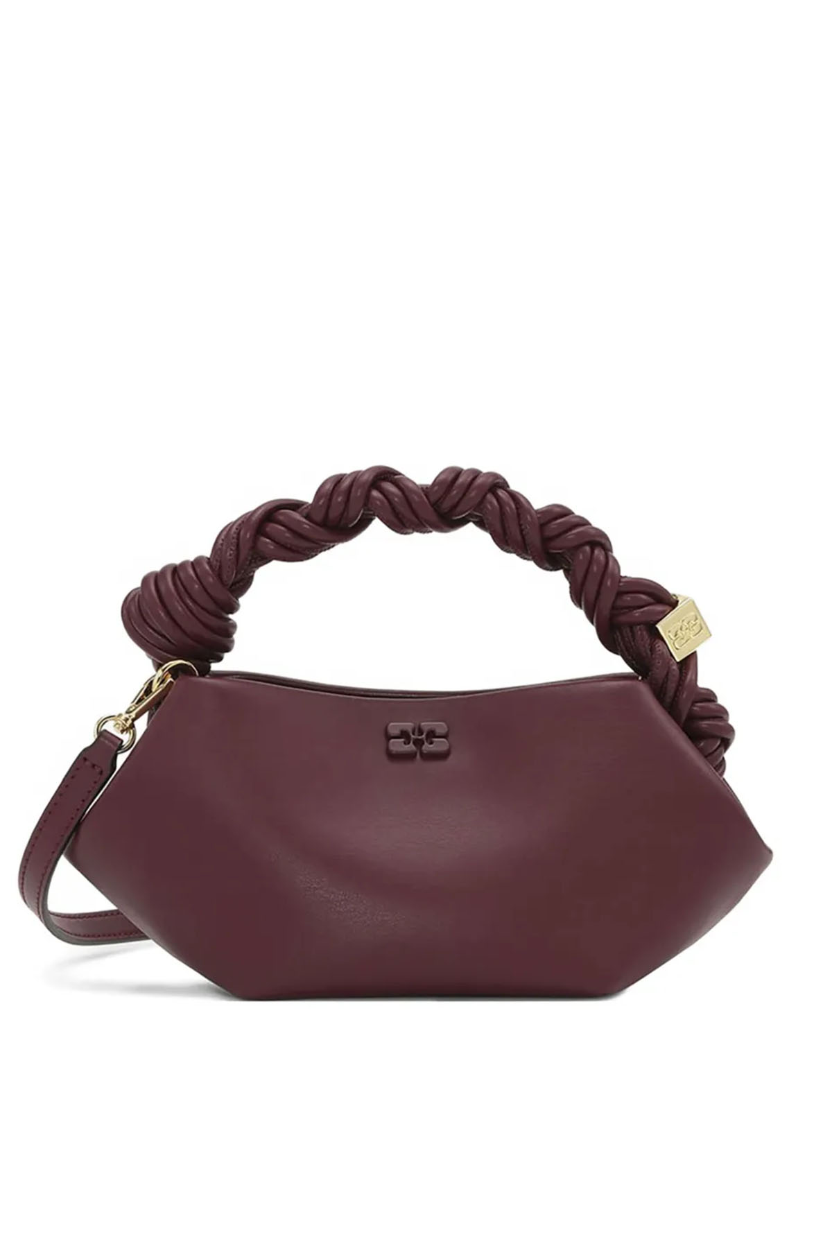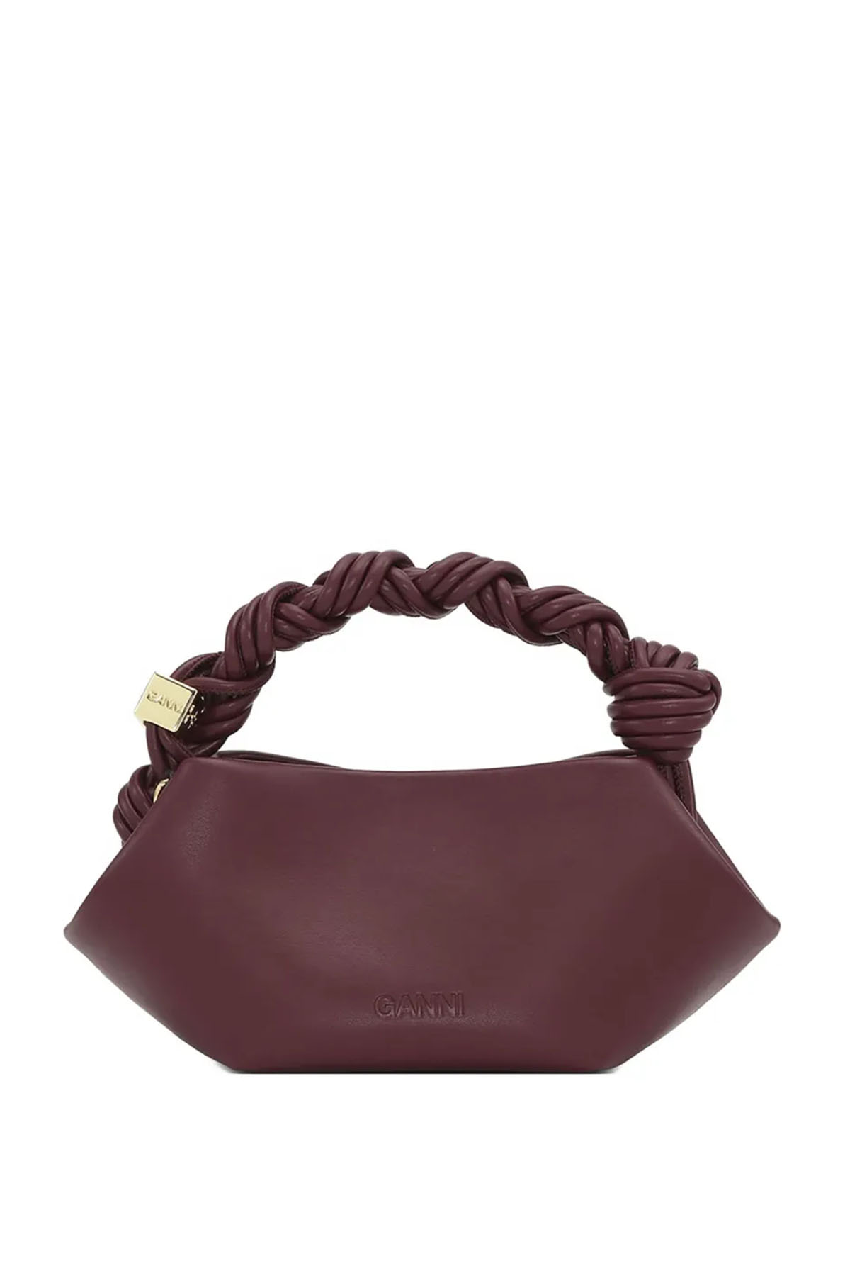 borsa bordeaux con chiusura magnetica, manico intrecciato, tracolla regolabile e rimovibile, scomparto unico.