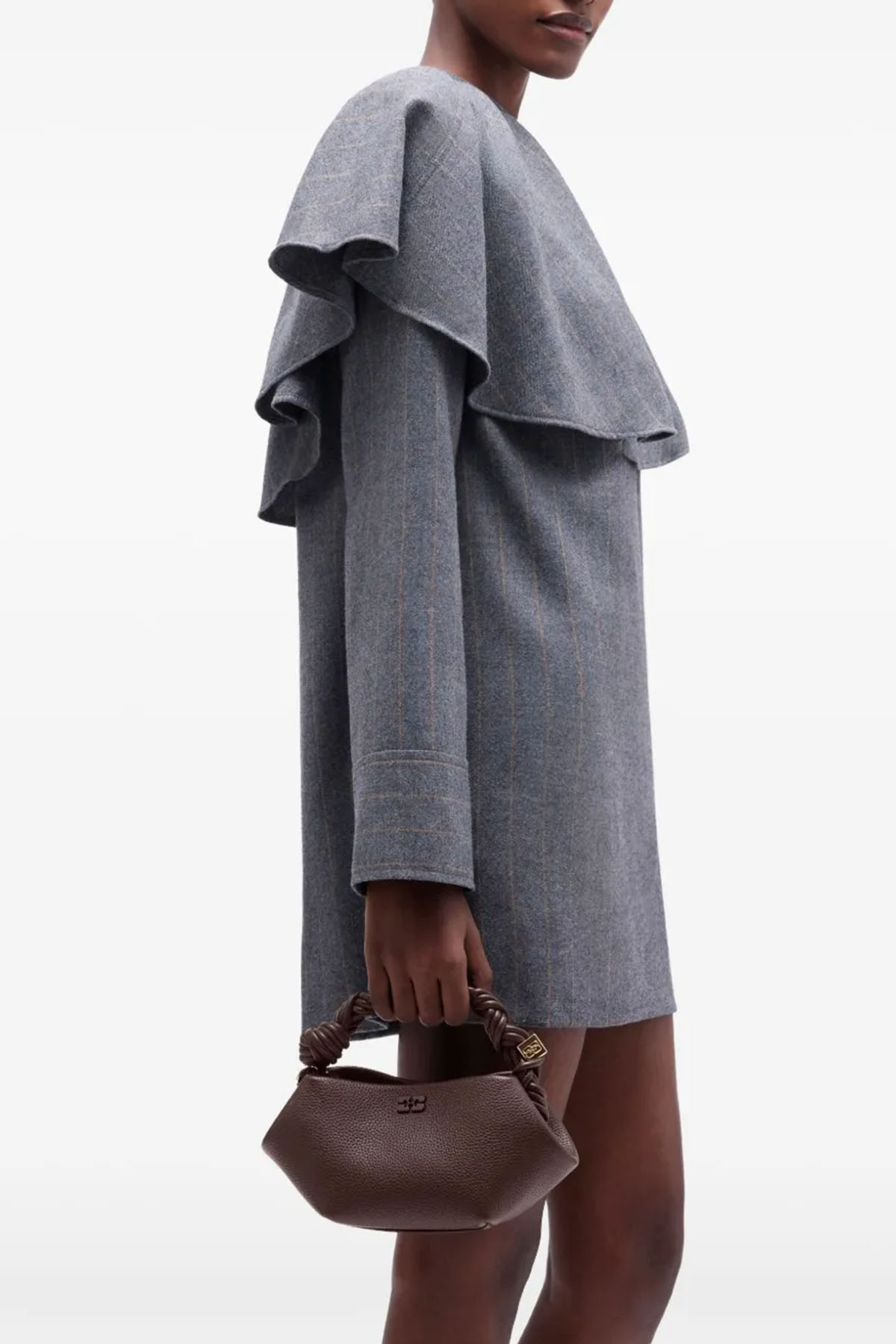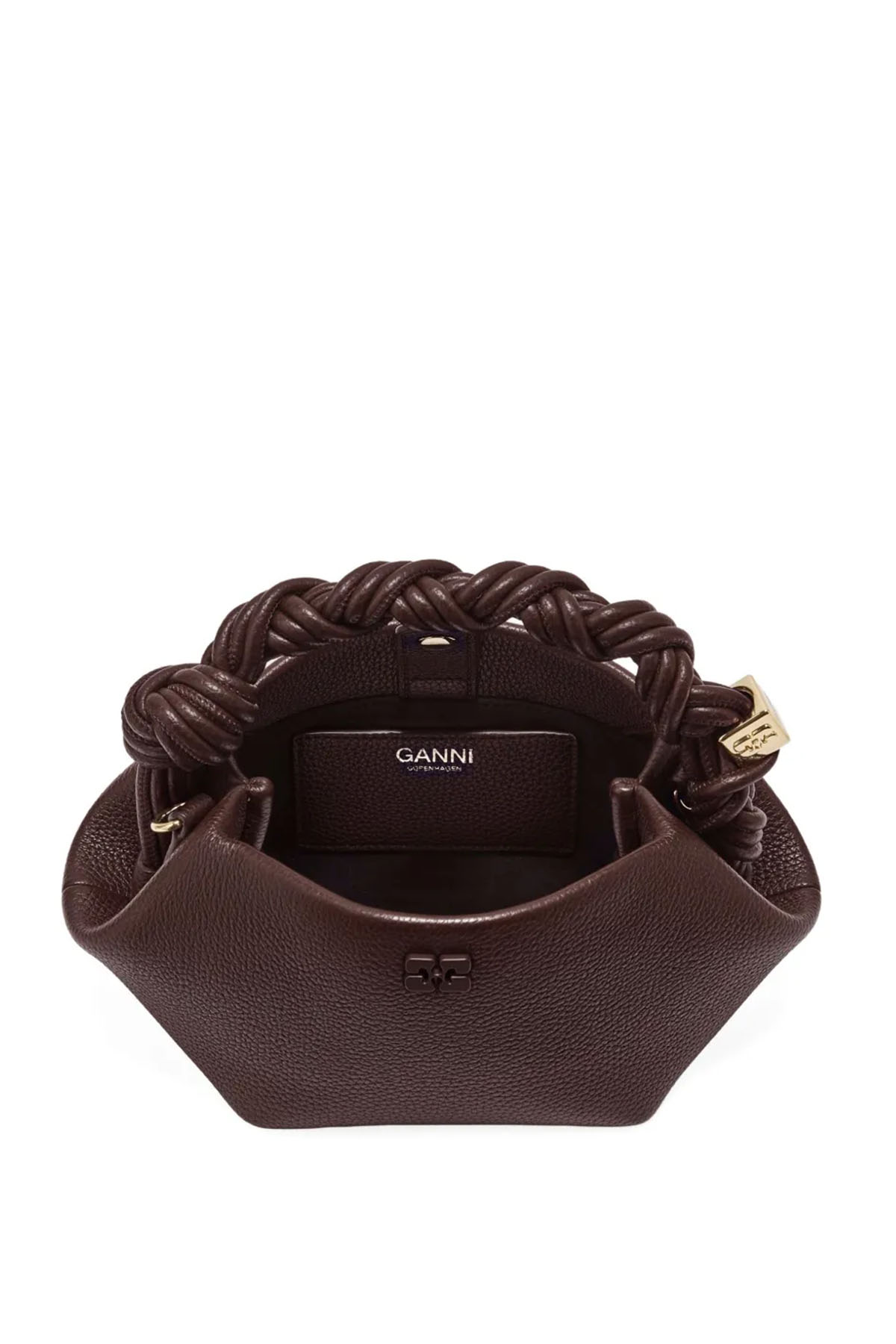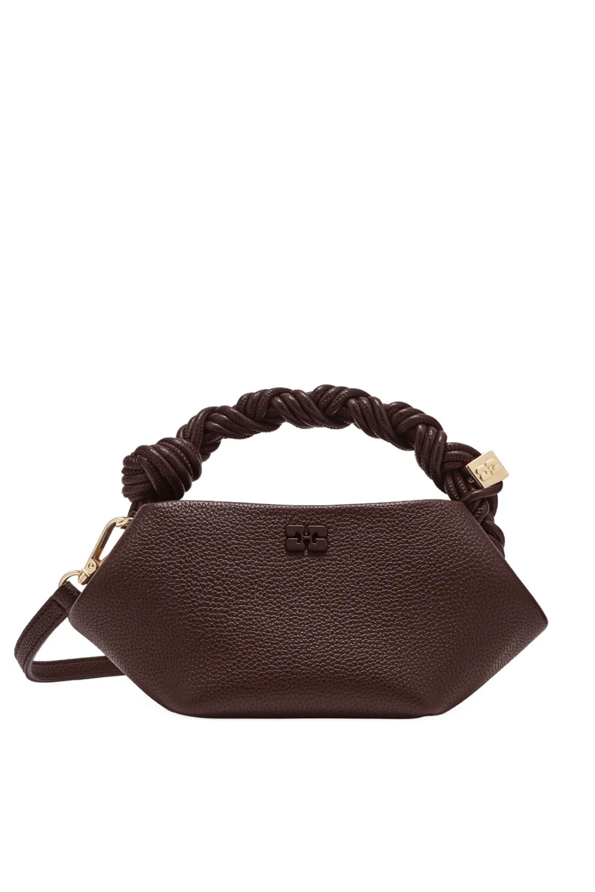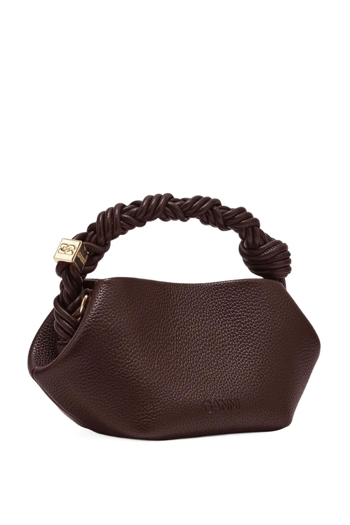 modello con Logo GANNI Butterfly tono su tono, Logo GANNI in rilievo sul retro della borsa, Manico superiore intrecciato con nodo intrecciato, Dadi in metallo con logo GANNI e Butterfly incisi, Tracolla regolabile e removibile, Chiusura magnetica interna, Un unico scomparto.