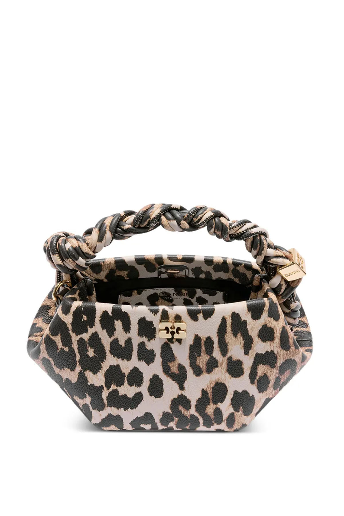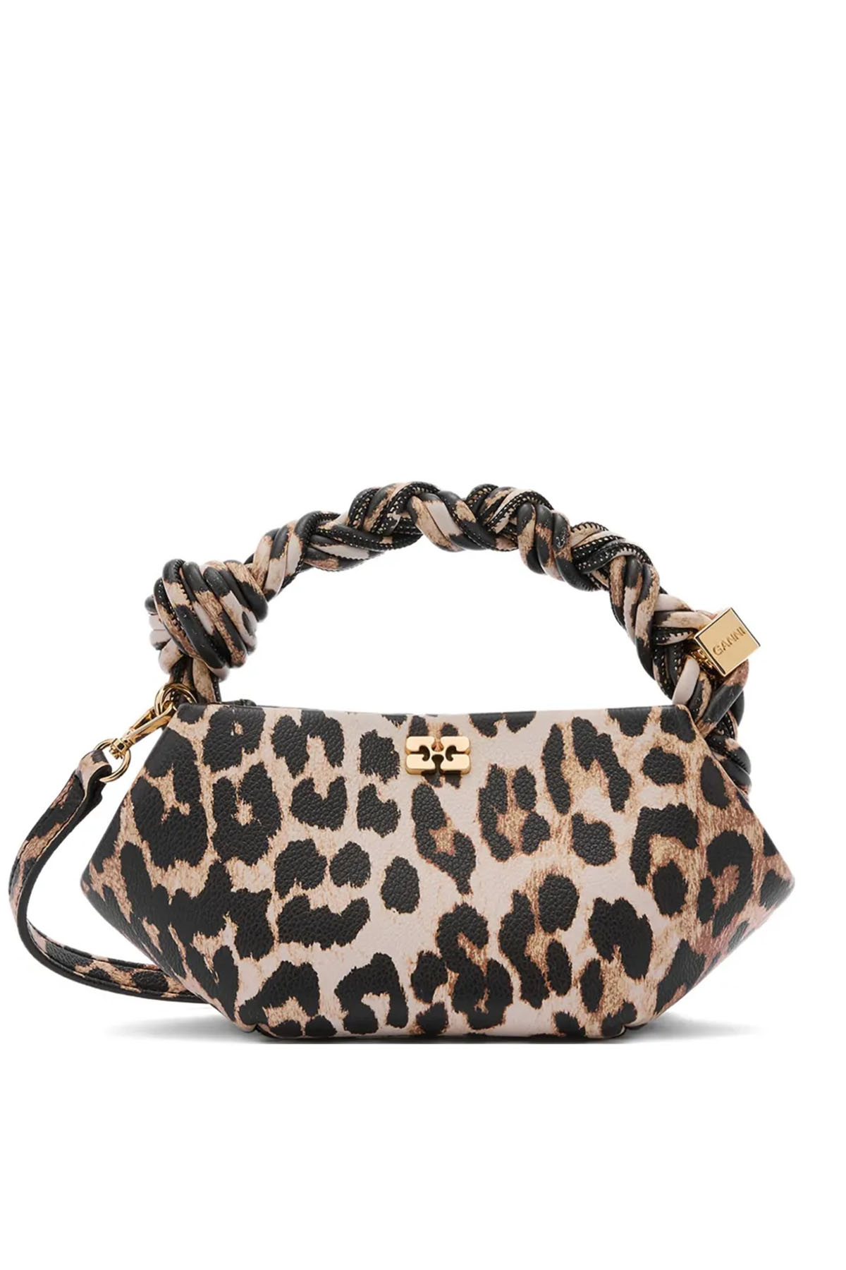 modello con stampa leopardata, manici con design attorcigliato, tracolla regolabile e rimovibile, dettagli color oro, chiusura superiore magnetica, scomparto unico.