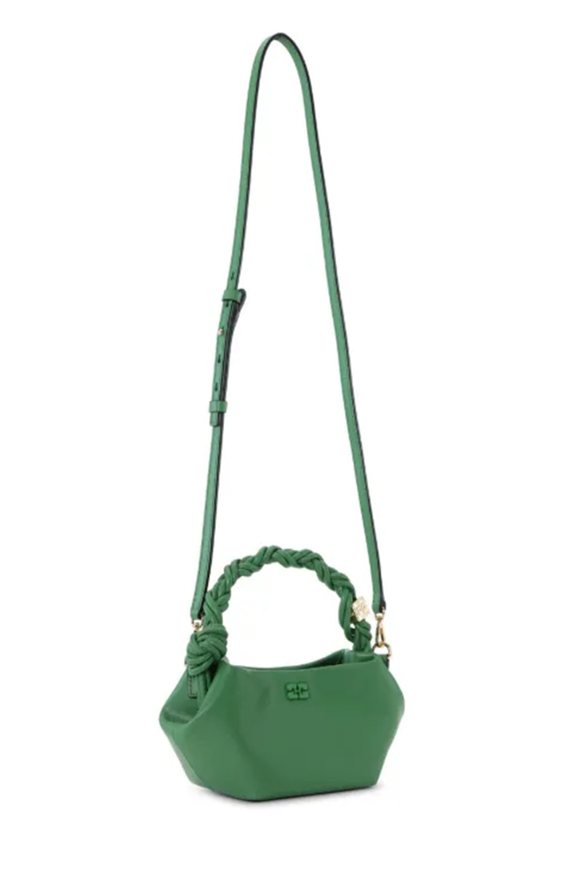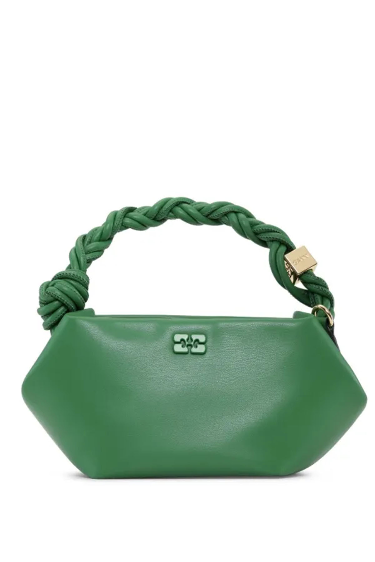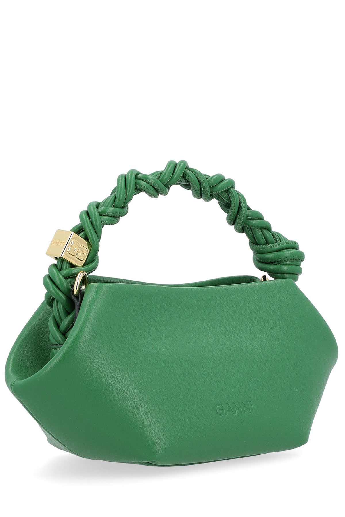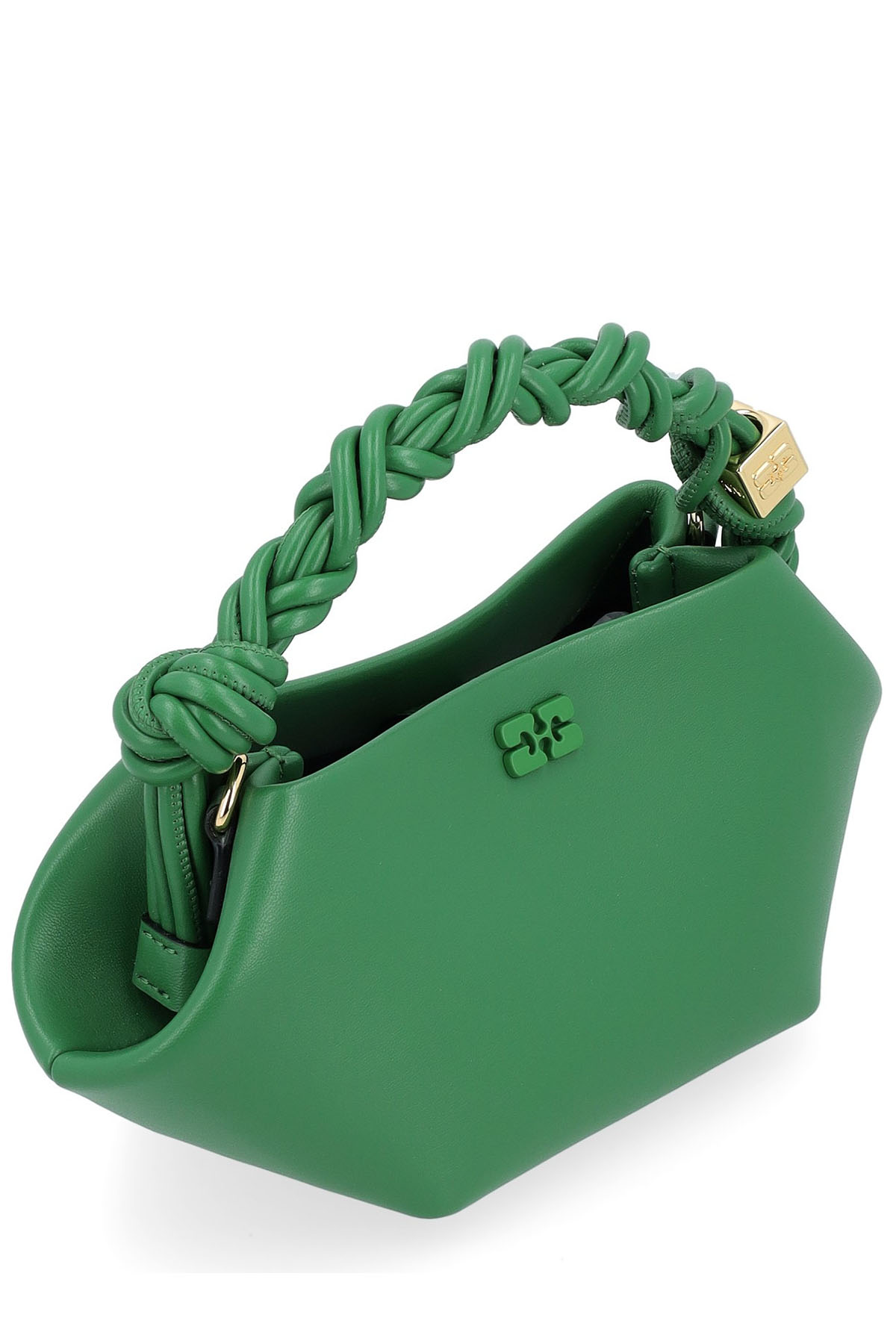 Questa borsa presenta un logo GANNI Butterfly metallico tono su tono, un manico ritorto con nodo intrecciato e un dado metallico dorato con il logo GANNI Butterfly inciso, ha una chiusura magnetica interna, una tasca piatta per carte di credito all'interno e una tracolla regolabile e rimovibile per indossarla a tracolla.