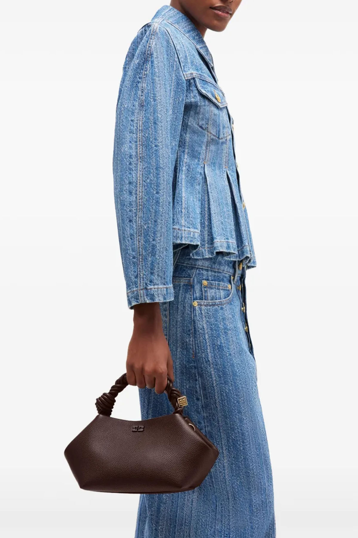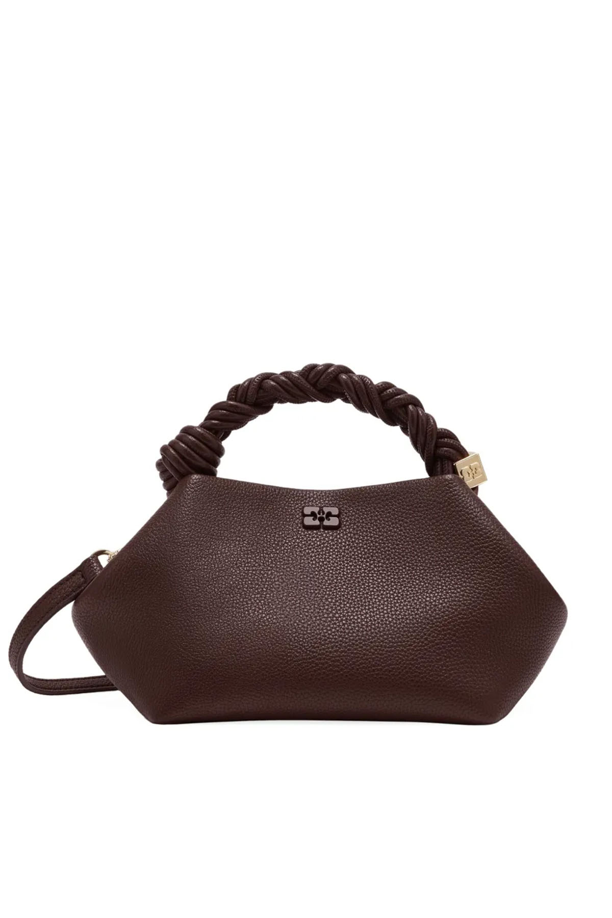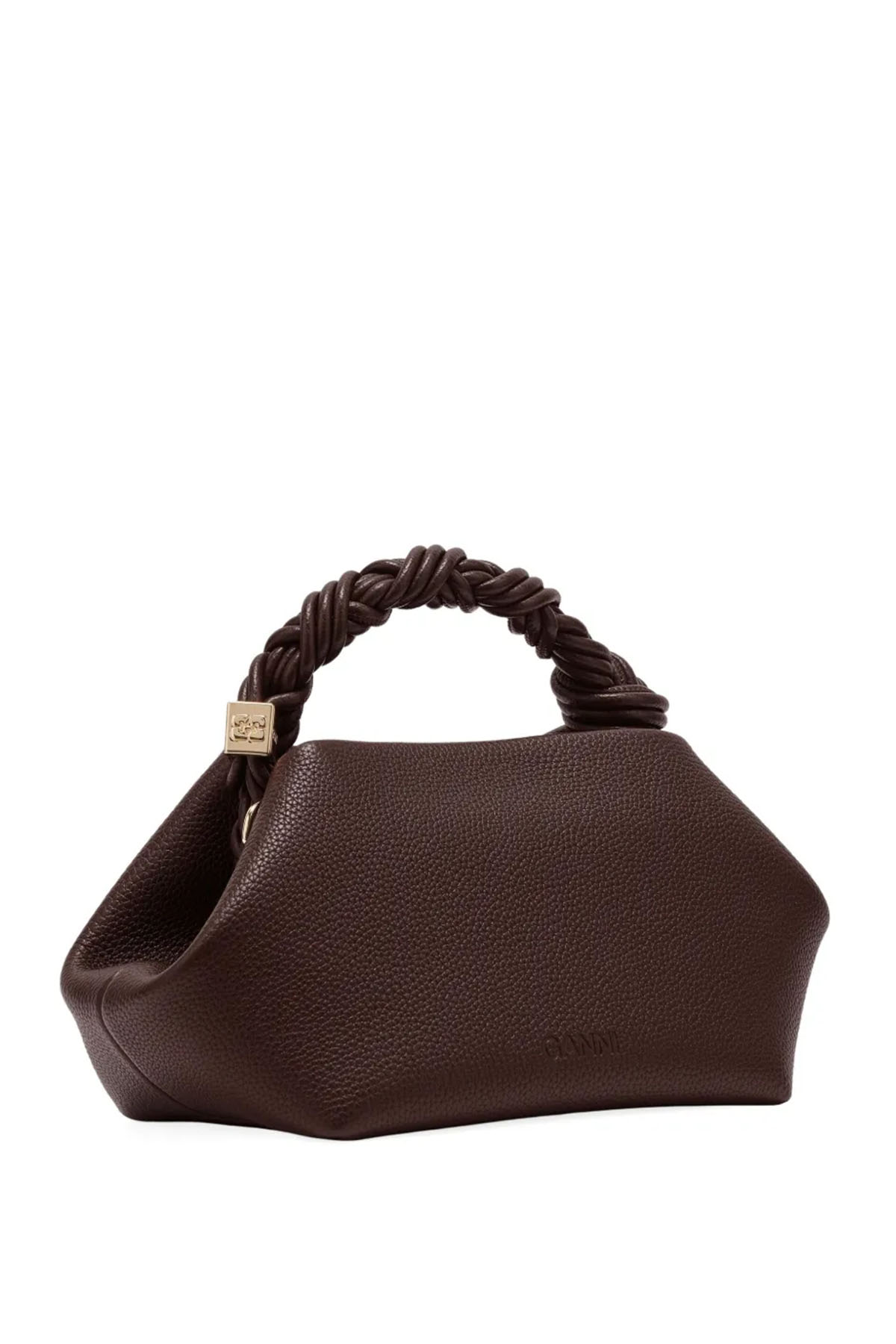 borsa marrone con manico attorcigliato, design strutturato, manico attorcigliato, tracolla regolabile e rimovibile, pelle martellata.