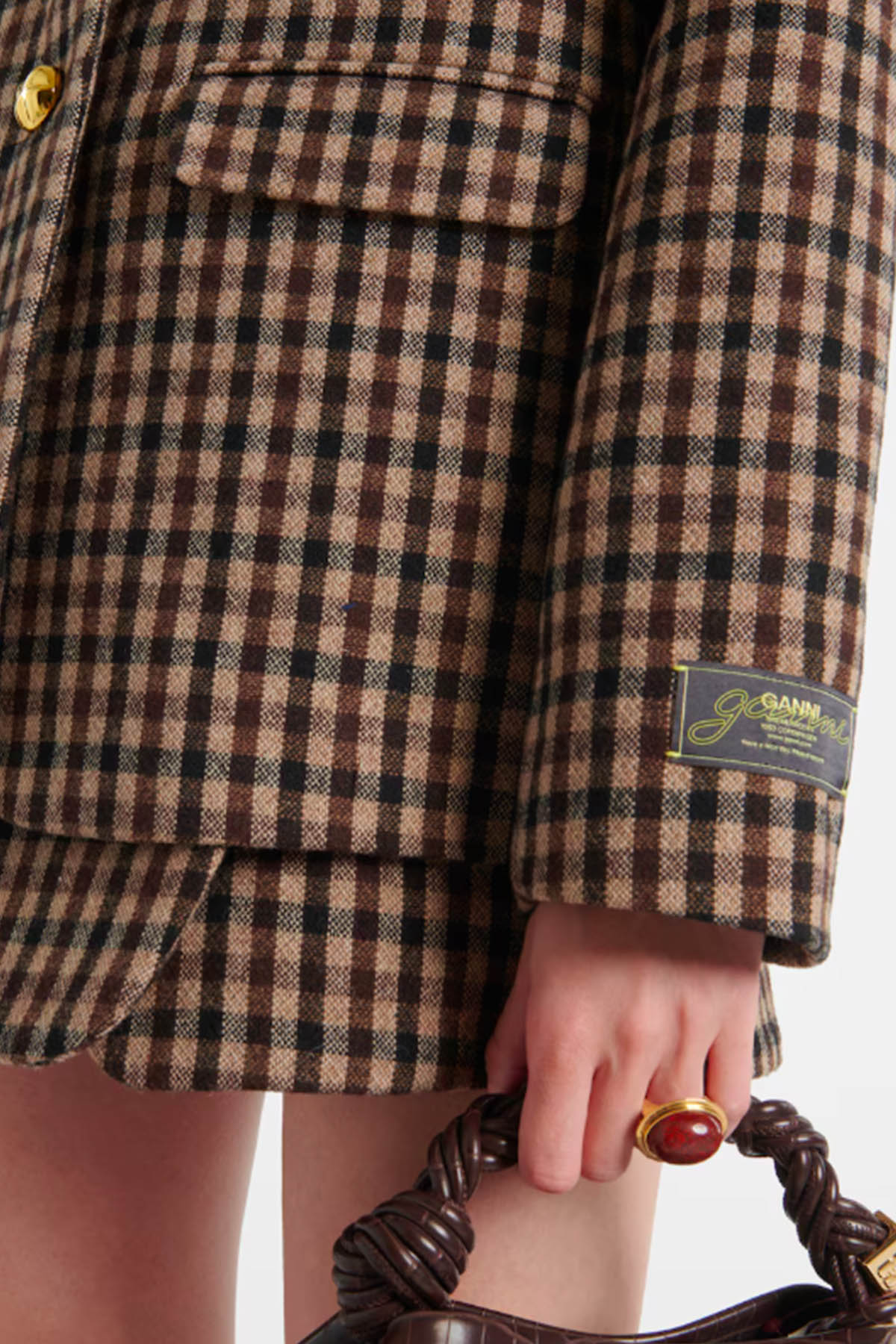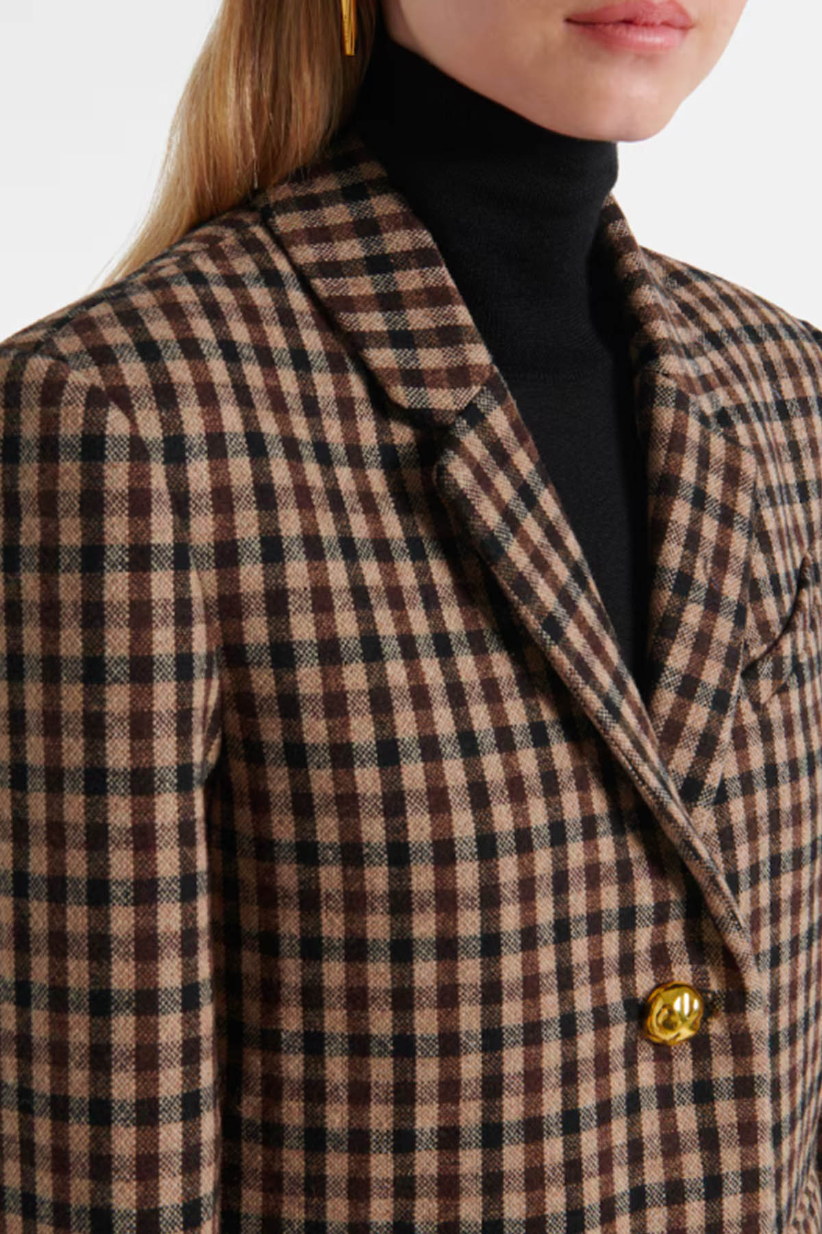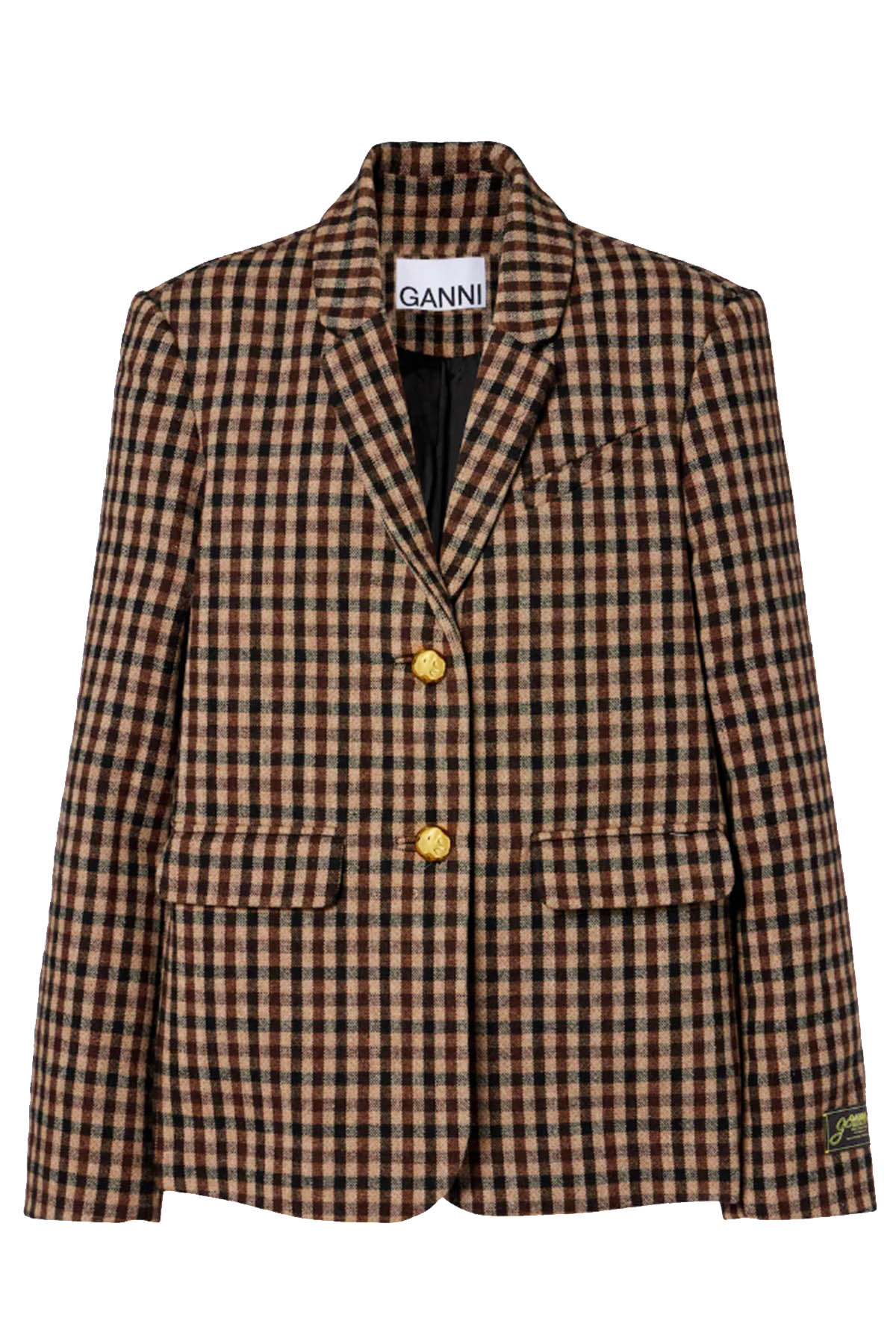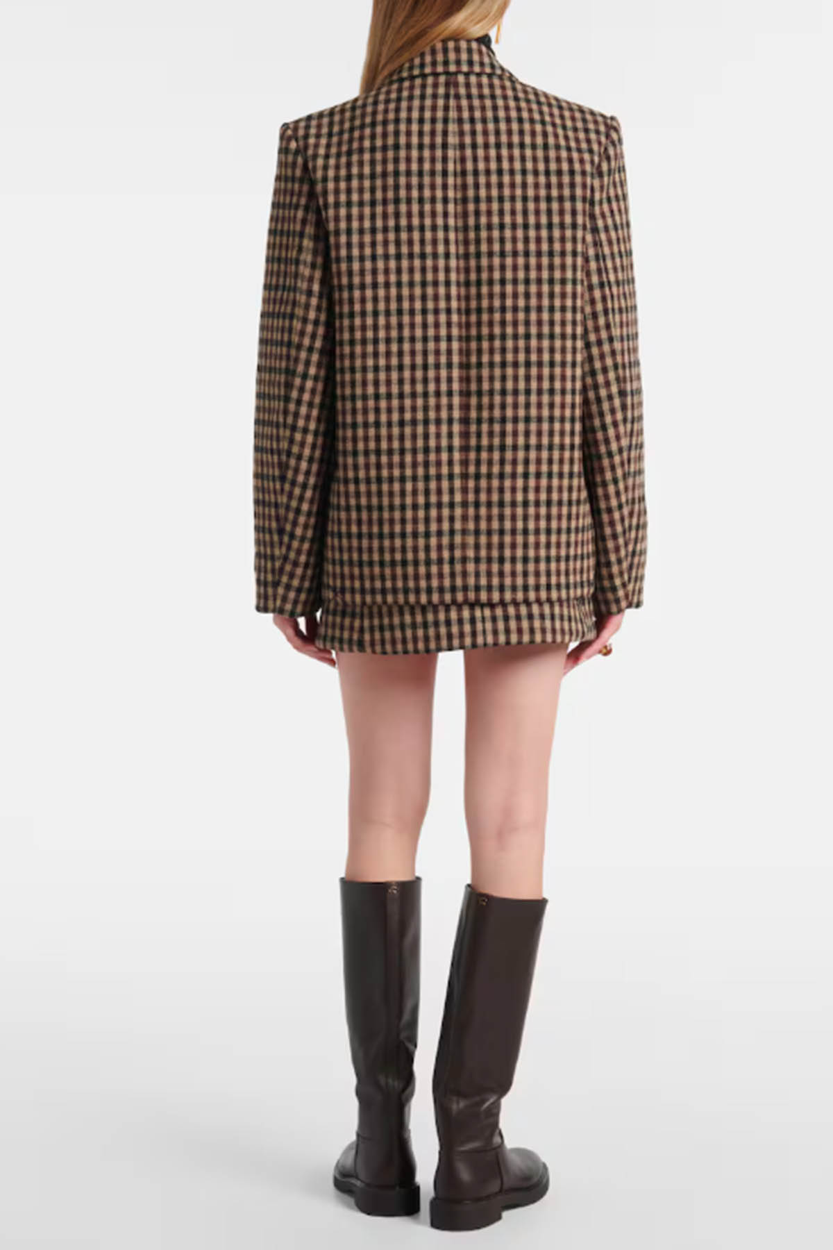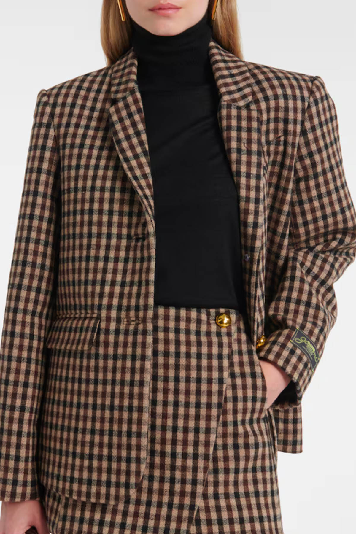 Modello monopetto, revers, manica lunga, abbottonatura frontale con bottoni oro, tasche con patta, spalle imbottite.