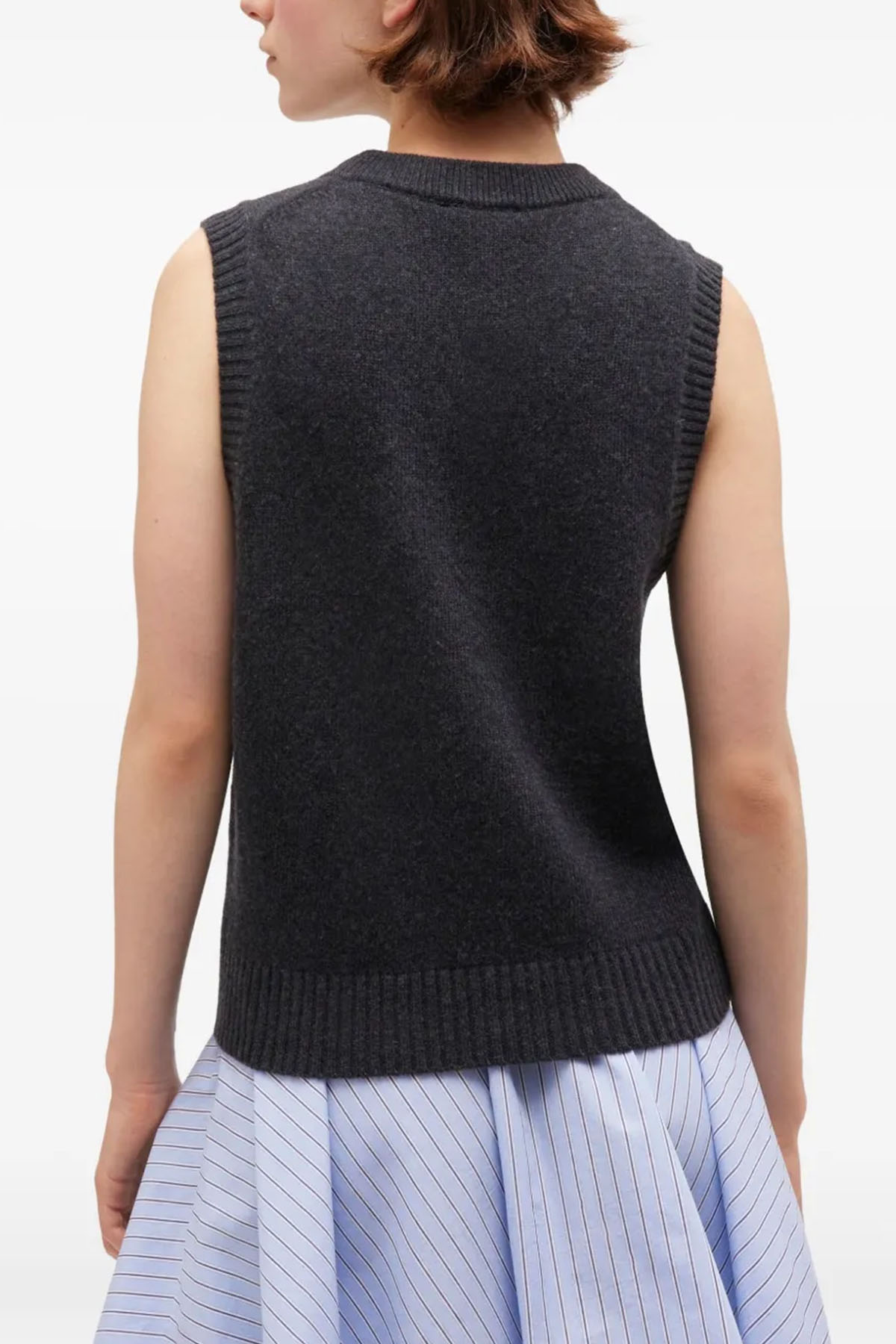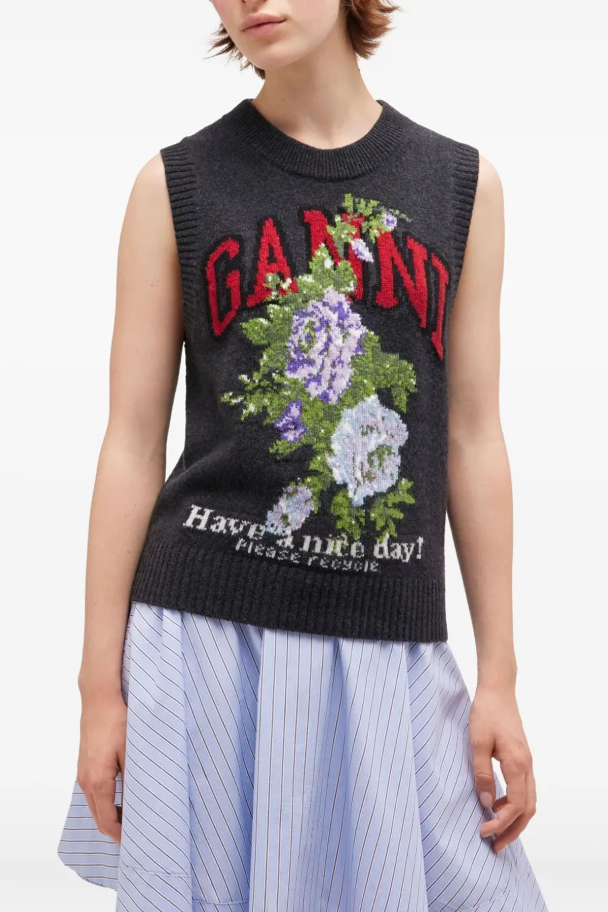 Modello girocollo, senza maniche, dettaglio fiori, logo frontale.