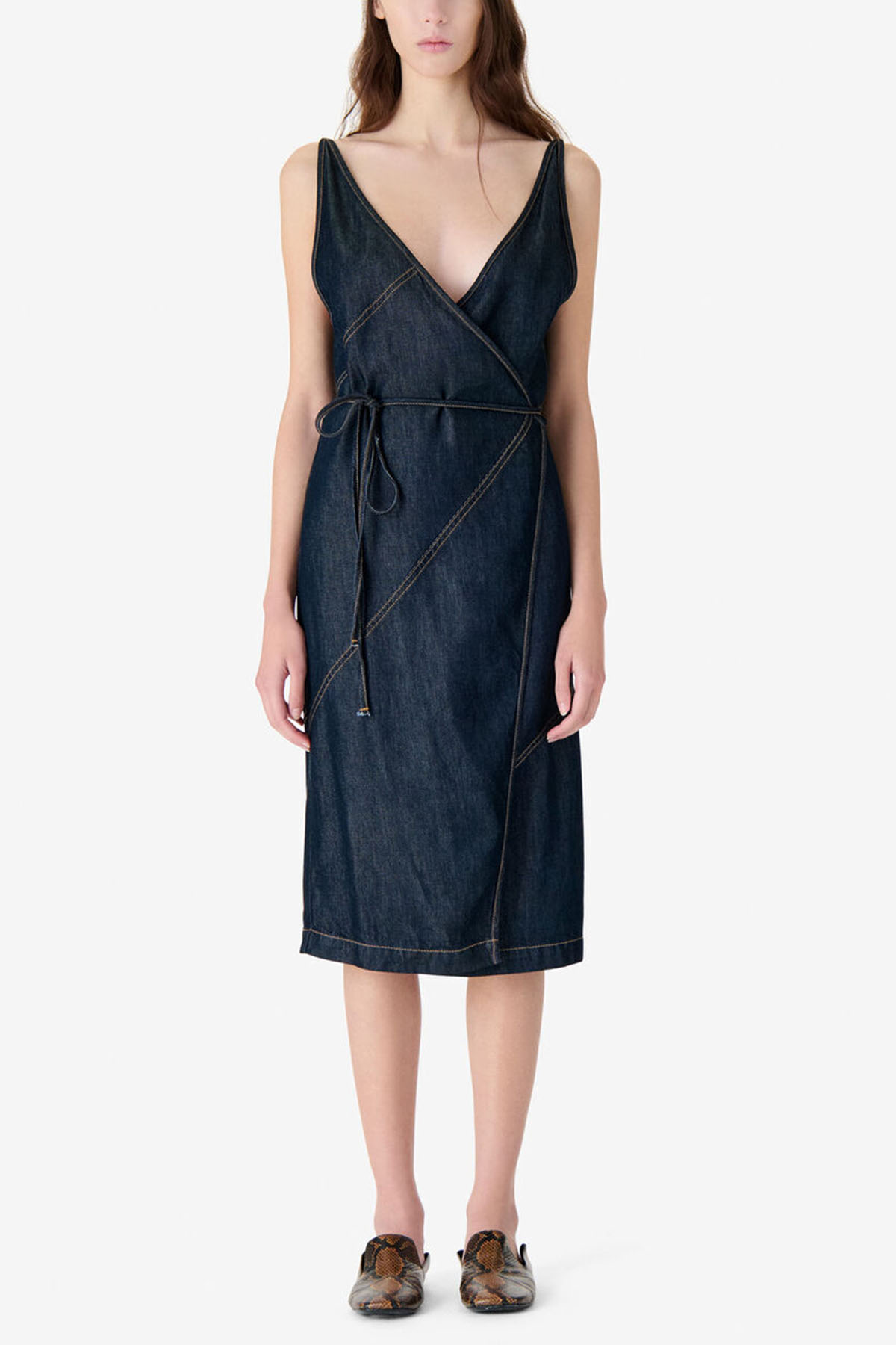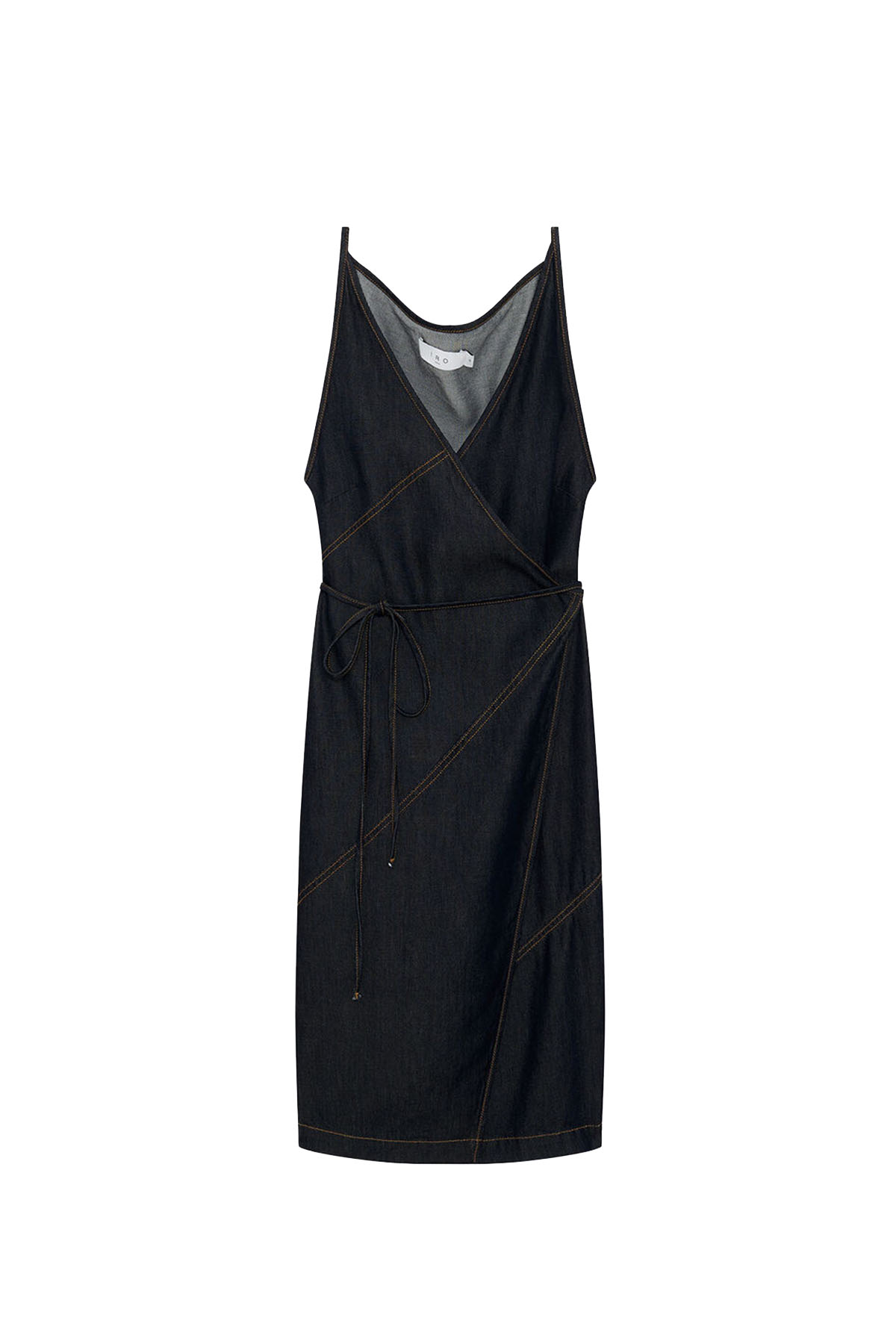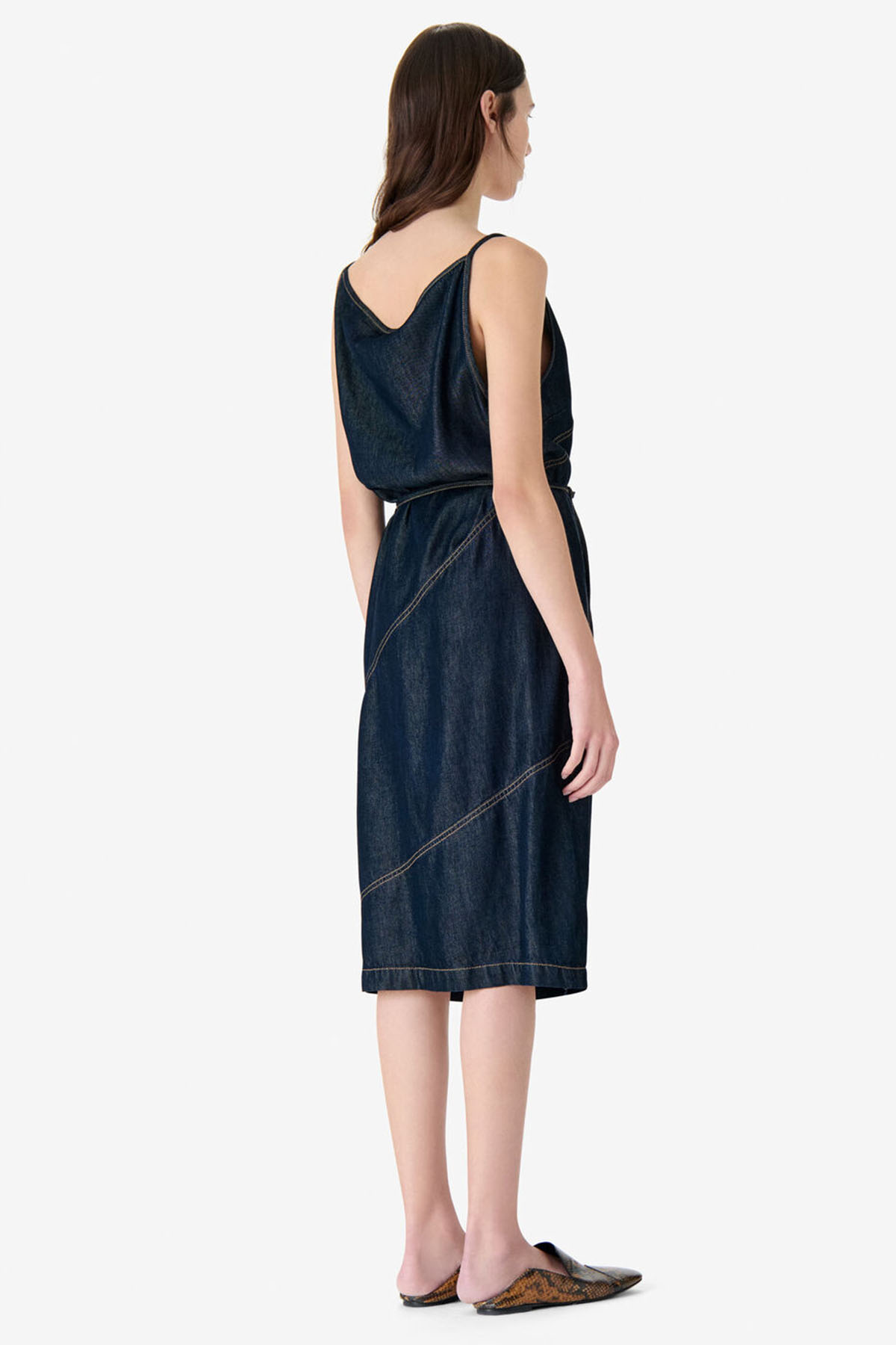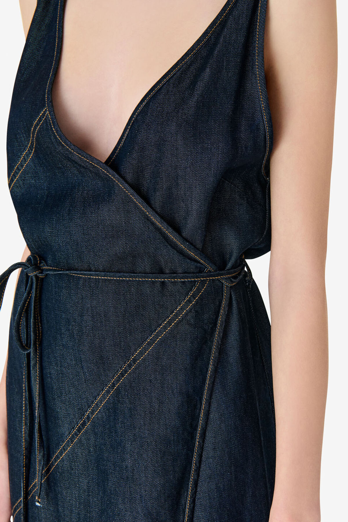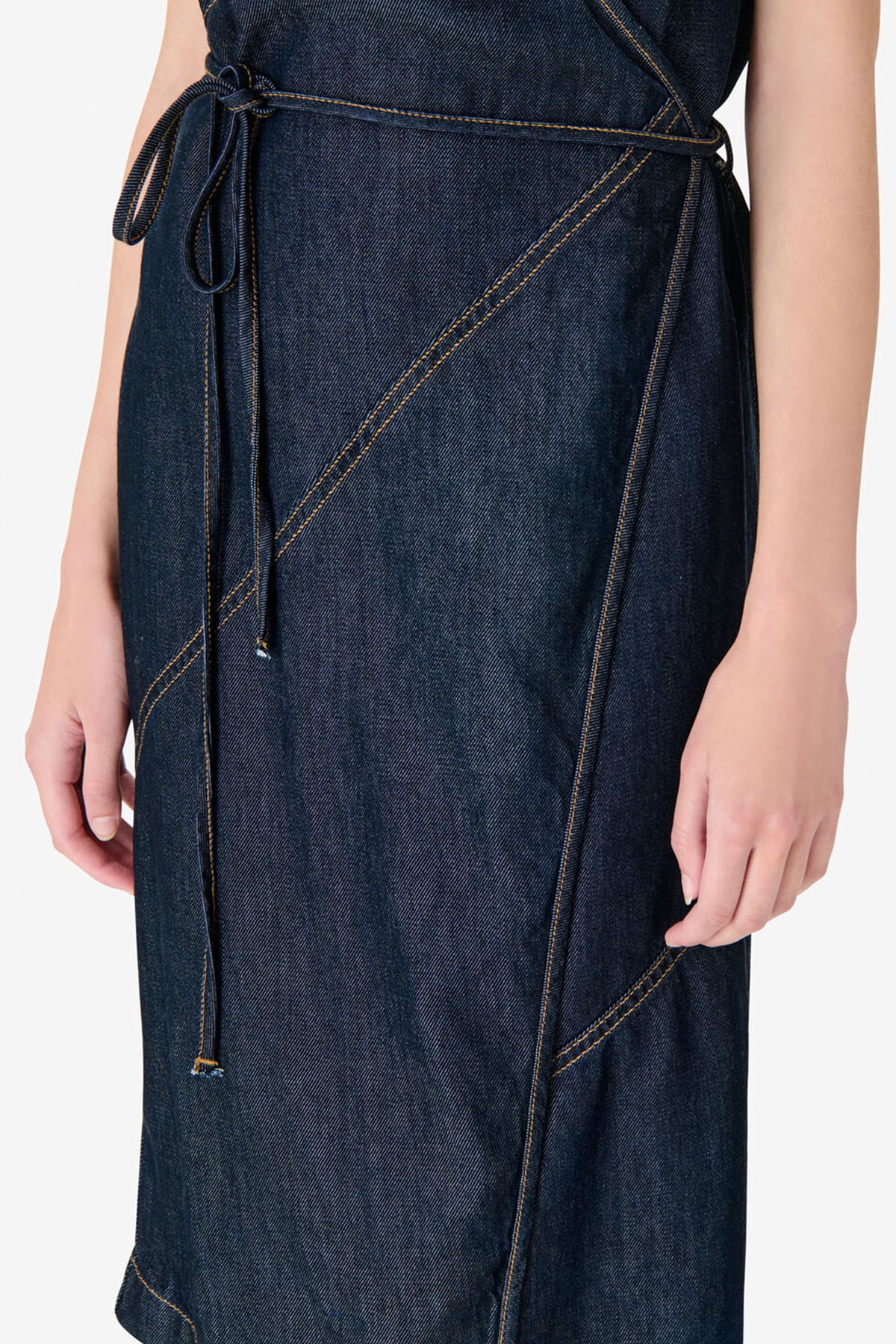 Abito lungo in denim satinato, Scollo a portafoglio incrociato, Spalline sottili, Cintura in vita, Intagli grafici, Cuciture a contrasto a vista.