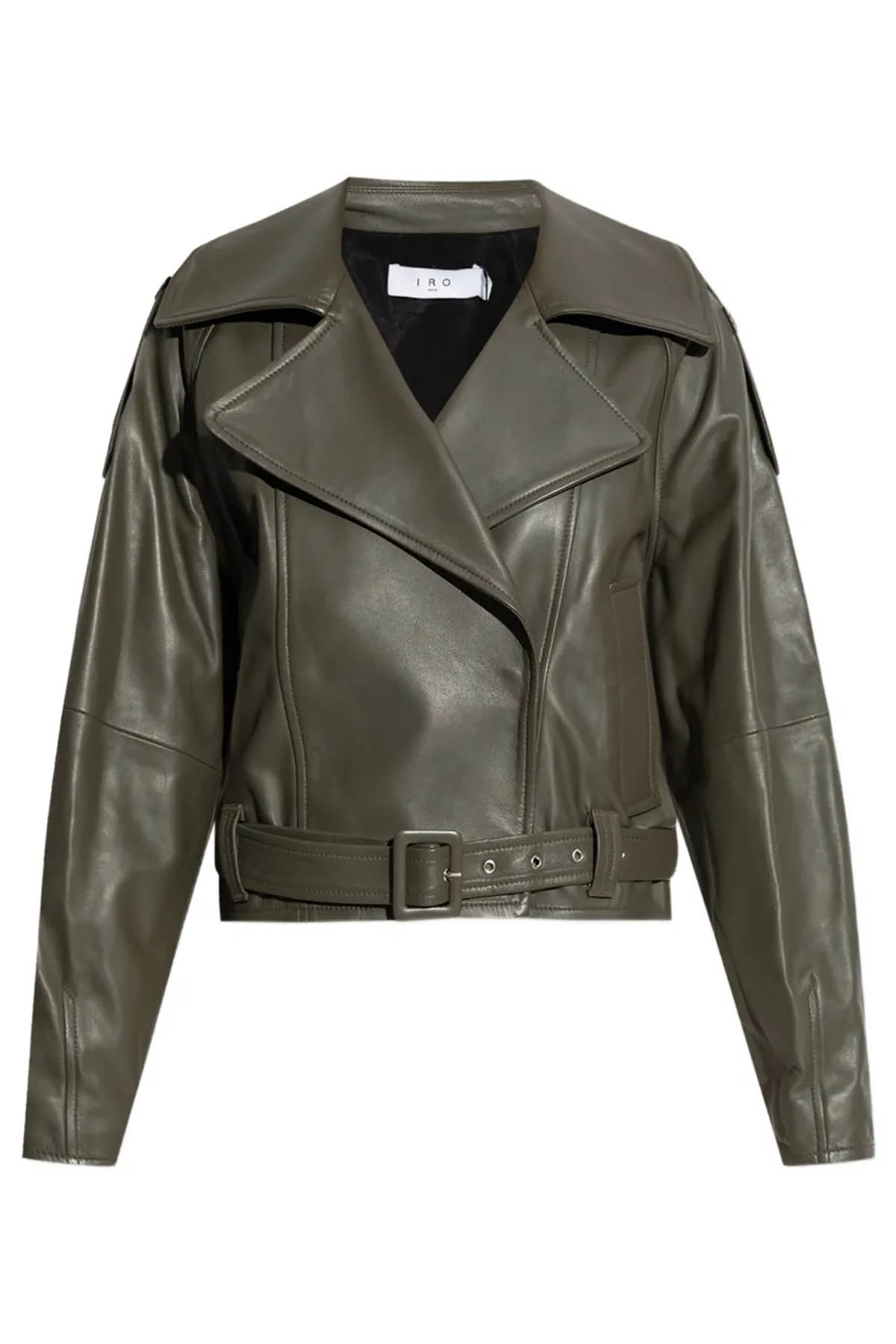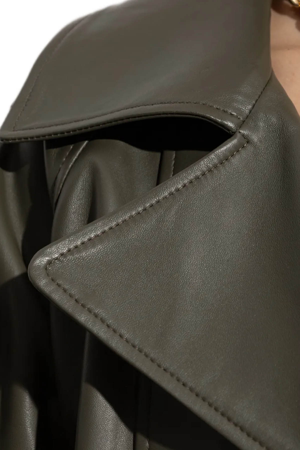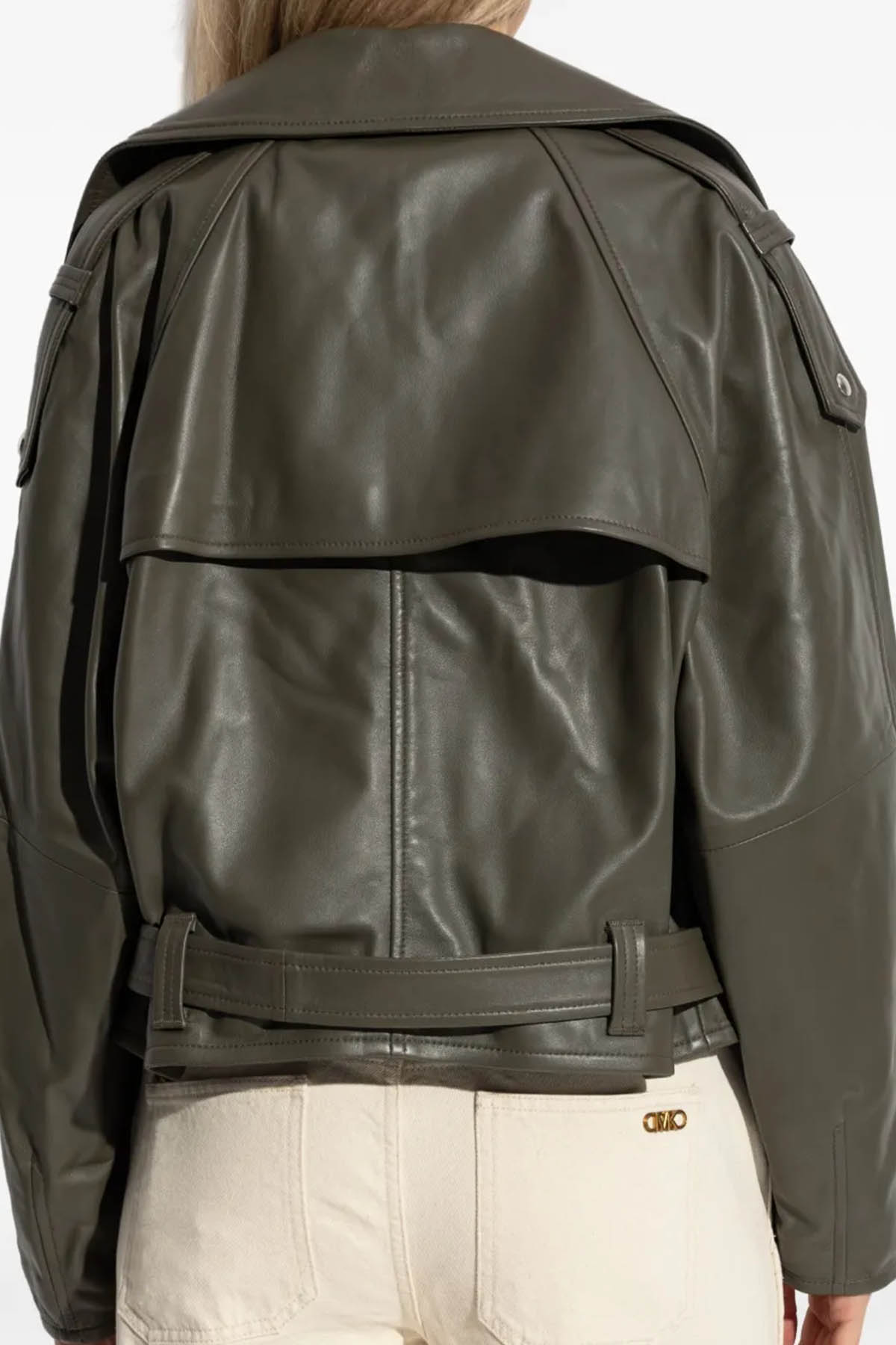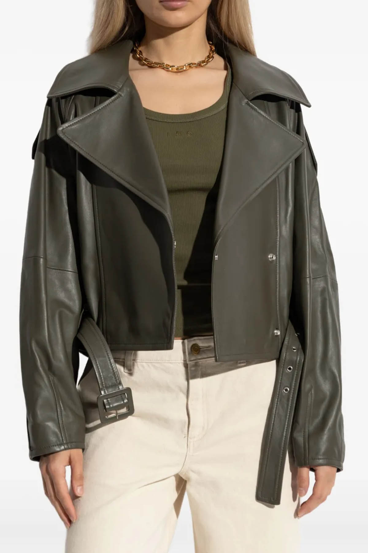 Modello in pelle, chiusura con bottoni a pressione, modello con cintura, due tasche, taglio spalla basso.