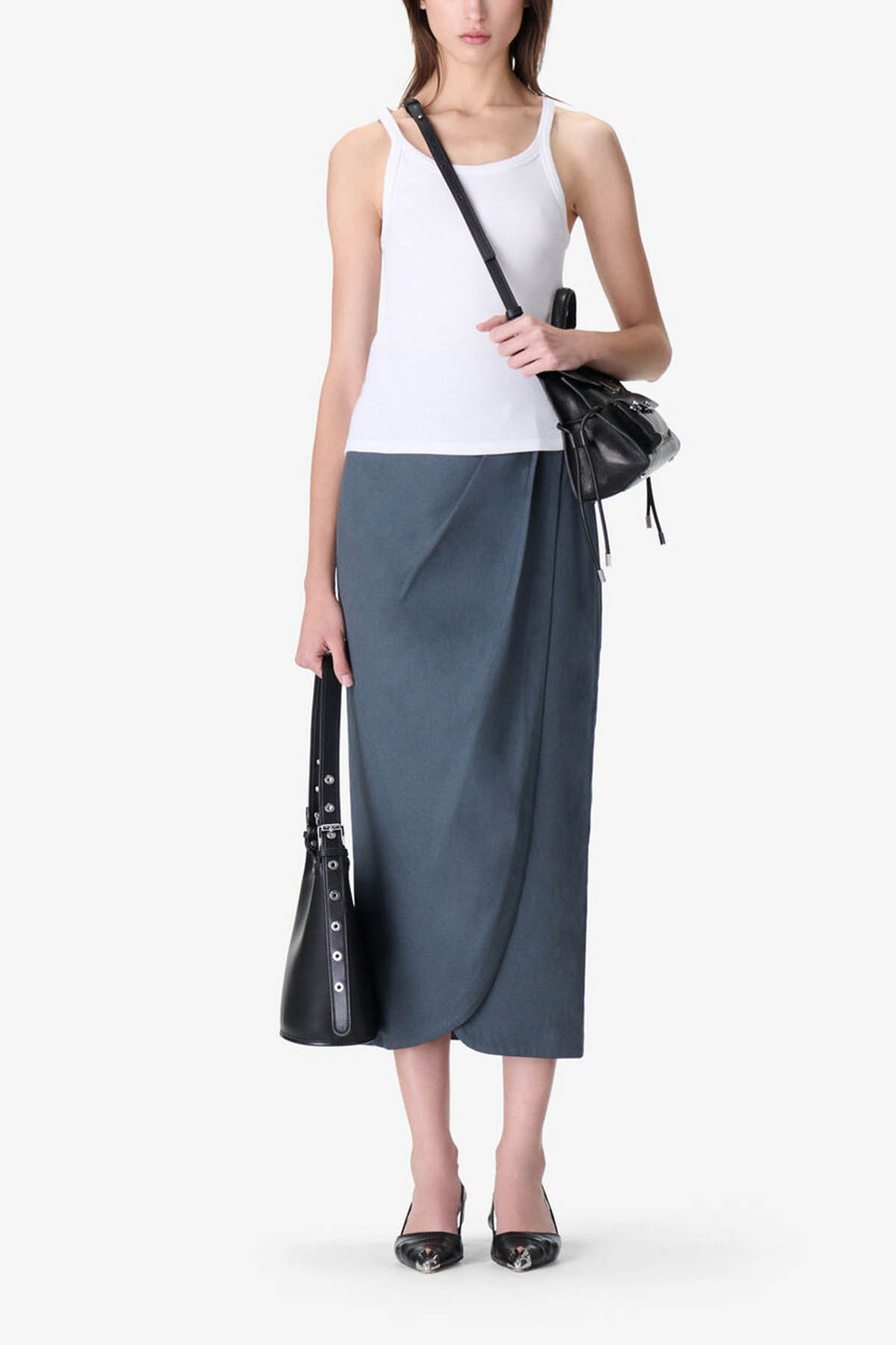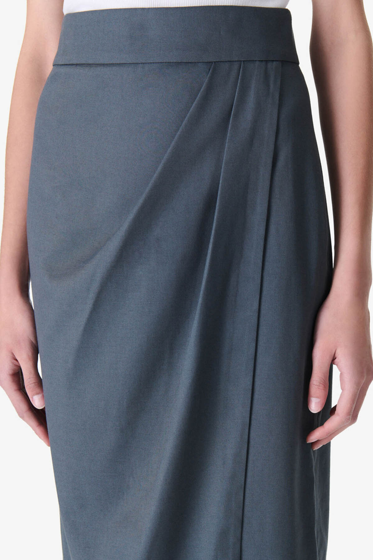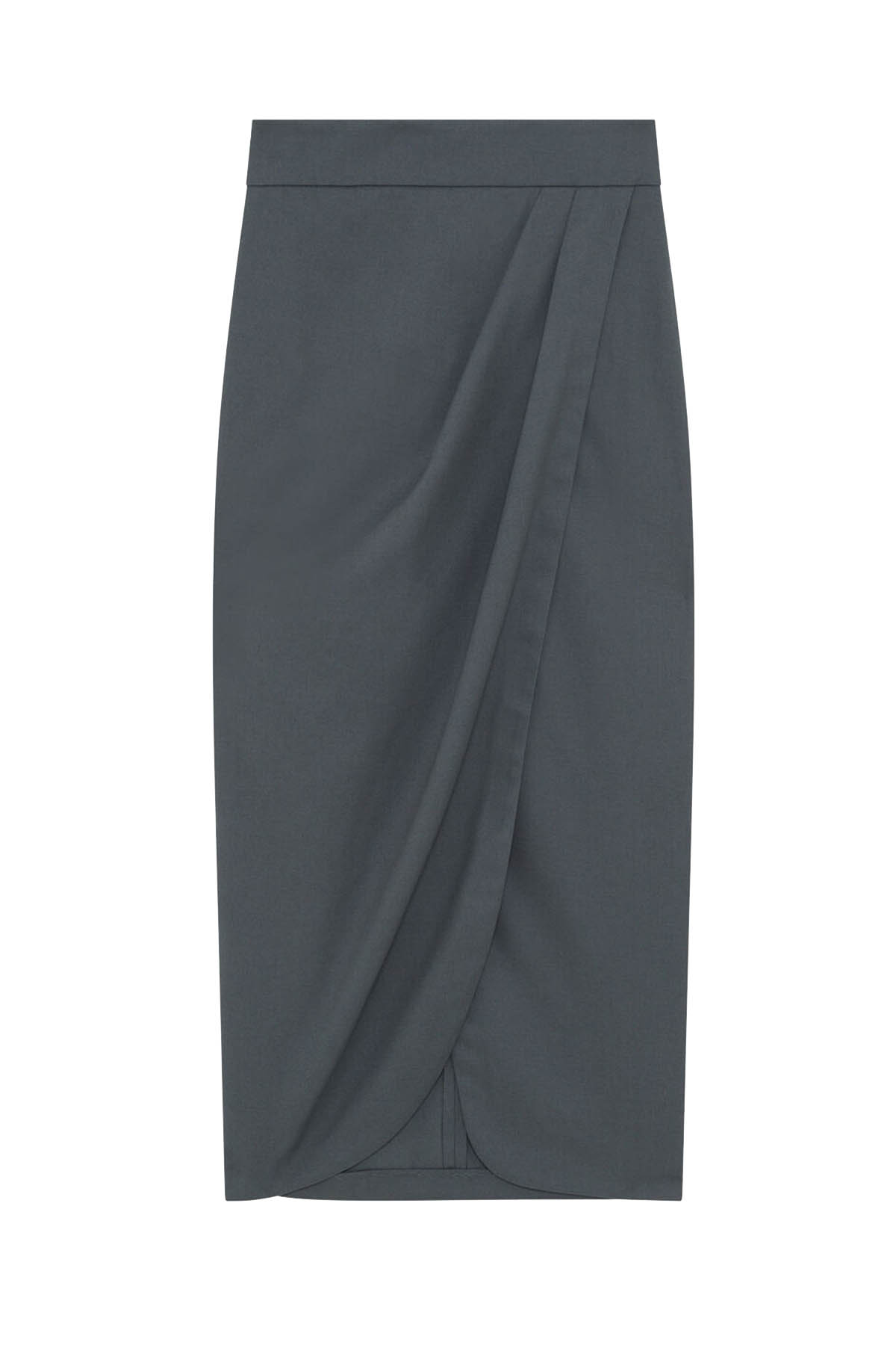 Modello a portafoglio, spacco, chiusura laterale con zip nascosta, dettaglio arricciato sul davanti, design di media lunghezza.