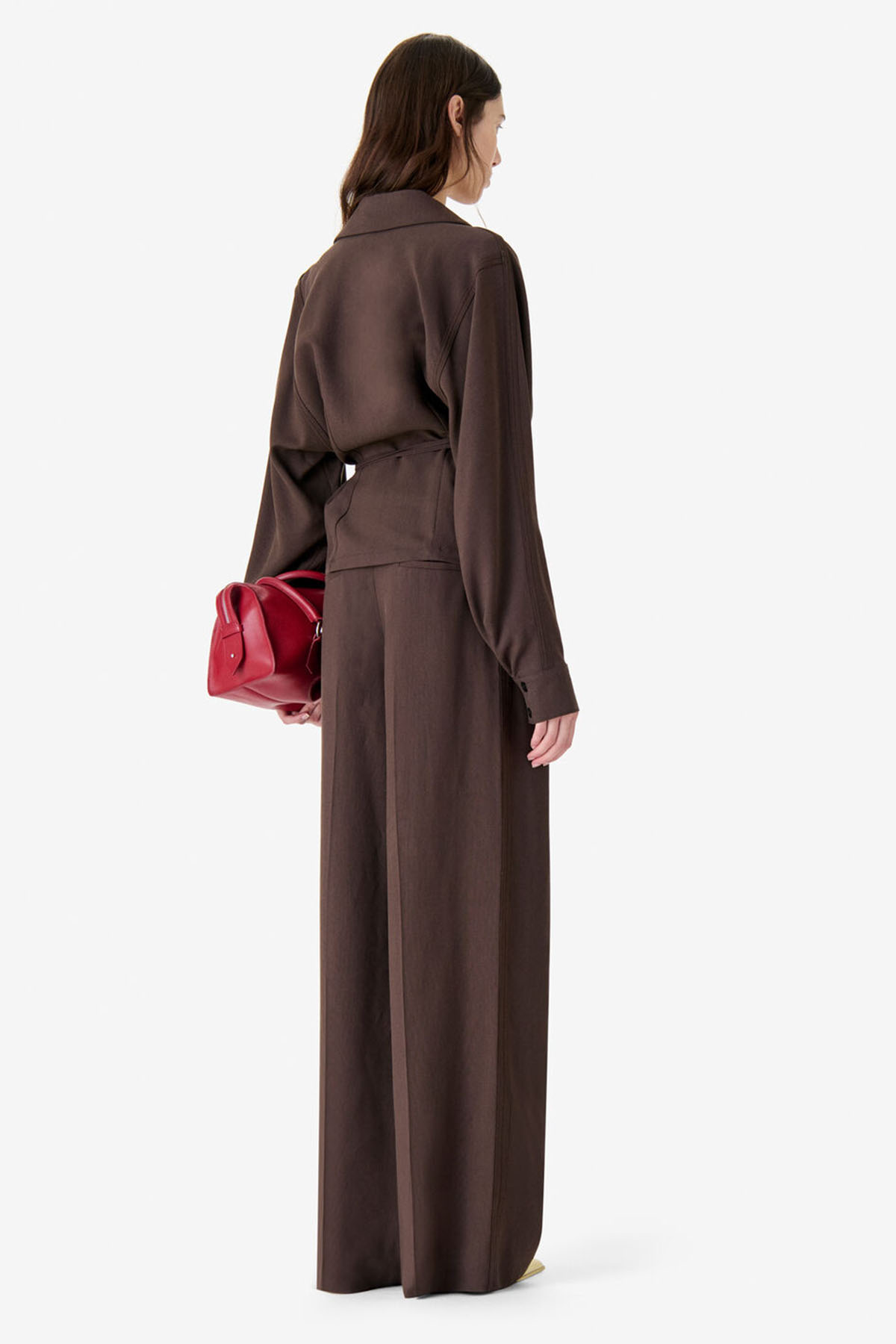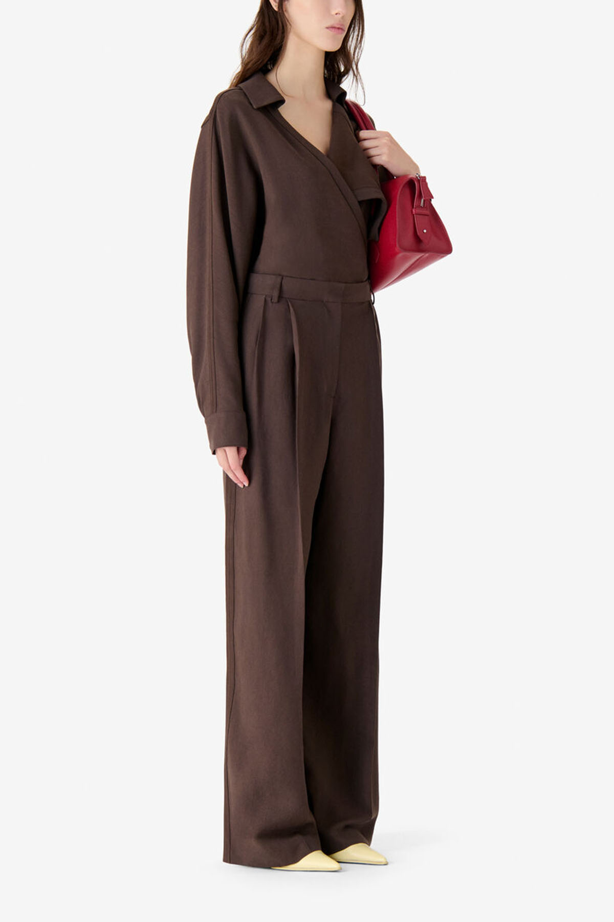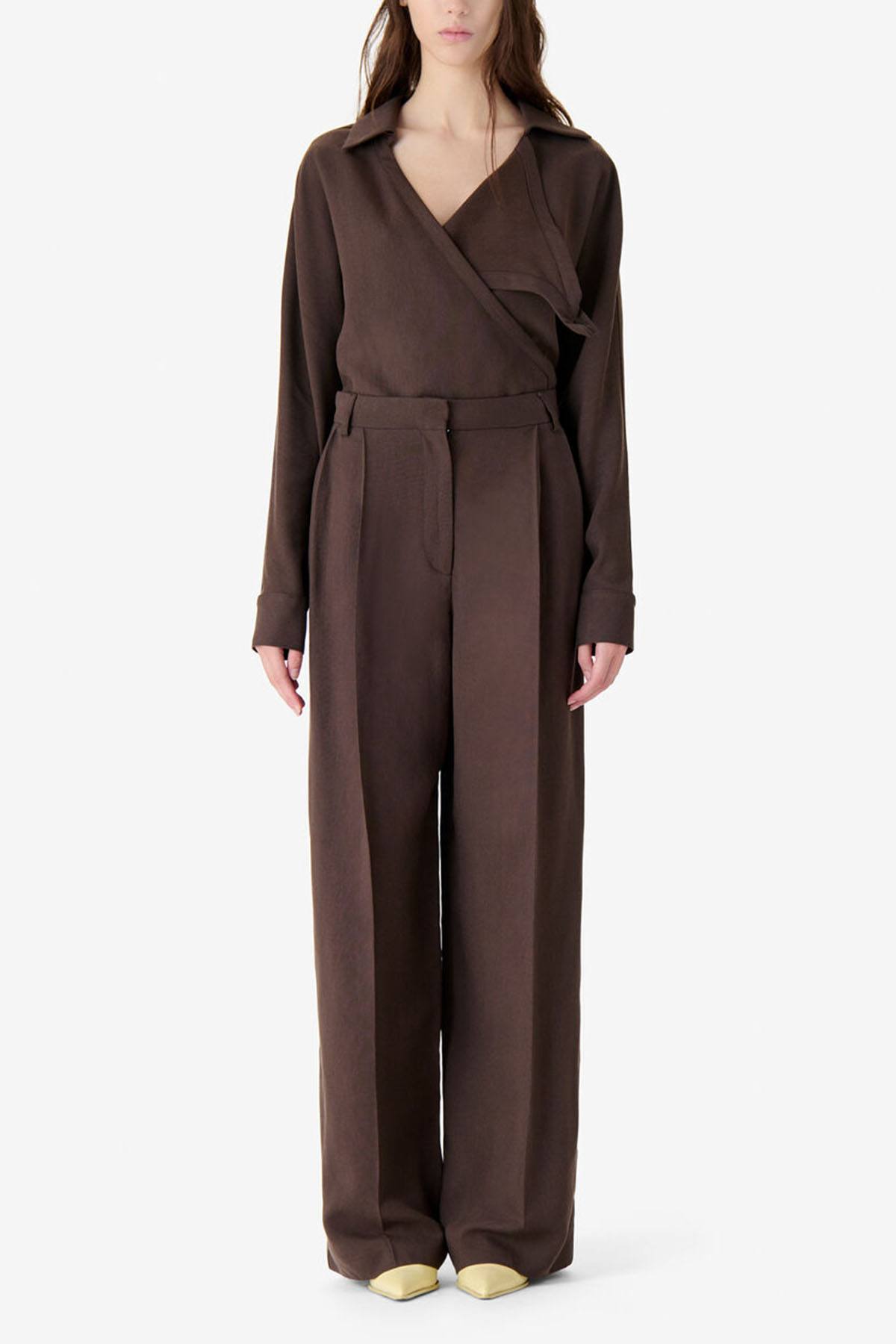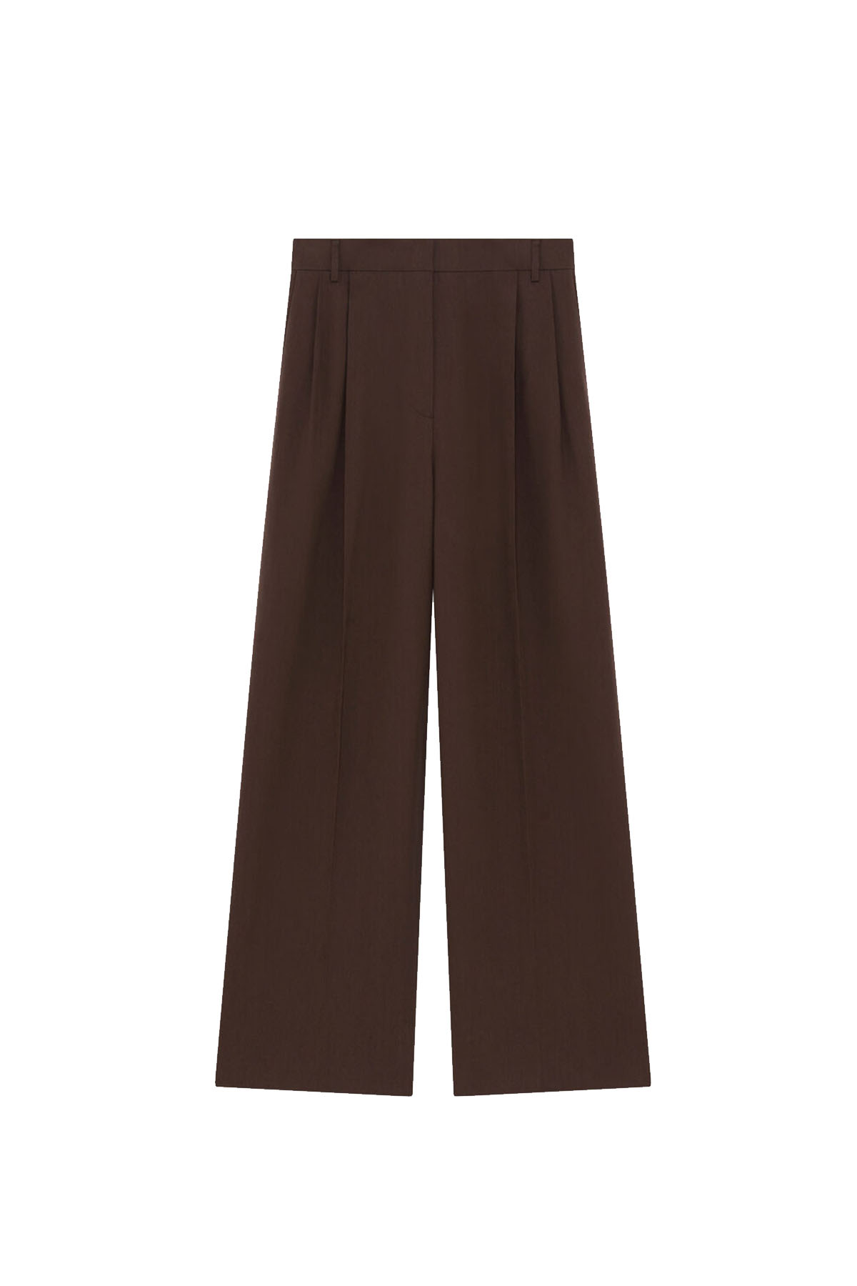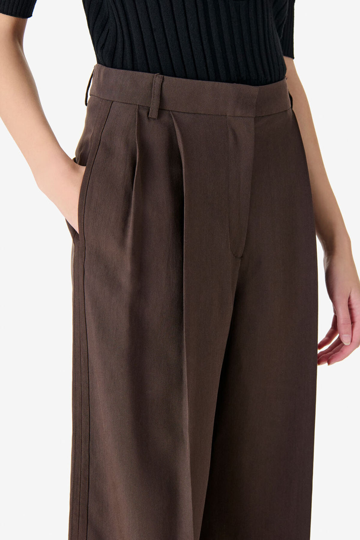 Pantaloni a vita alta di color marrone, Taglio lungo e ampio, Pieghe strutturate sul davanti, Passanti per cintura, Tasche laterali, Tasche a filetto sul retro, Drappeggio fluido.
