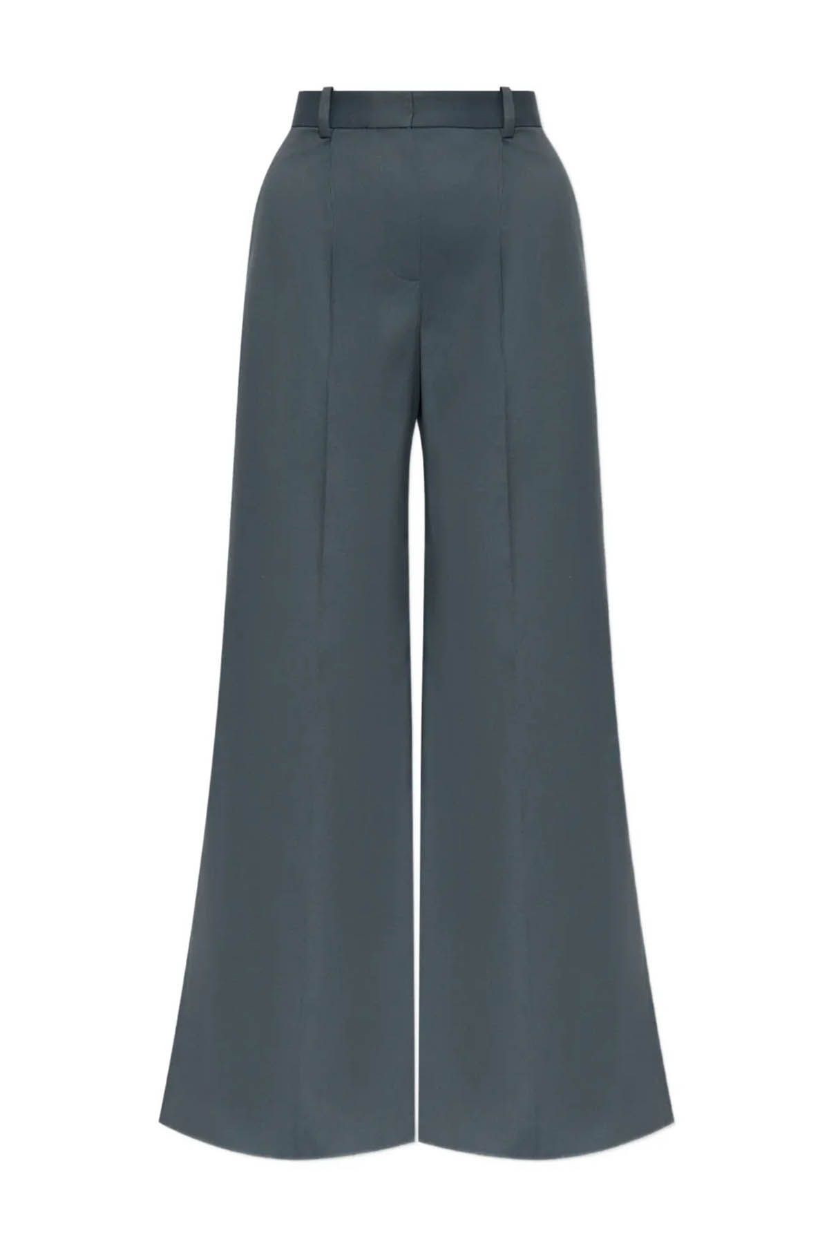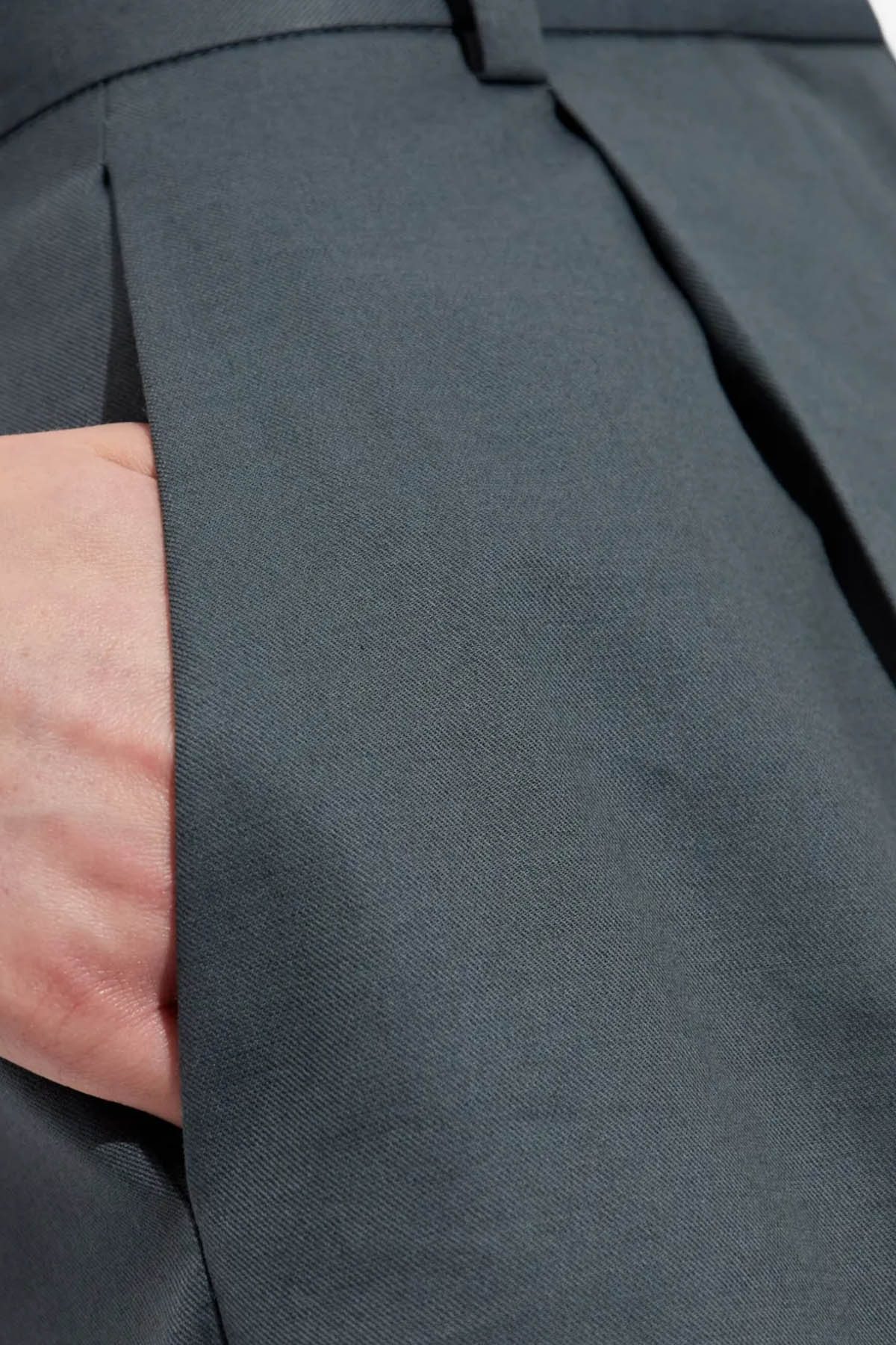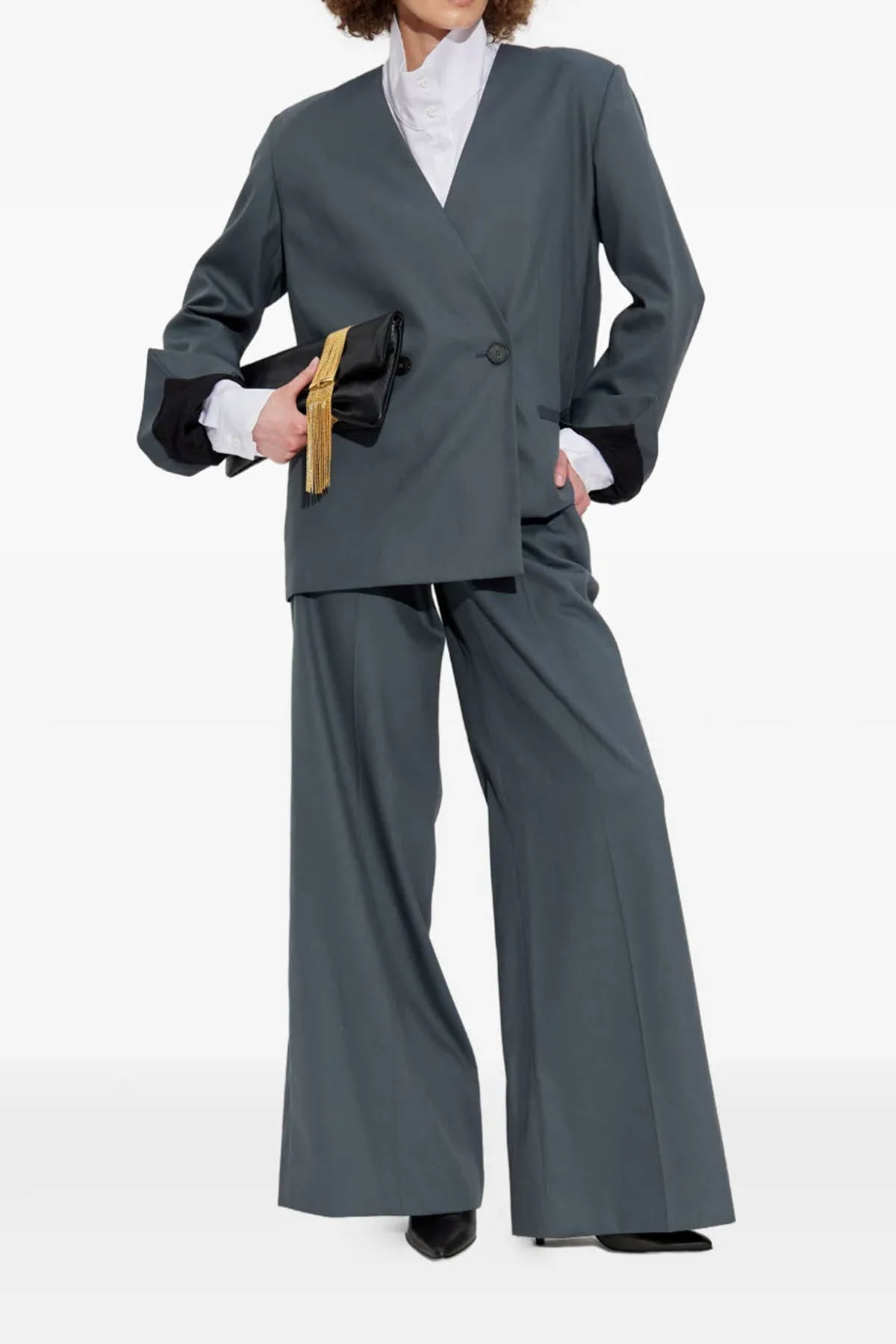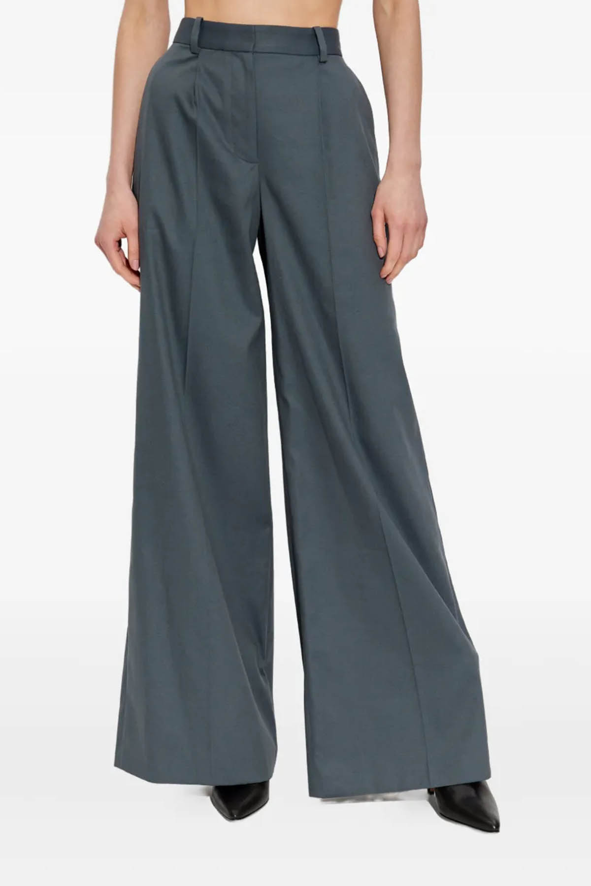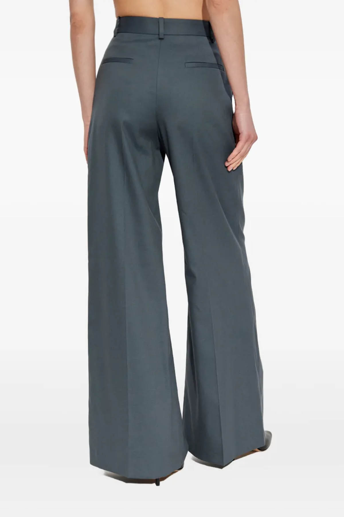 Modello vita alta, chiusura frontale con zip e gancio nascosti, tasche laterali, gamba ampia.