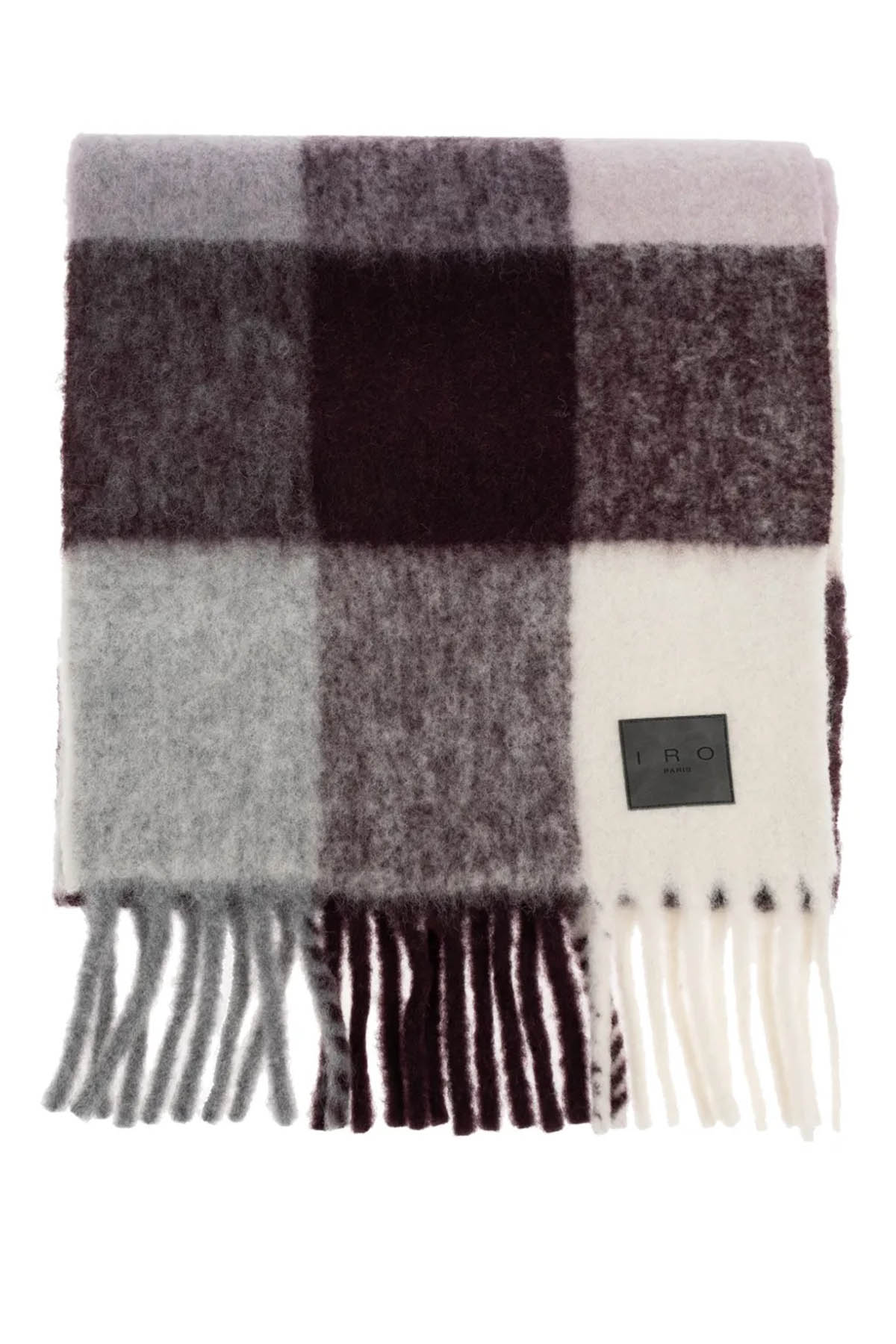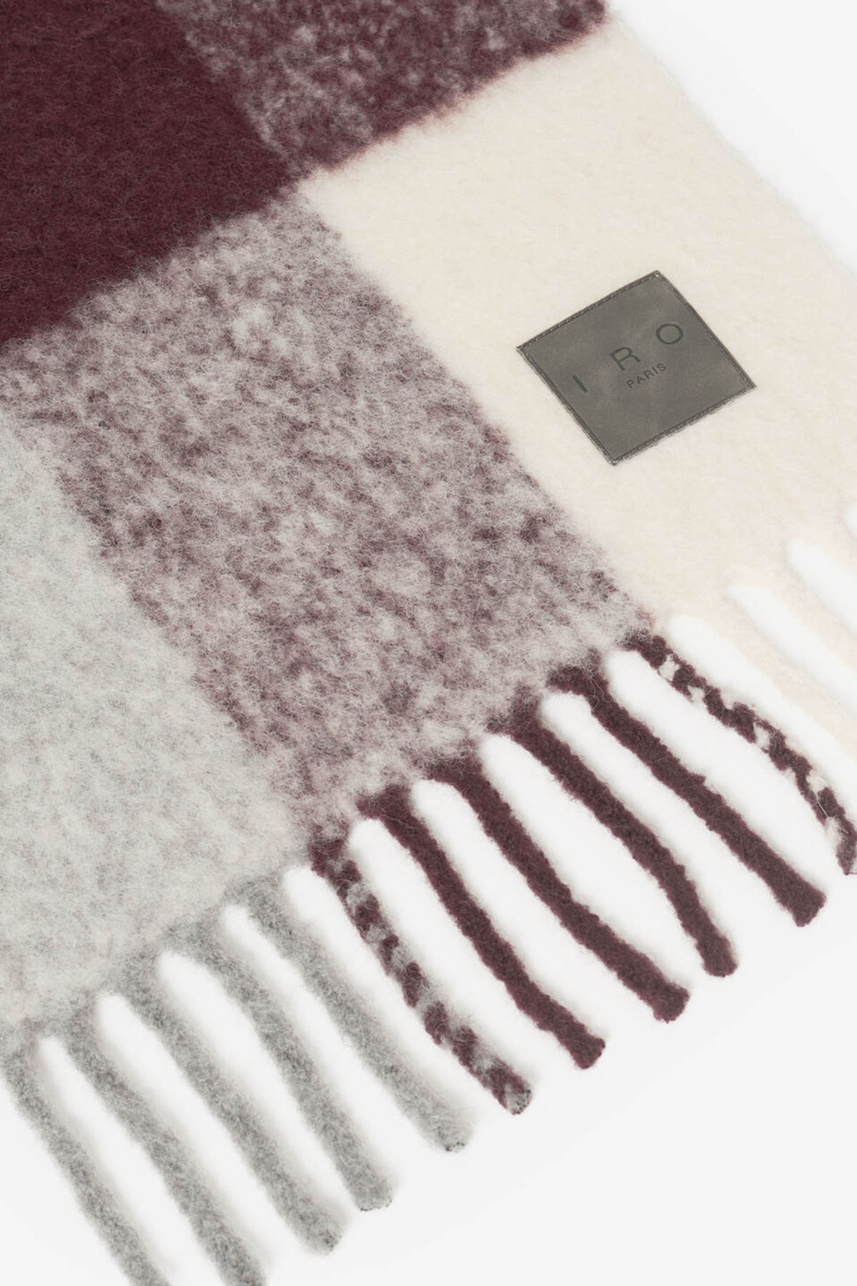 Modello borgogna, motivo a quadri, finitura con frange, misto lana, etichetta con logo, forma rettangolare.