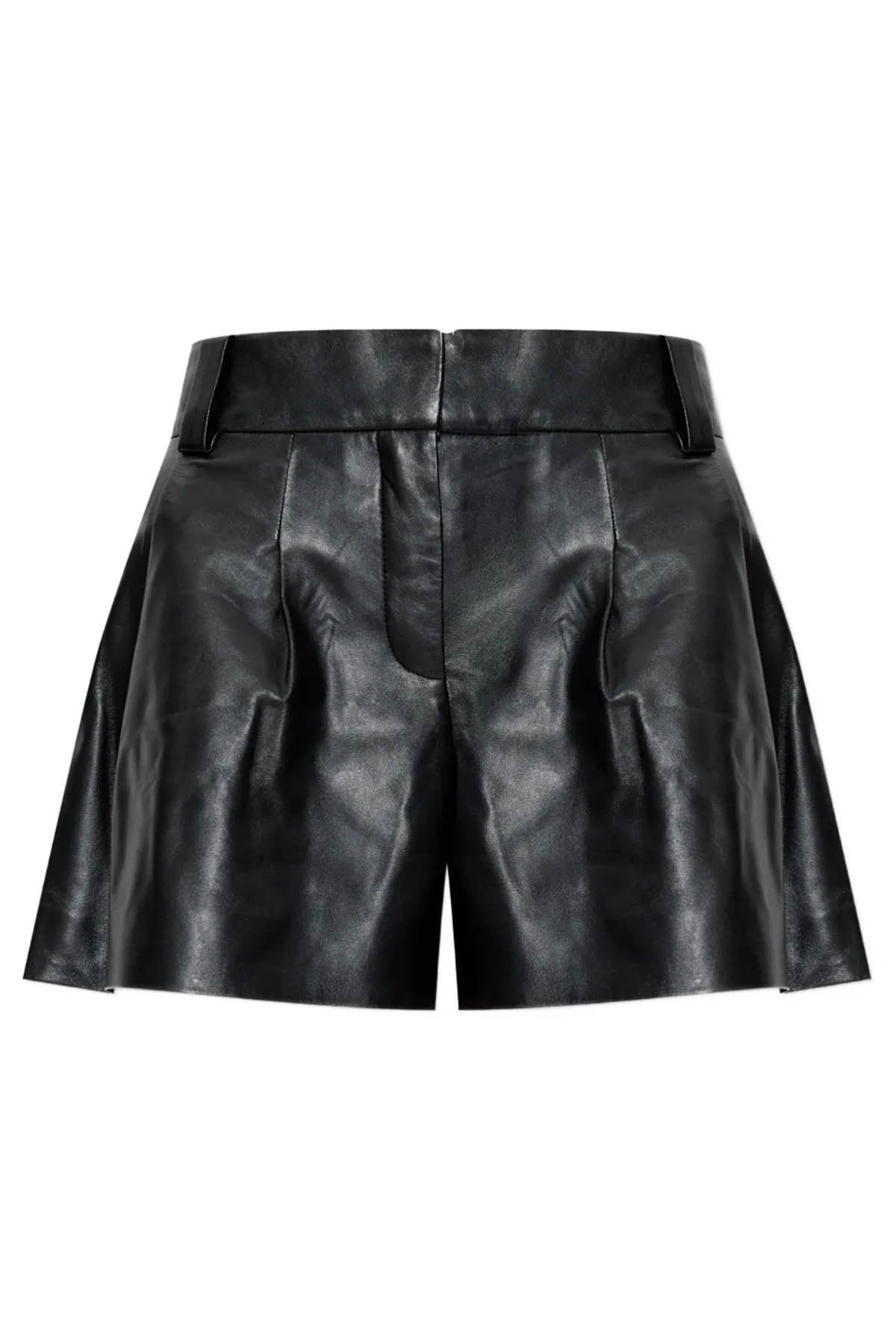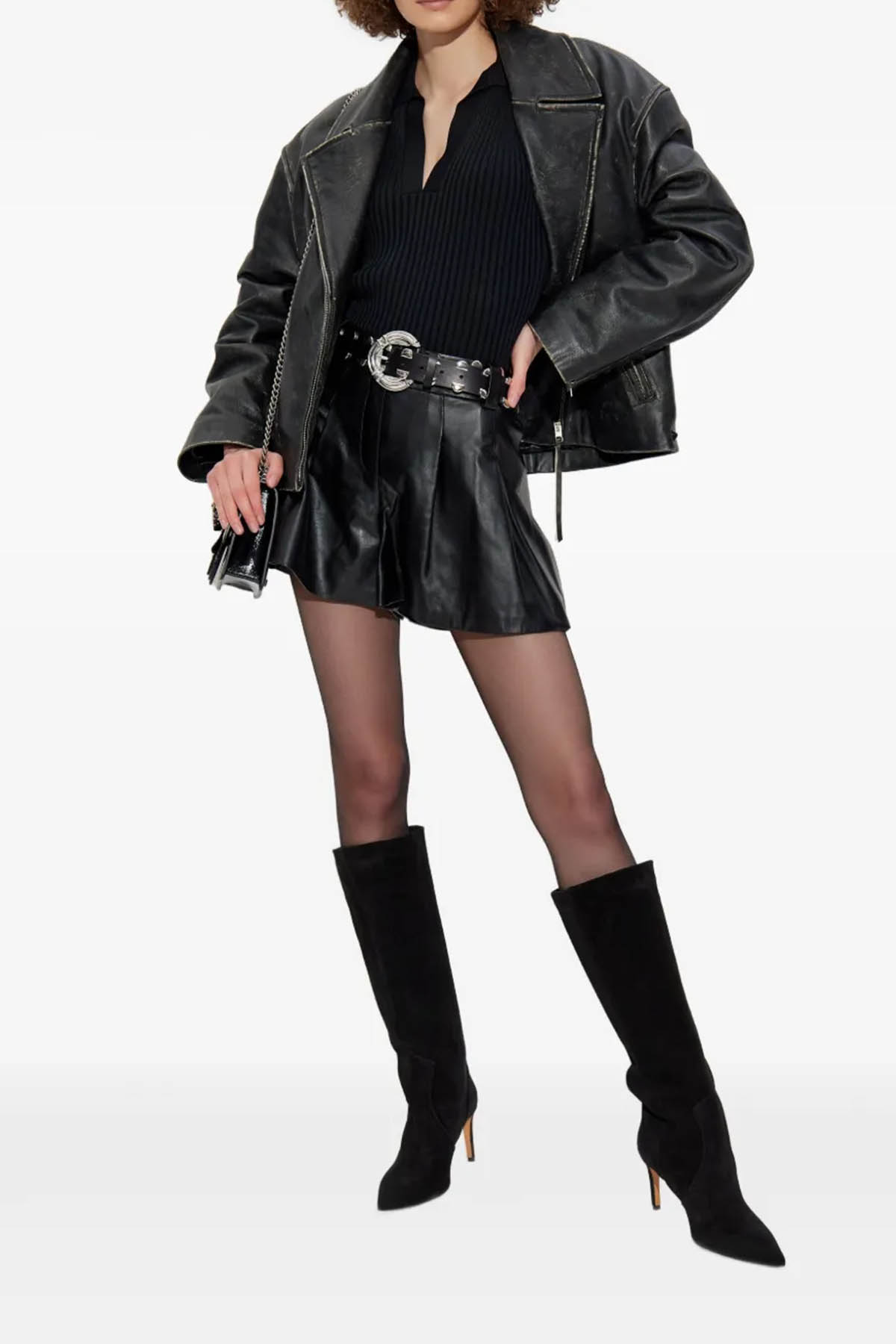 Modello in pelle, dettagli plissettati, chiusura nascosta, orlo dritto.
