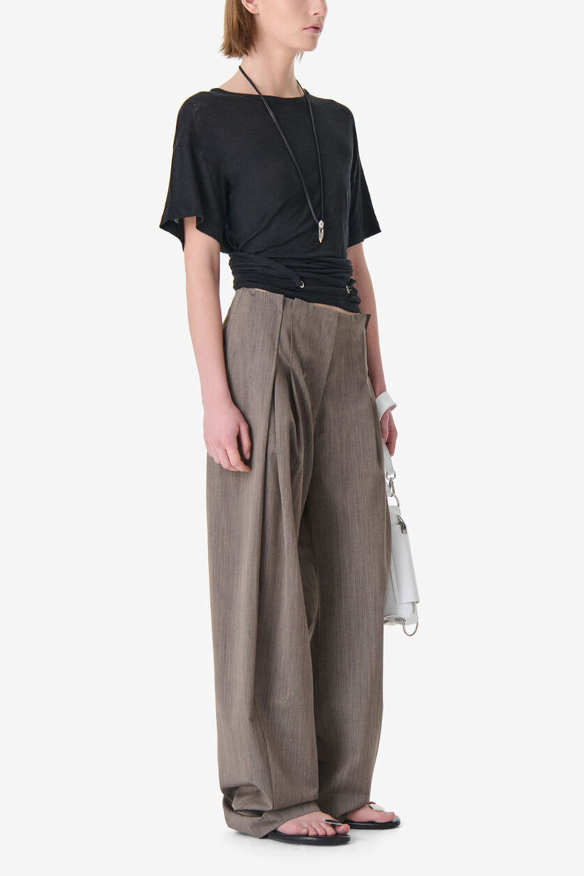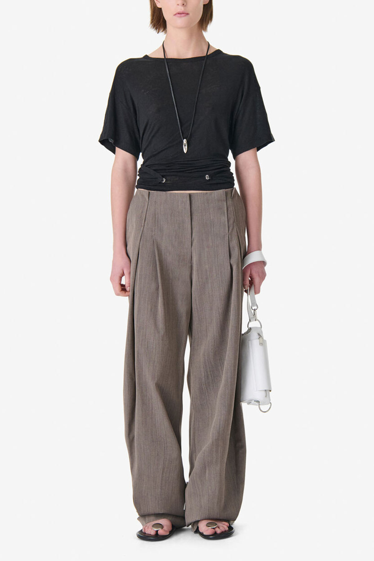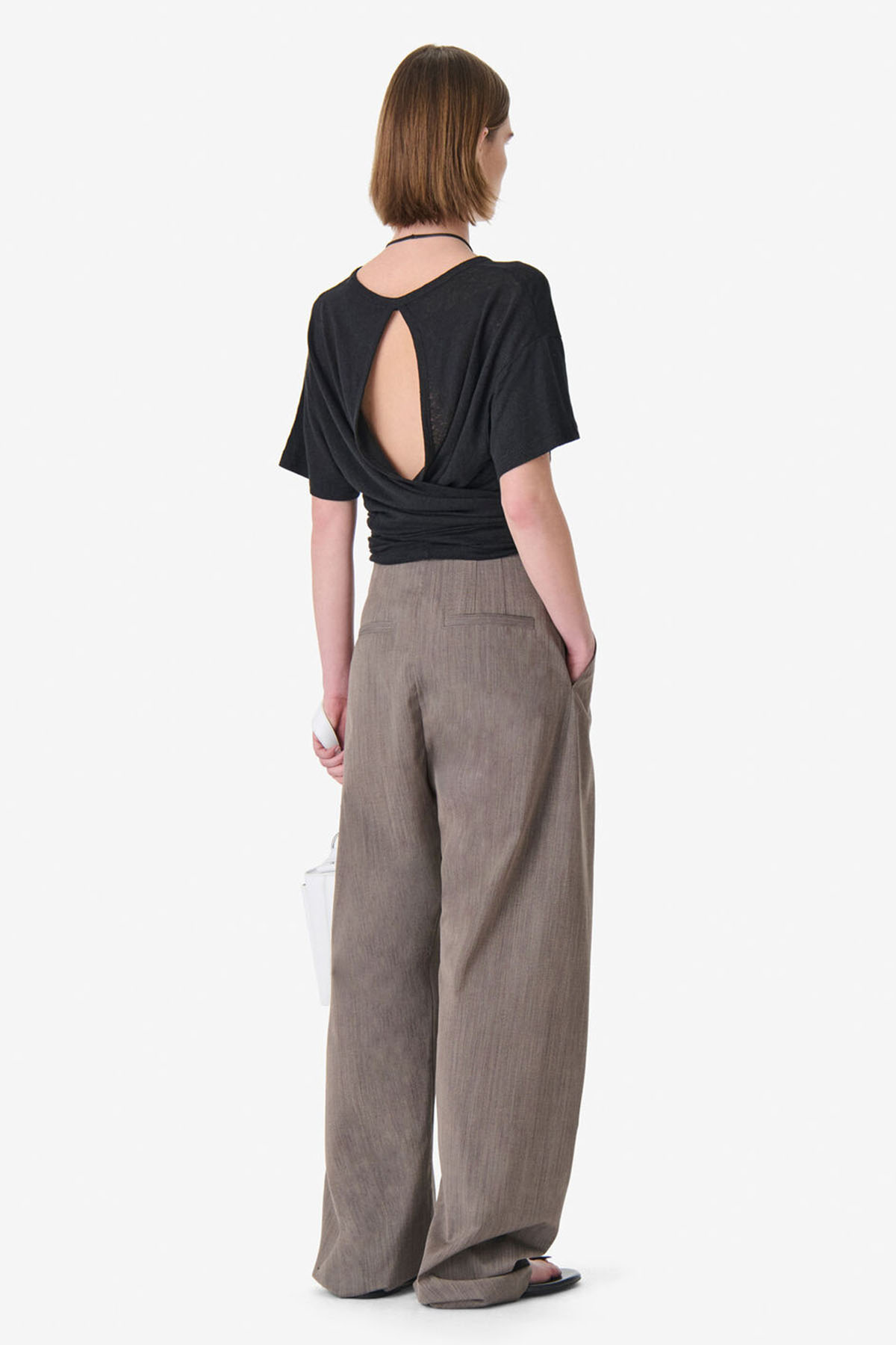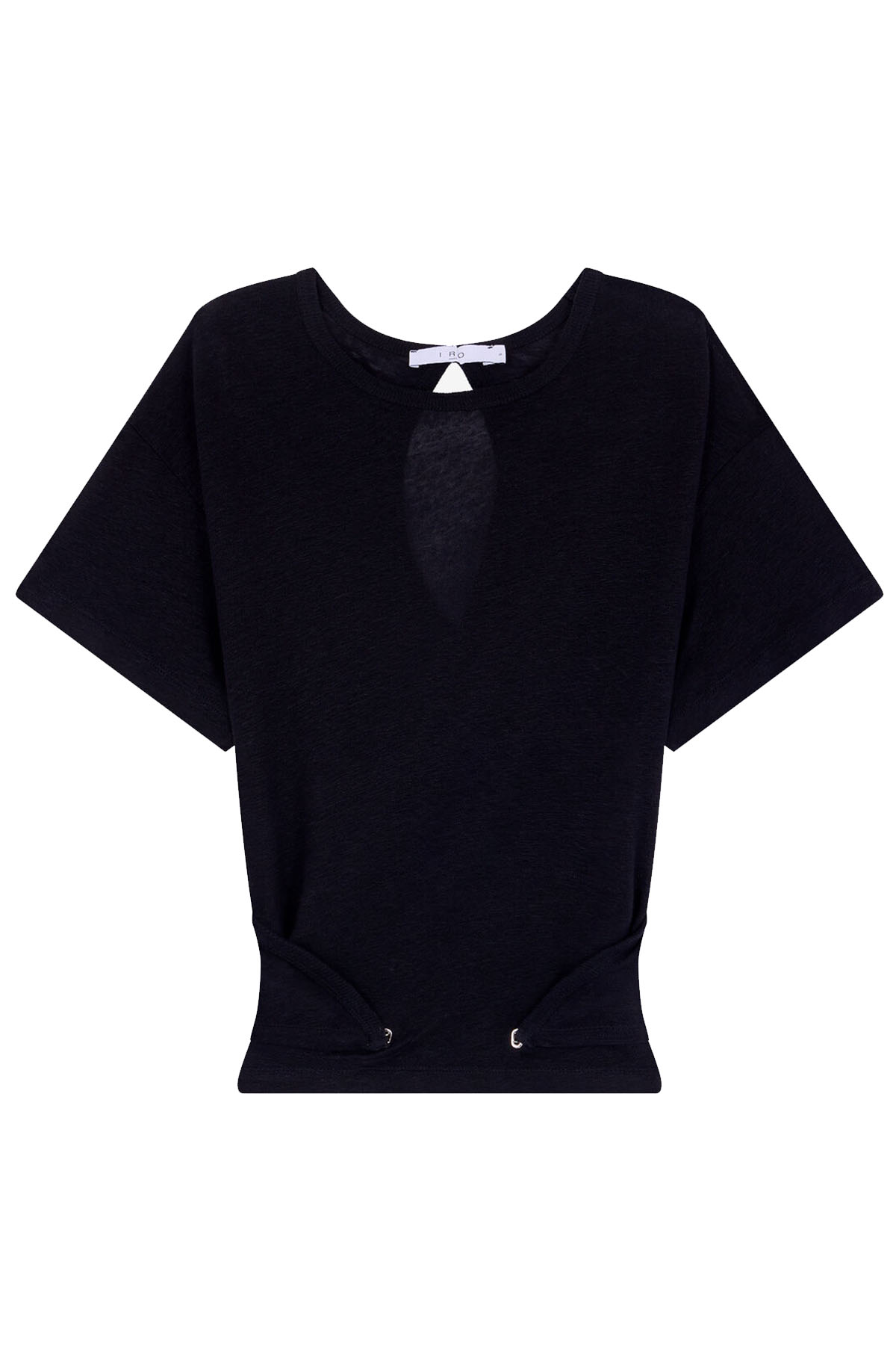 T-shirt in lino leggero nero, Scollo rotondo e maniche corte, Ampia schiena scoperta con pannelli sovrapposti che si chiudono sul davanti con ganci e occhielli ovali.