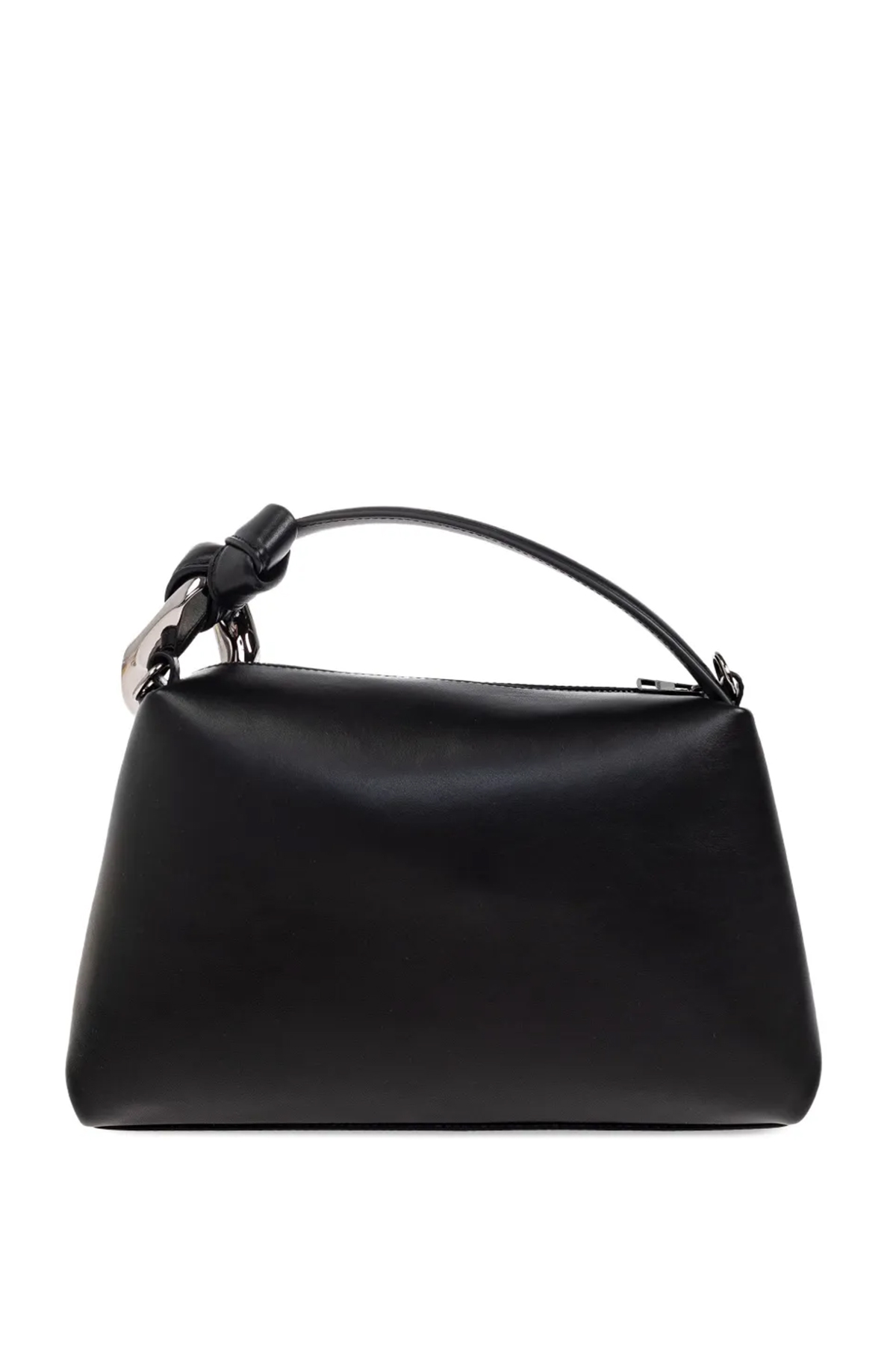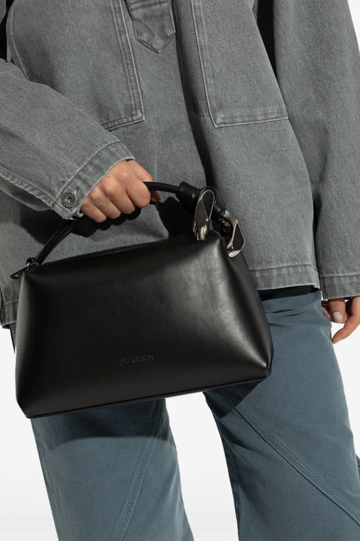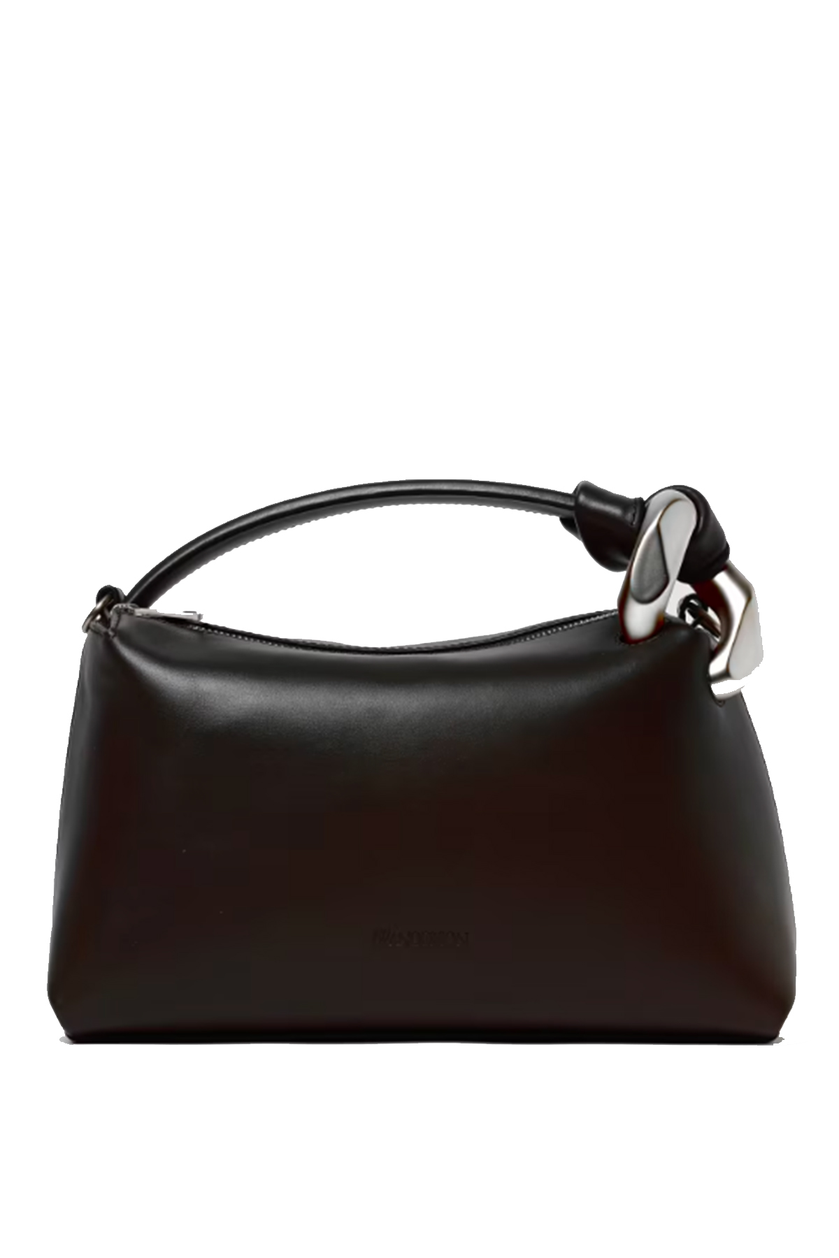 Modello in pelle di vitello, grana liscia, logo frontale inciso, dettaglio a catena color argento, chiusura superiore con zip, tracolla regolabile e rimovibile, manico superiore, scomparto unico, tasca interna a soffietto, fodera integrale.