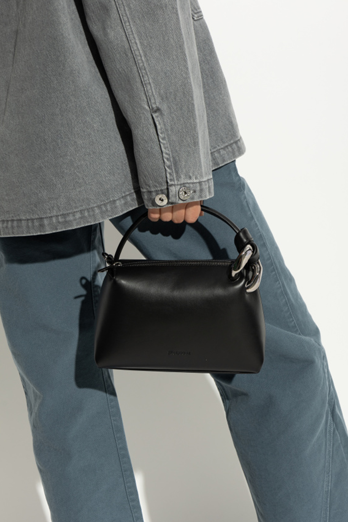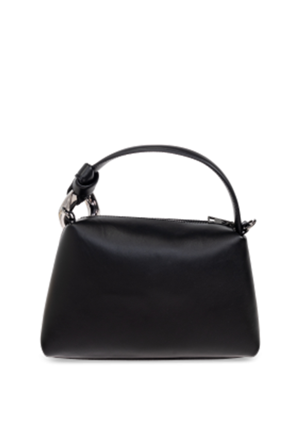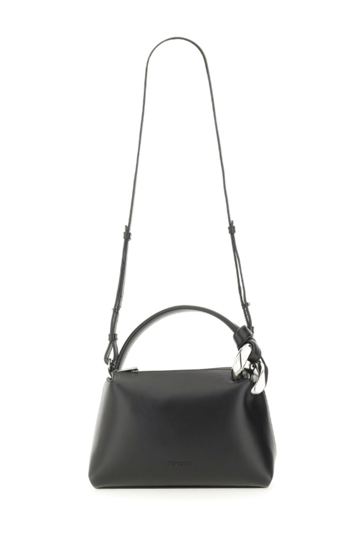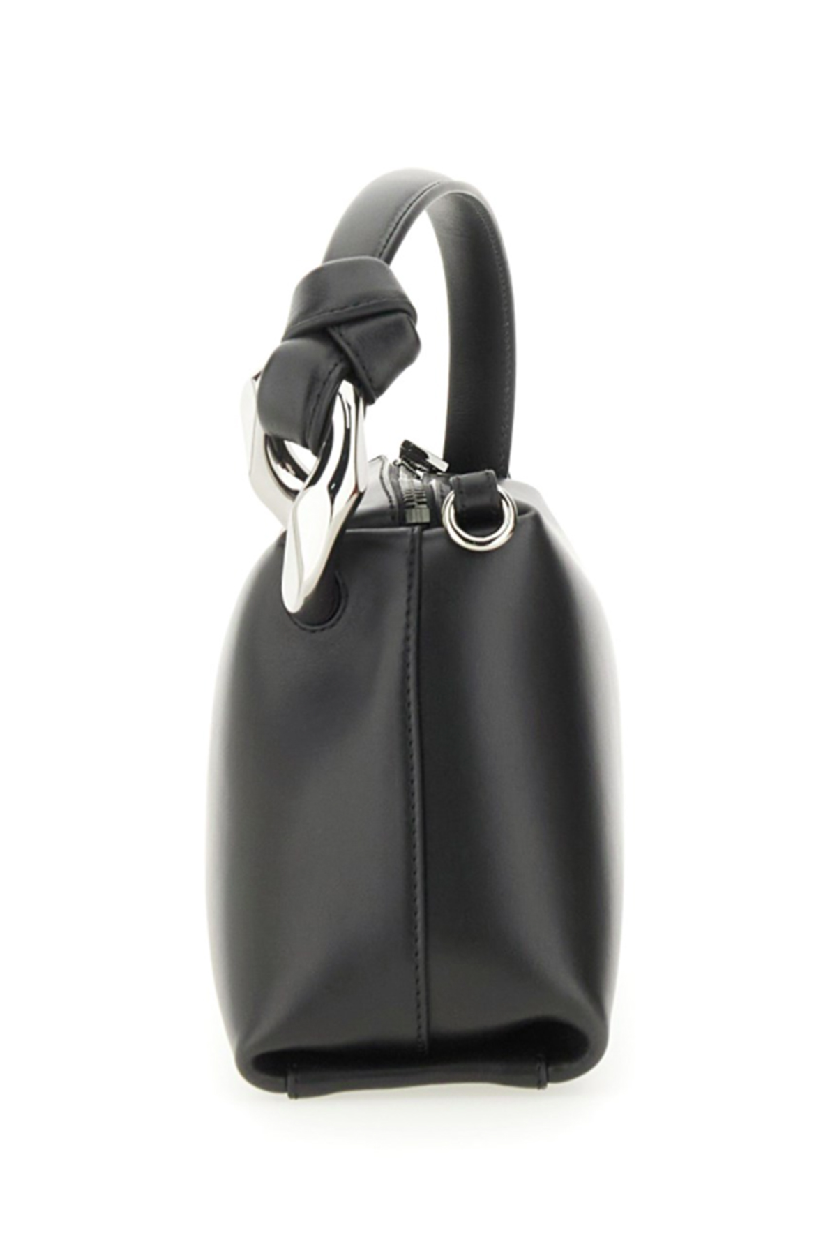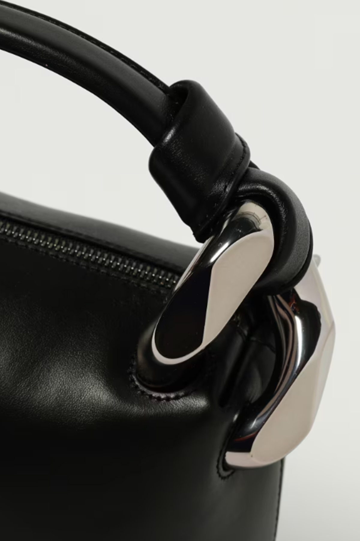 Modello in pelle di vitello, manico, tracolla regolabile e rimovibile, dettaglio con nodo, dettagli color argento, chiusura con zip, scomparto unico.