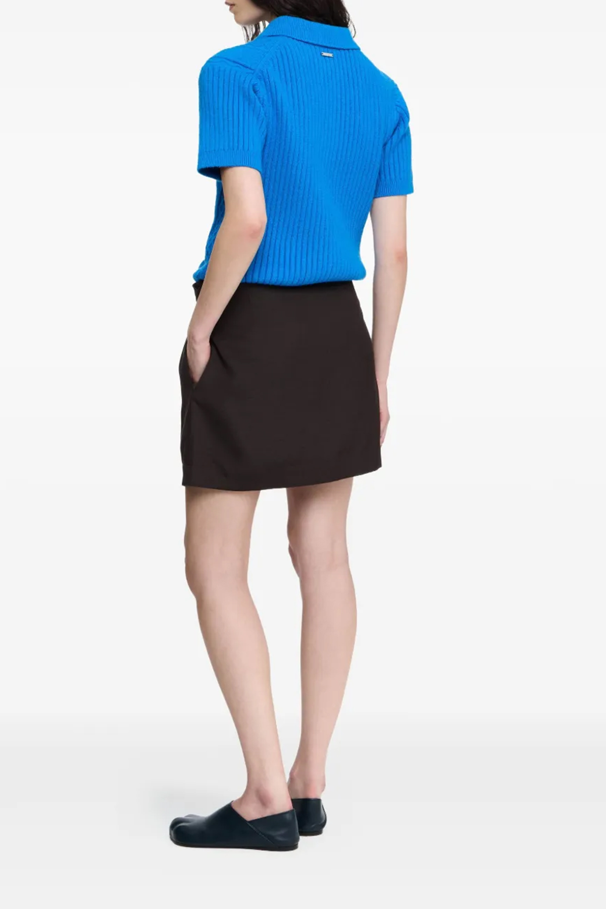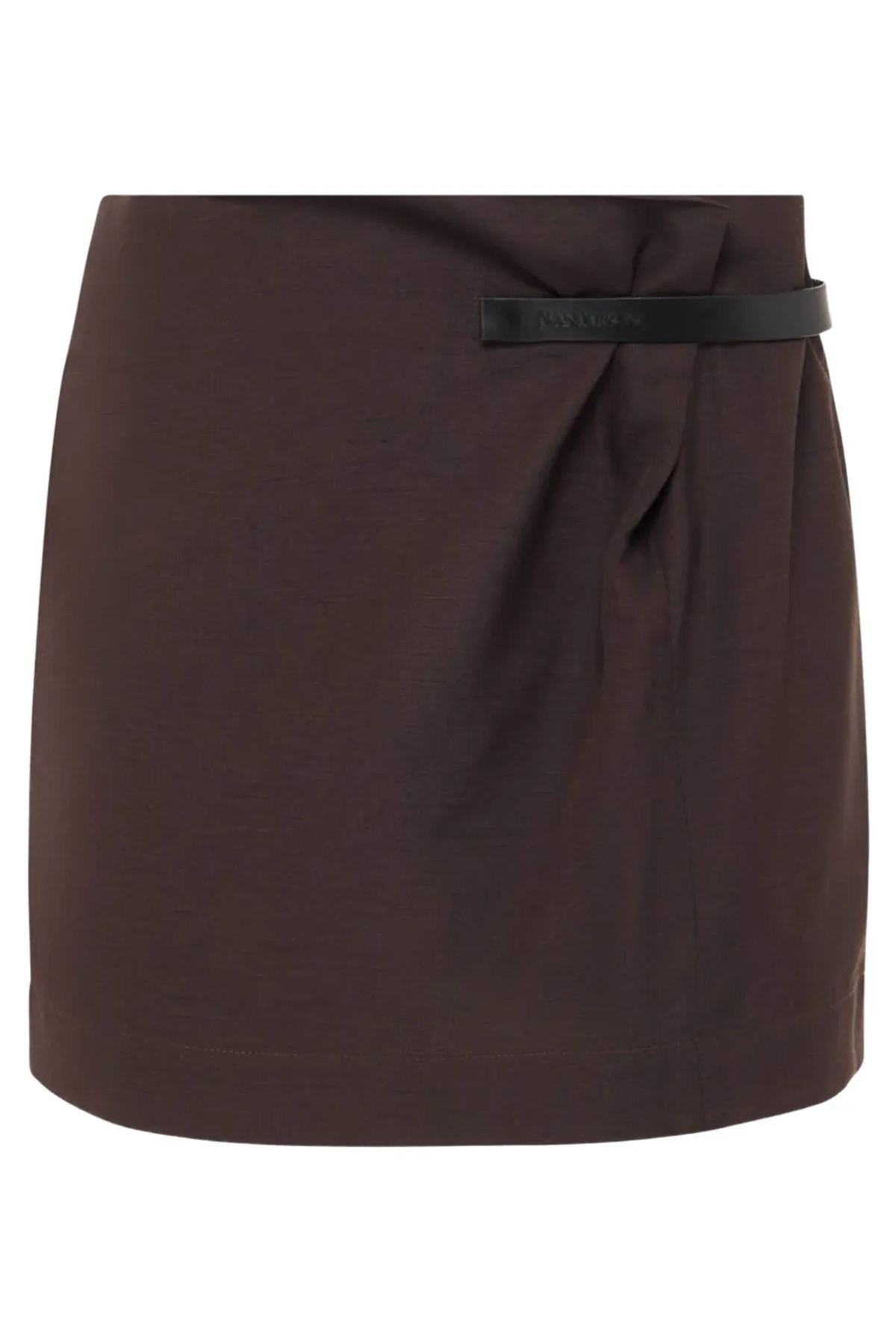 Modello con arricciatura, chiusura laterale con zip nascosta, inserto in pelle con logo, design corto.