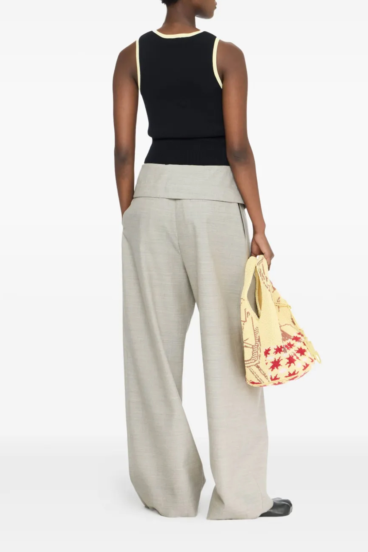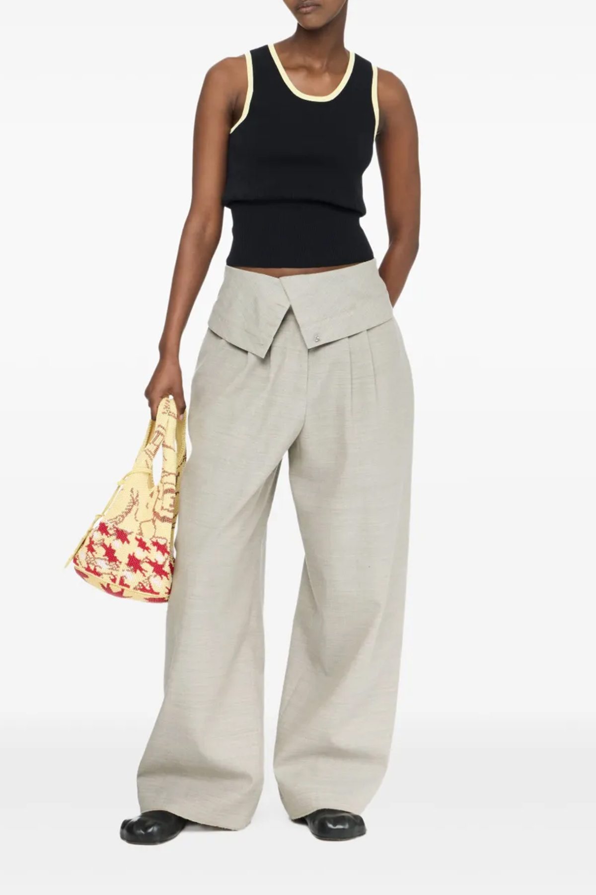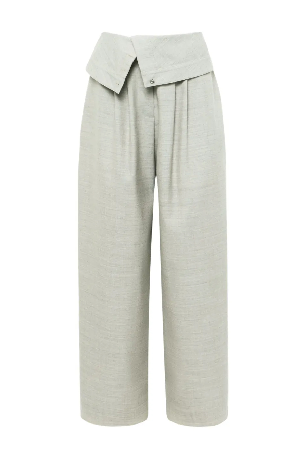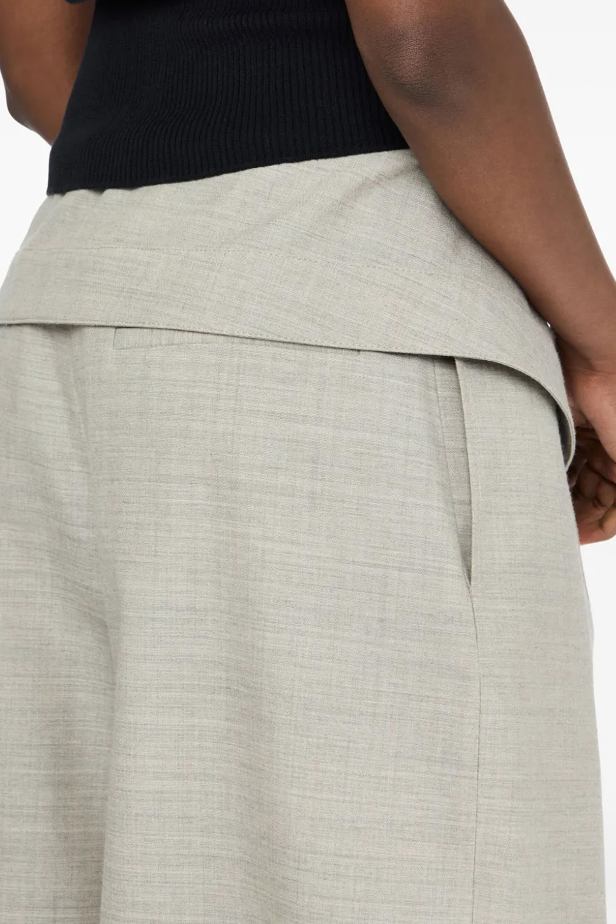 Modello con vita a portafoglio, chiusura frontale con bottoni e zip, gamba ampia, orlo dritto.