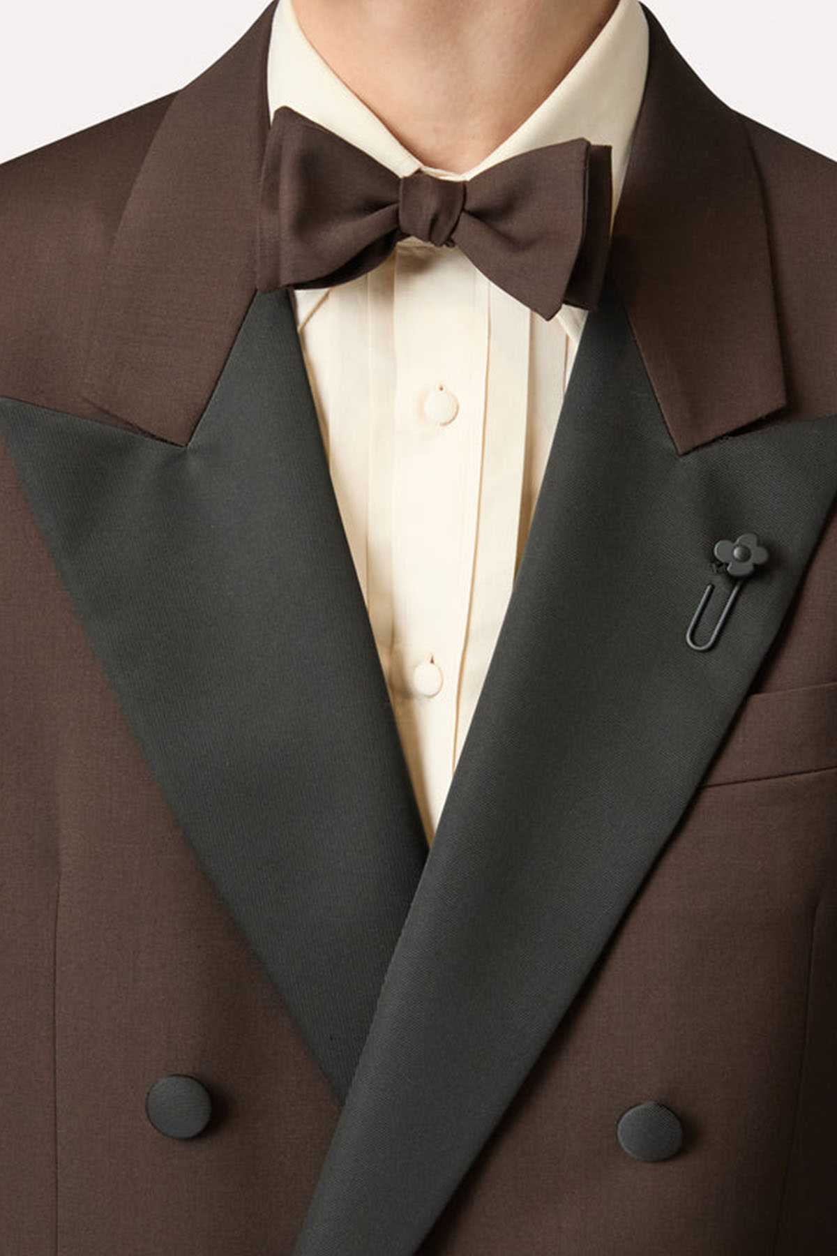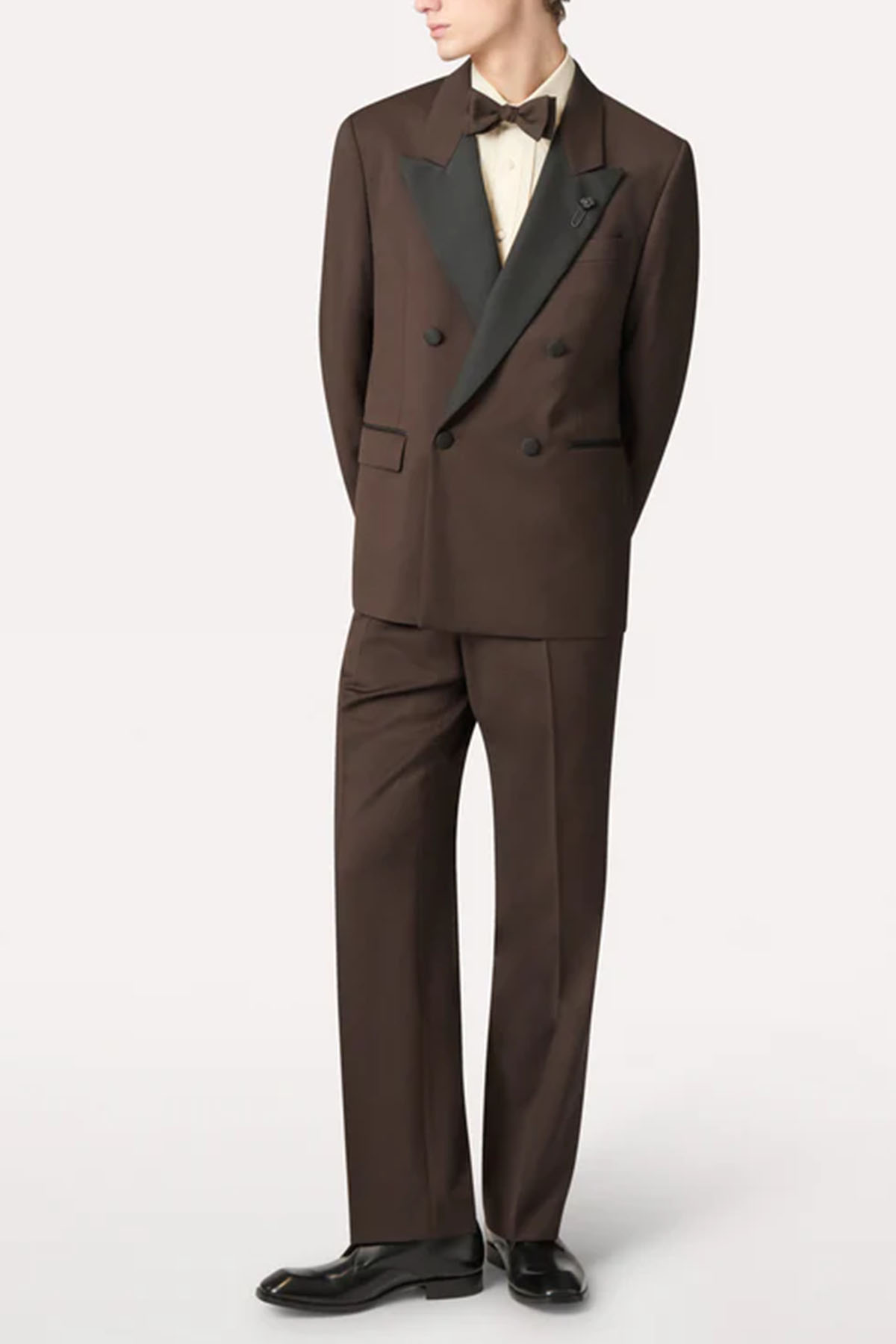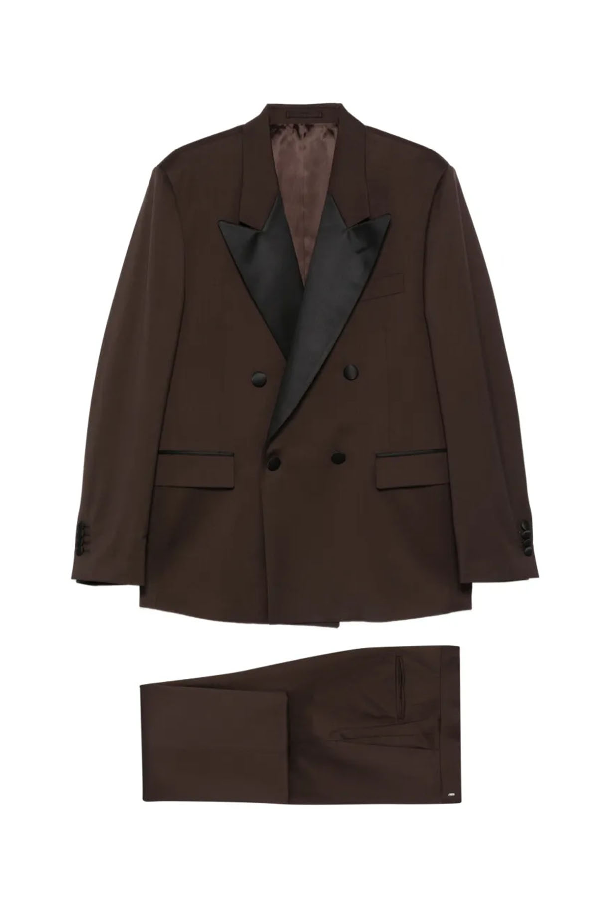 Abito marrone composto da giacca smoking doppiopetto a 4 bottoni con bottoni e rever a lancia in tessuto contrastante, tasche con pattina, spacchi laterali e completamente foderata, pantalone senza pieghe con zip, tasche frontali allamericana, tasche posteriori a doppio filetto e fondo 23 cm non finito. Realizzato in tessuto leggero saia unito, con aspetto dritto e squadrato e spalla classica.
