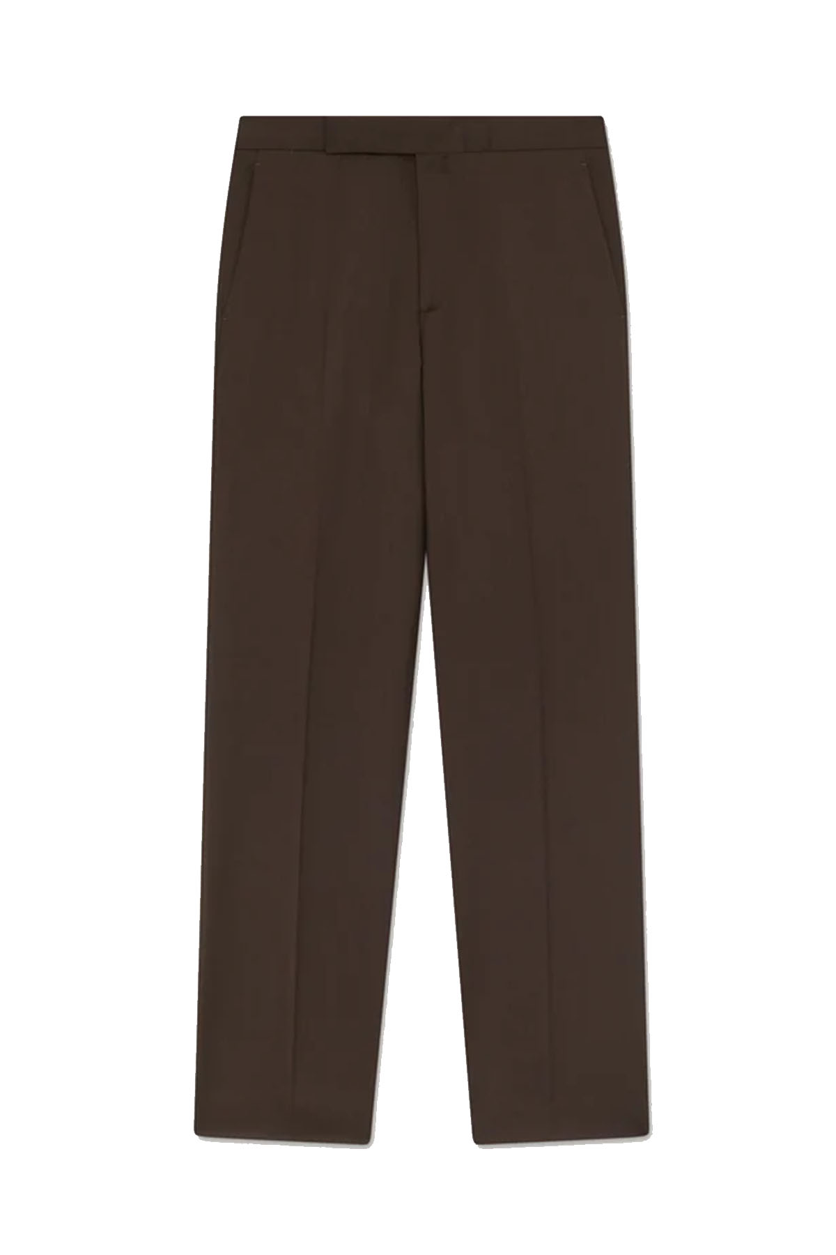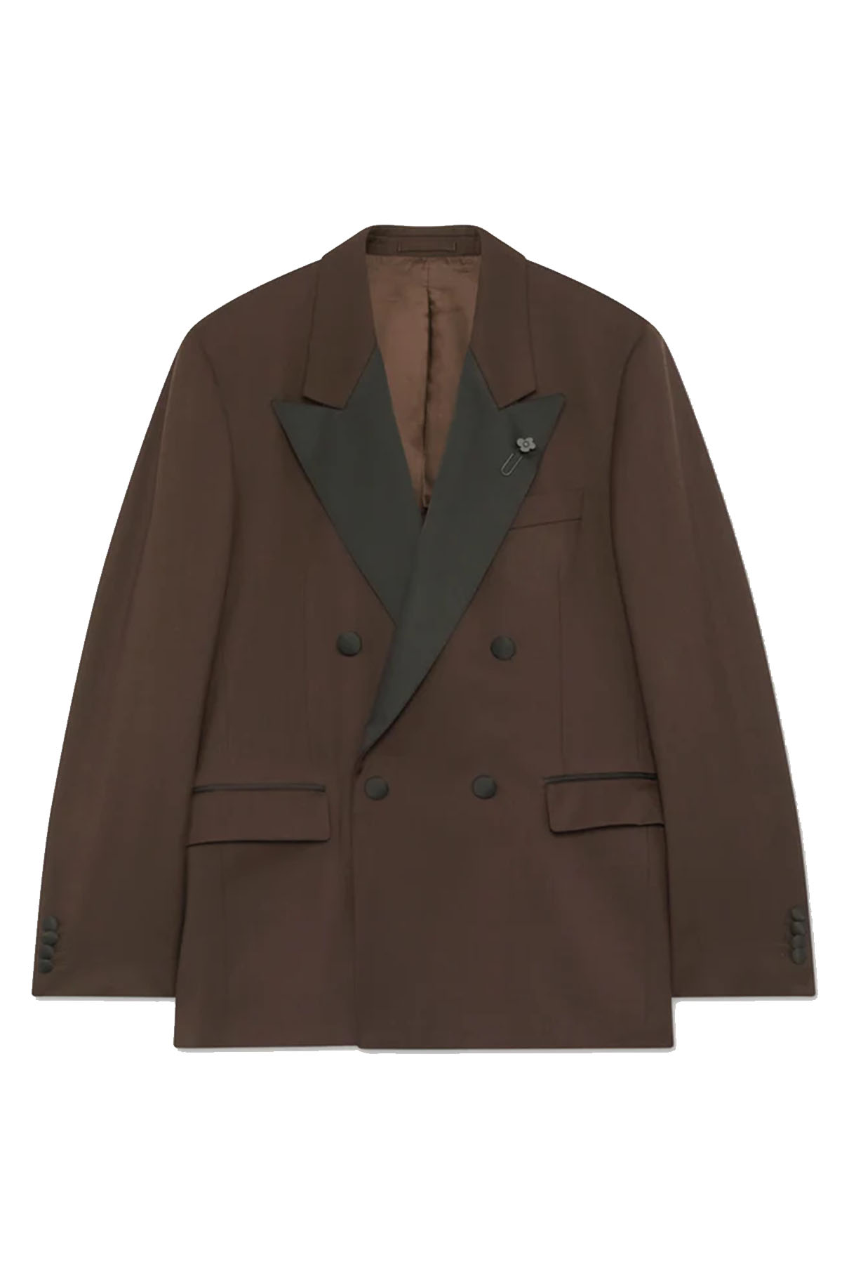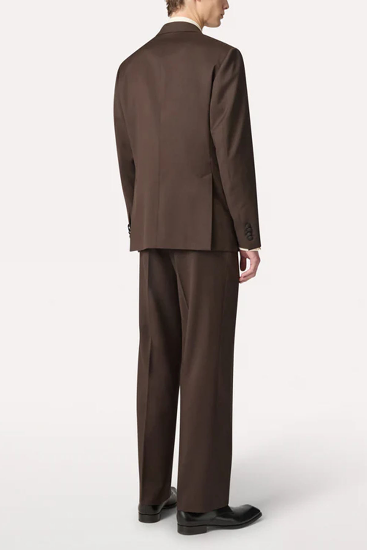 Abito marrone composto da giacca smoking doppiopetto a 4 bottoni con bottoni e rever a lancia in tessuto contrastante, tasche con pattina, spacchi laterali e completamente foderata, pantalone senza pieghe con zip, tasche frontali allamericana, tasche posteriori a doppio filetto e fondo 23 cm non finito. Realizzato in tessuto leggero saia unito, con aspetto dritto e squadrato e spalla classica.