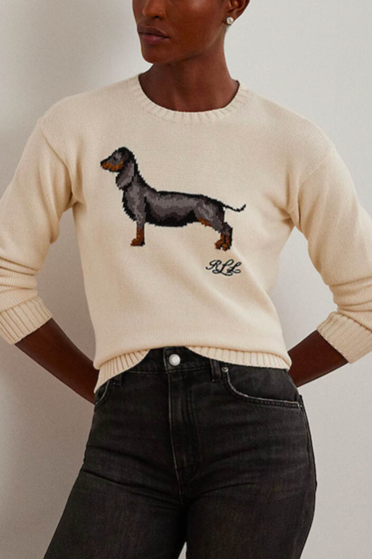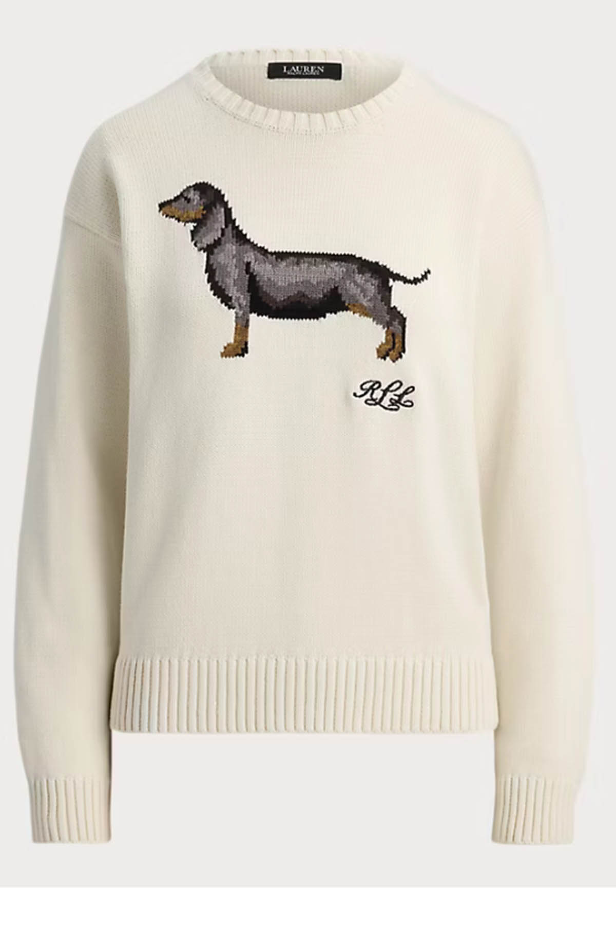 Modello girocollo, manica lunga, bassotto ricamato frontale, taglio spalla basso, orlo e polsini a coste.