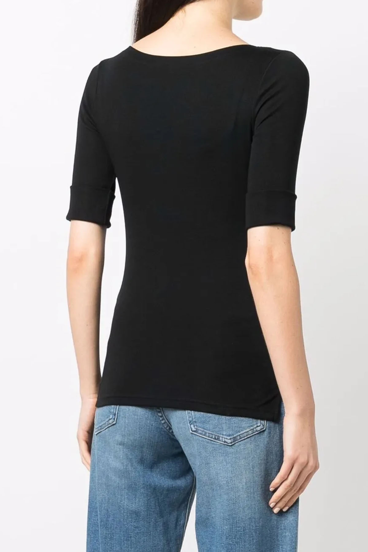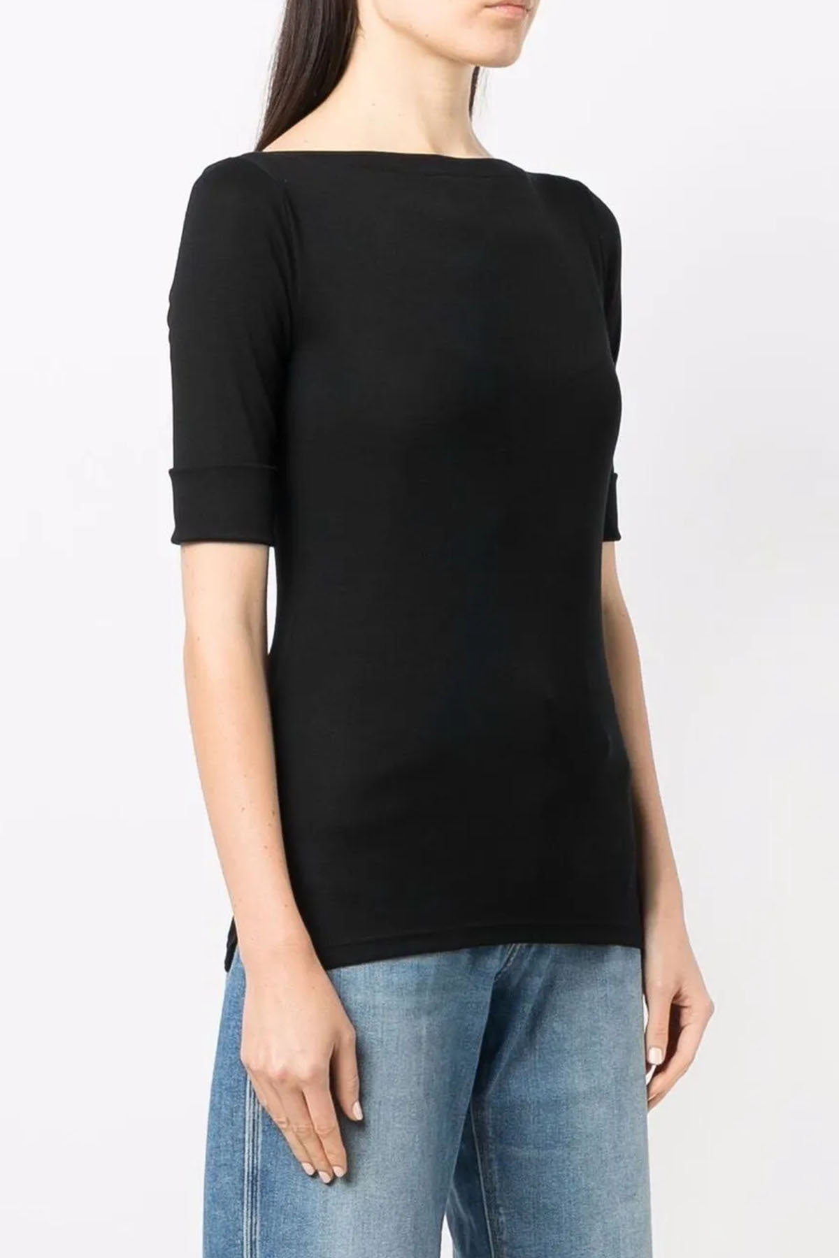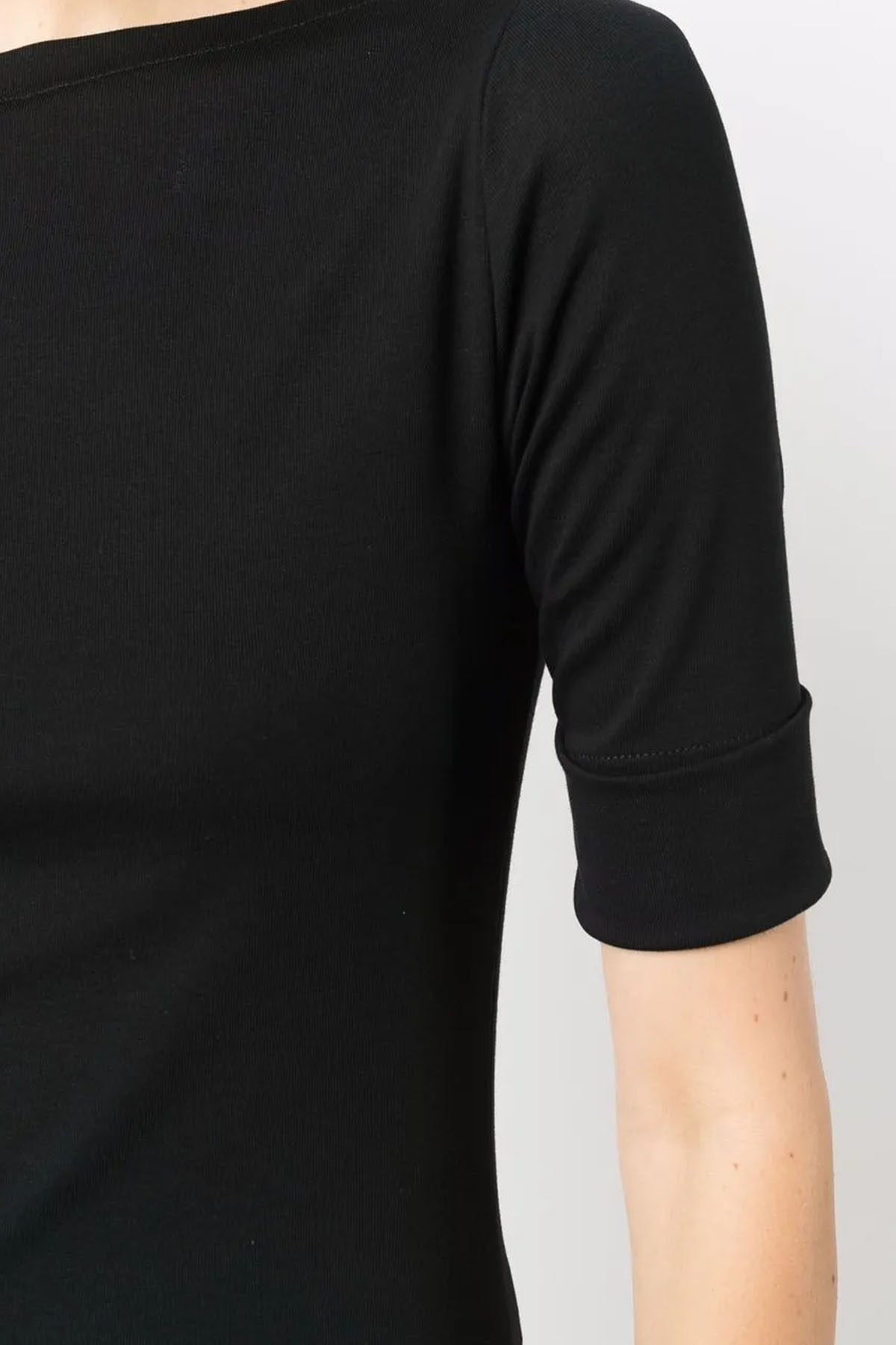 modello con scollo a barca, colore nero , maniche 3/4 con risvolto, monogramma "LRL" ricamato sull'orlo destro, orlo con spacco laterale.