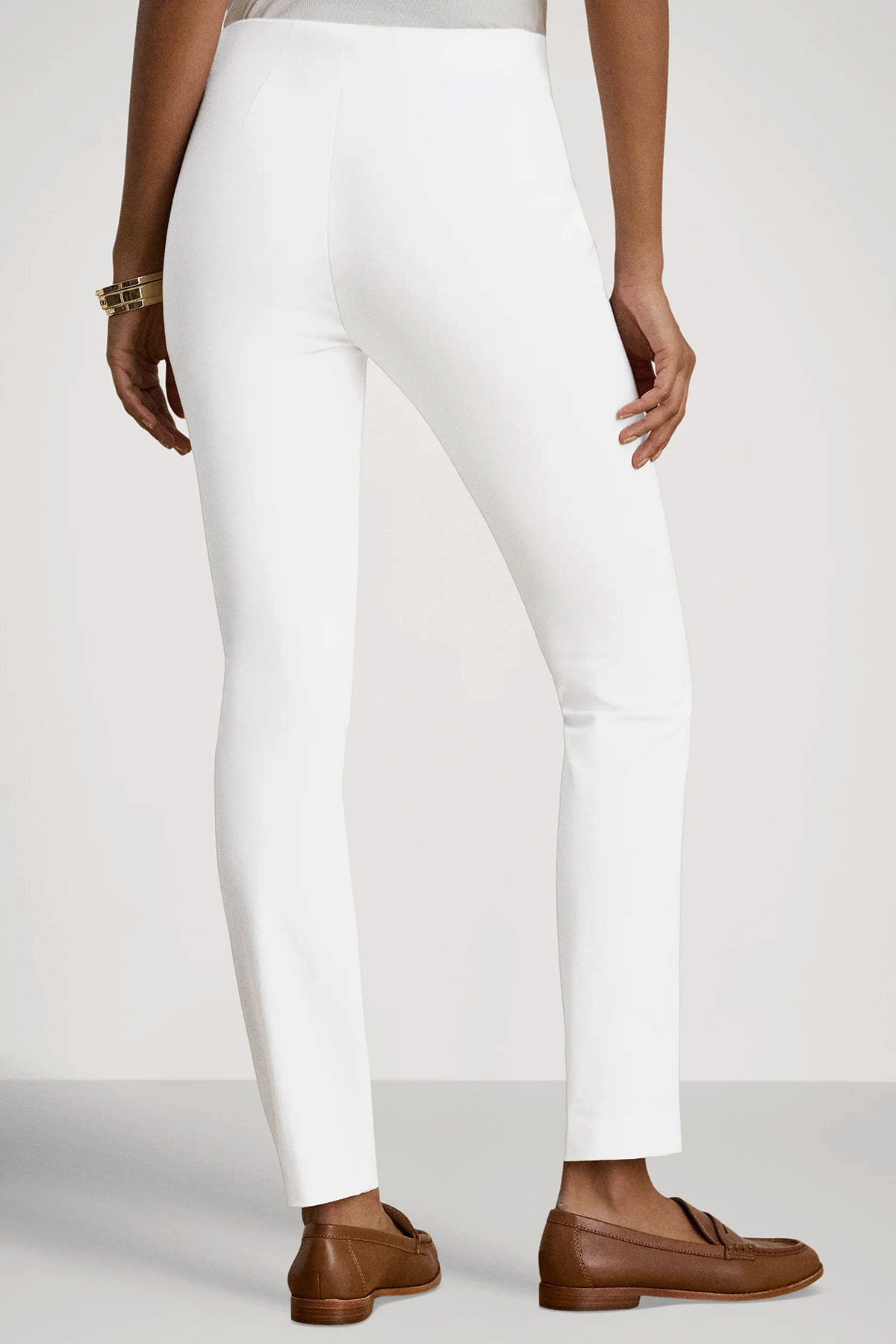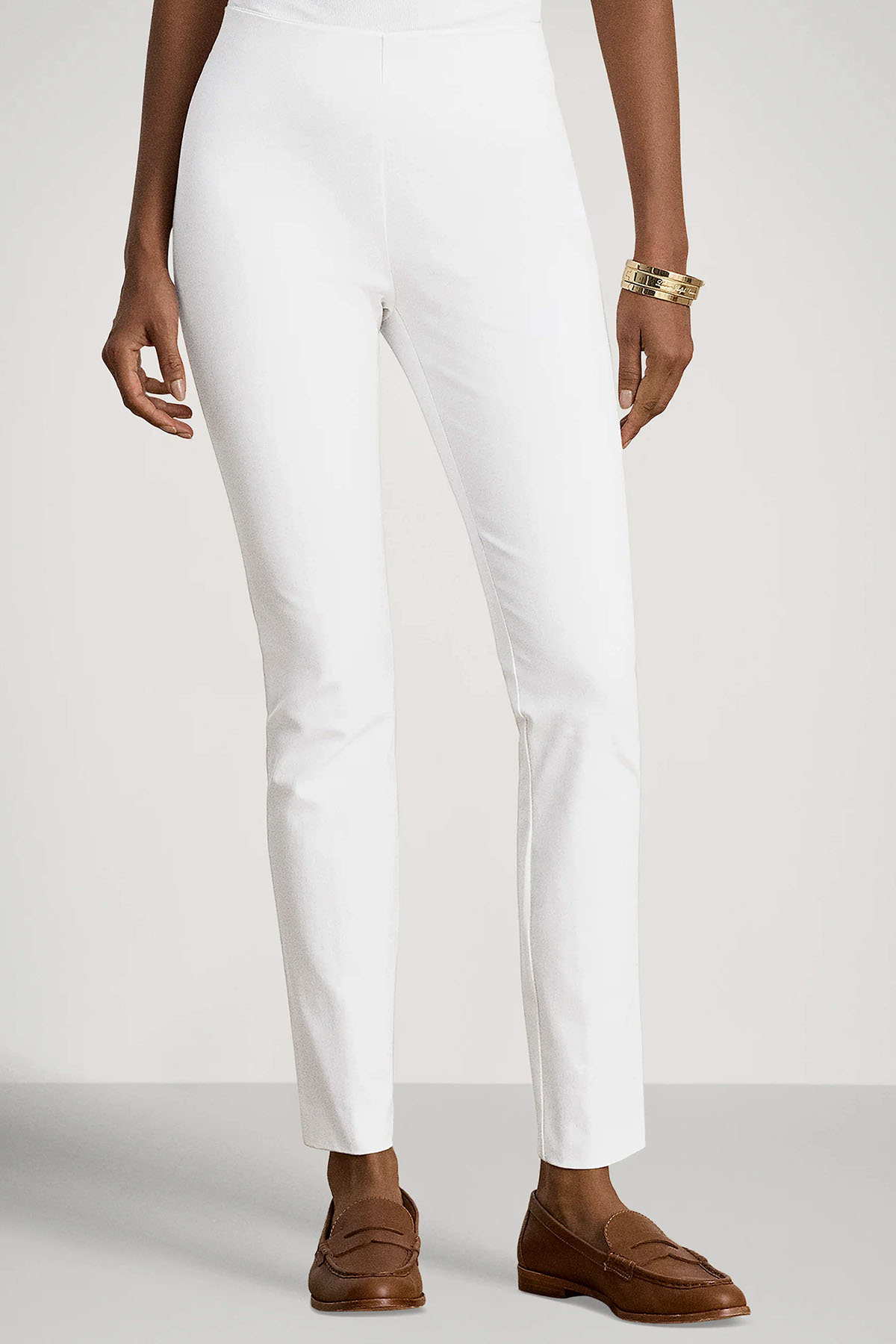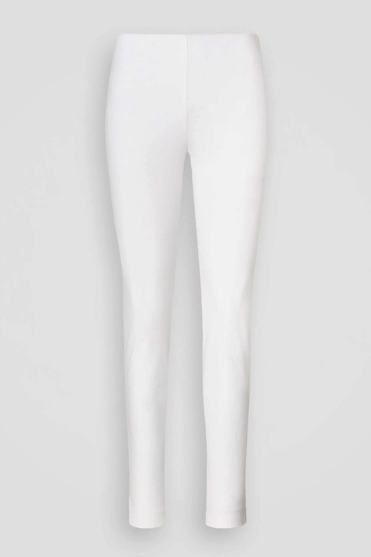 modello skinny in misto cotone stretch, vita media ed elasticizzata, lunghezza alla caviglia, chiusura laterale con zip nascosta.