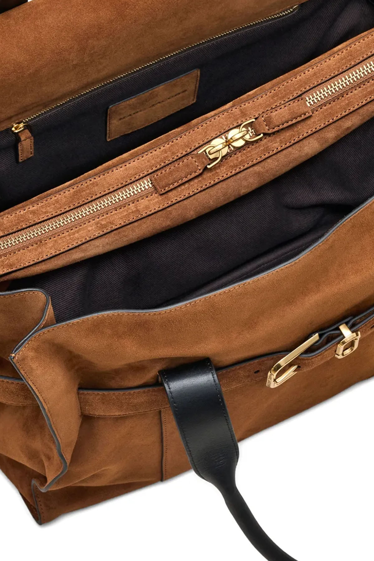 Modello con trama scamosciata, chiusura con fibbia, manici, dettaglio drappeggiato, inserti verticali, chiusura a patta, due scomparti aperti e una tasca centrale con zip per un'organizzazione ottimale, doppio manico superiore, tracolla regolabile e rimovibile. Unisex.