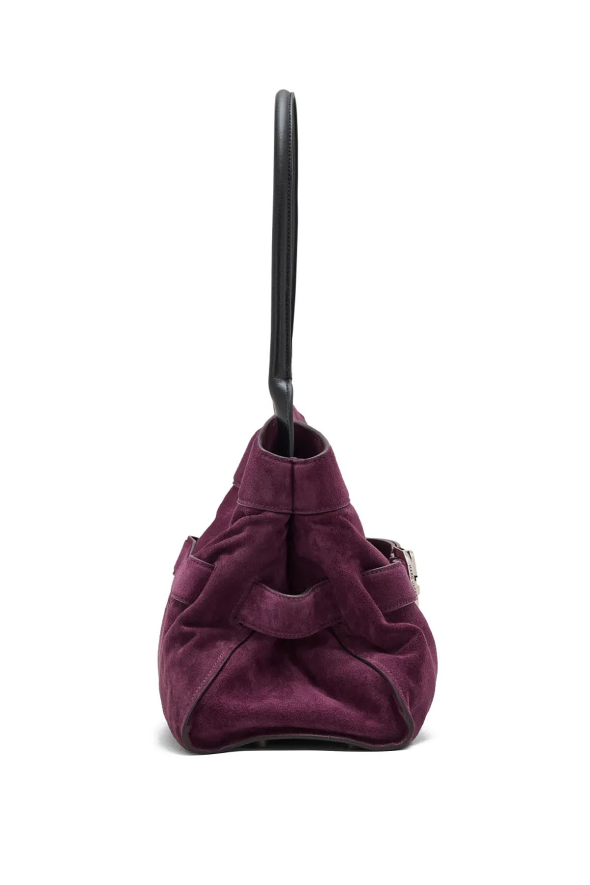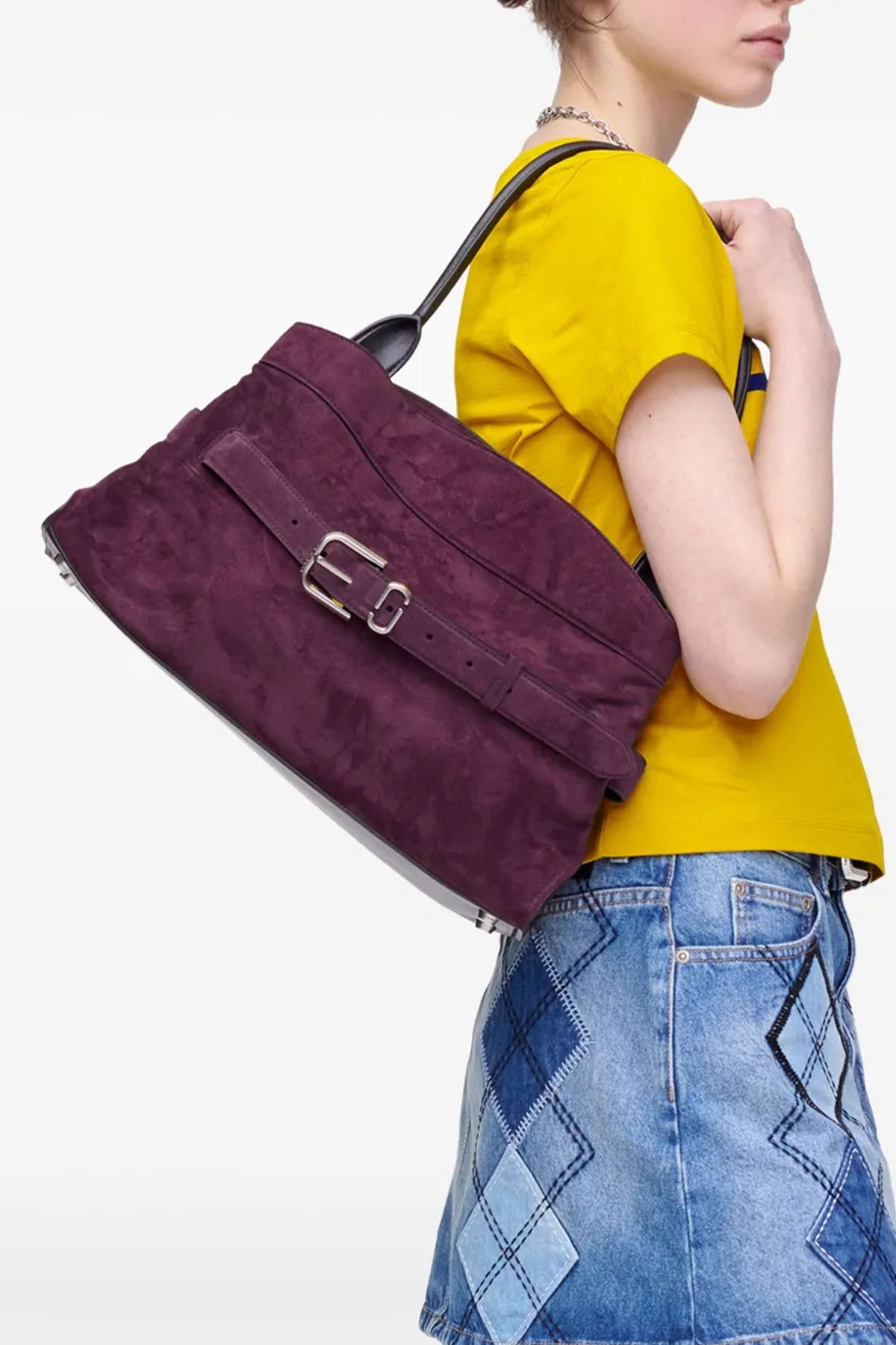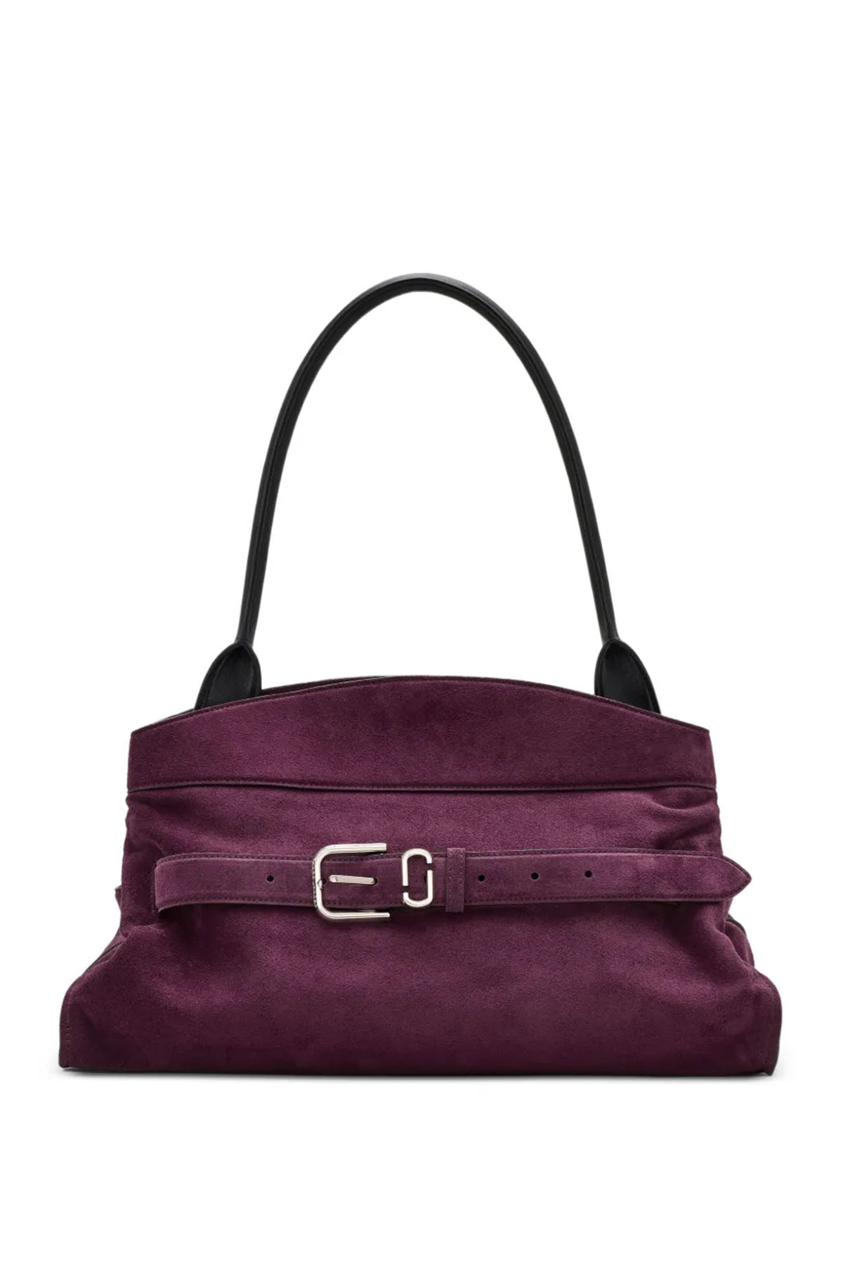 Modello realizzato in morbida pelle scamosciata, cintura fissa con logo J Marc, chiusura magnetica, due scomparti interni e tasche, piedini in metallo, manico ampio che consente di indossarla a spalla.