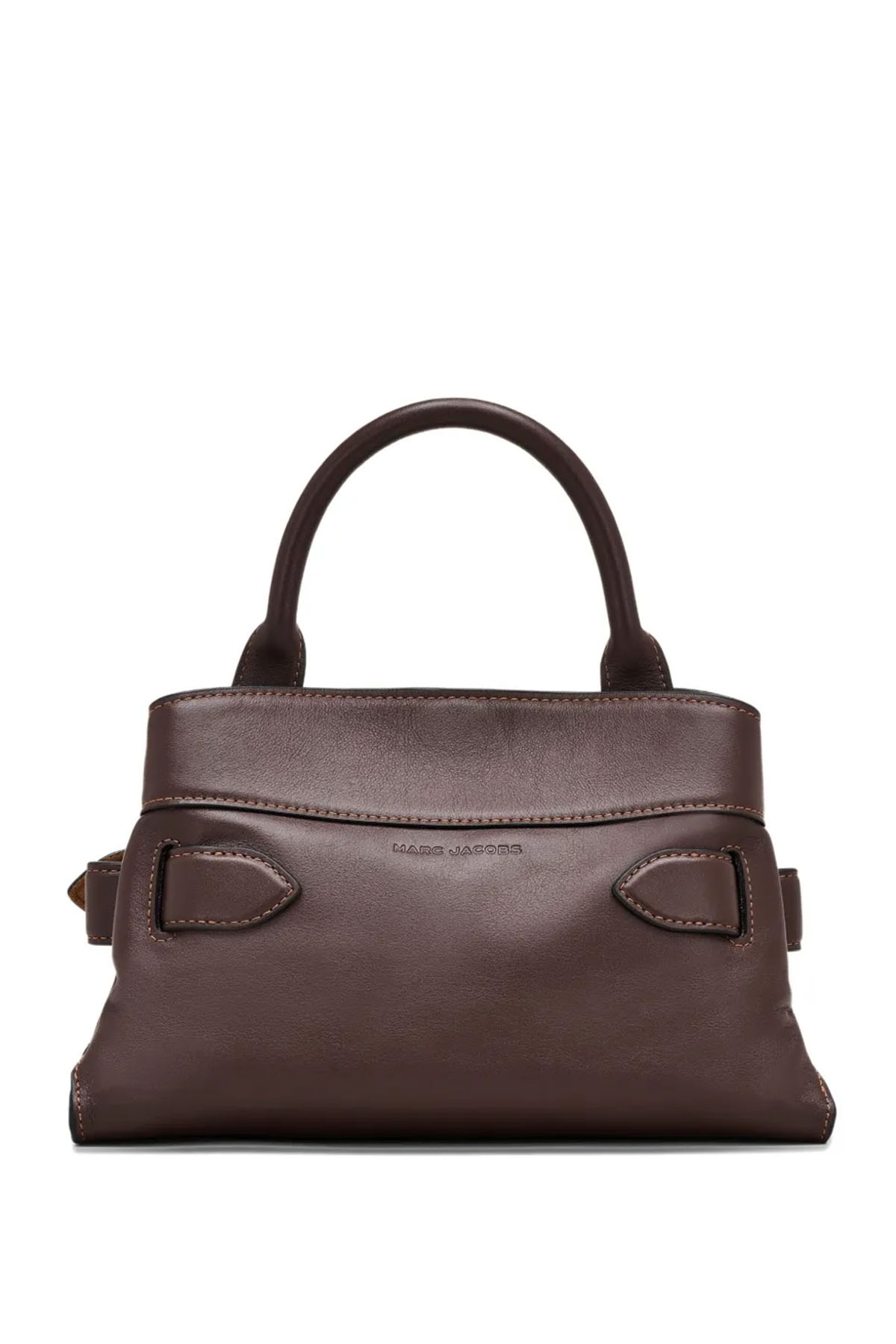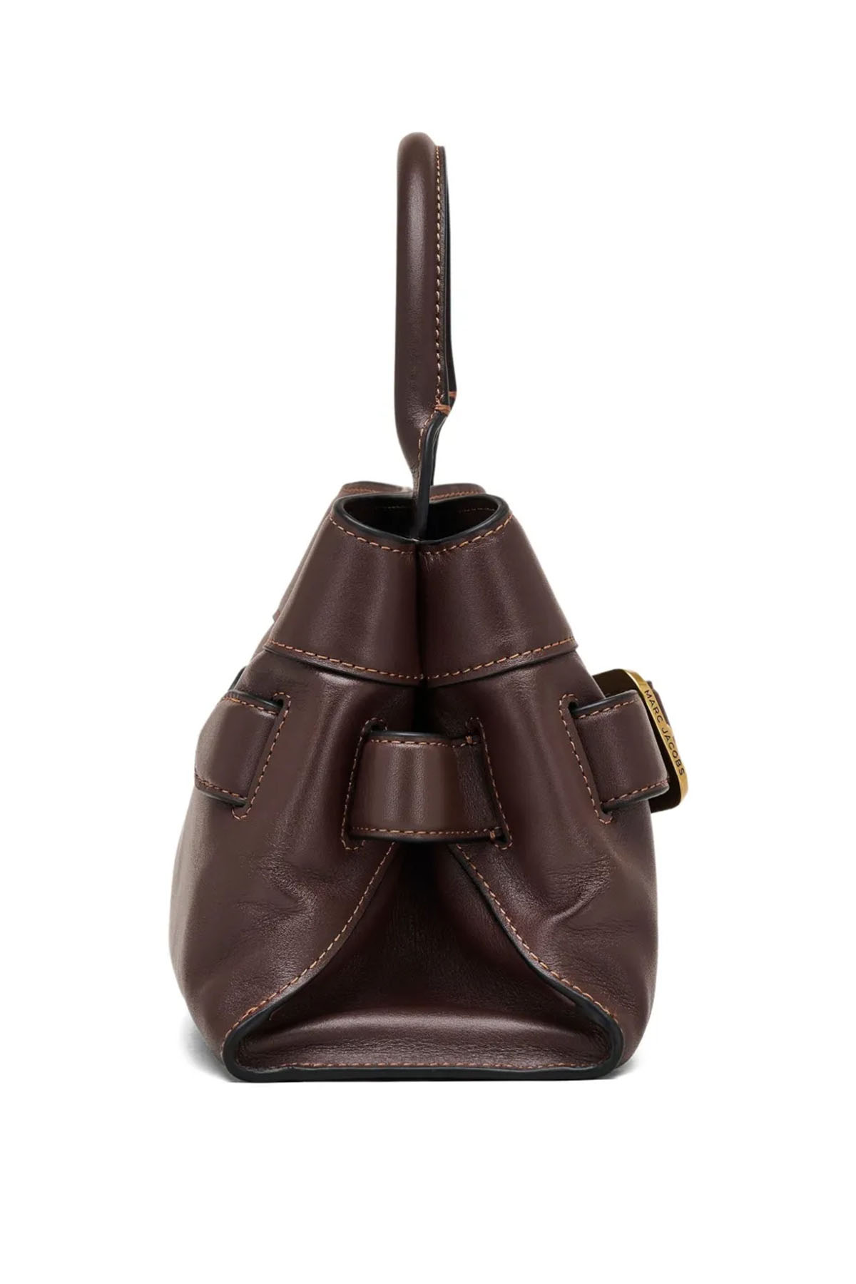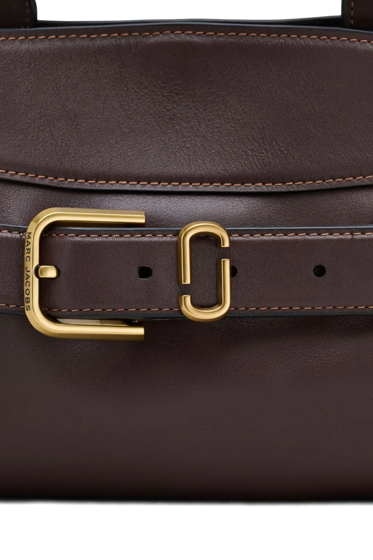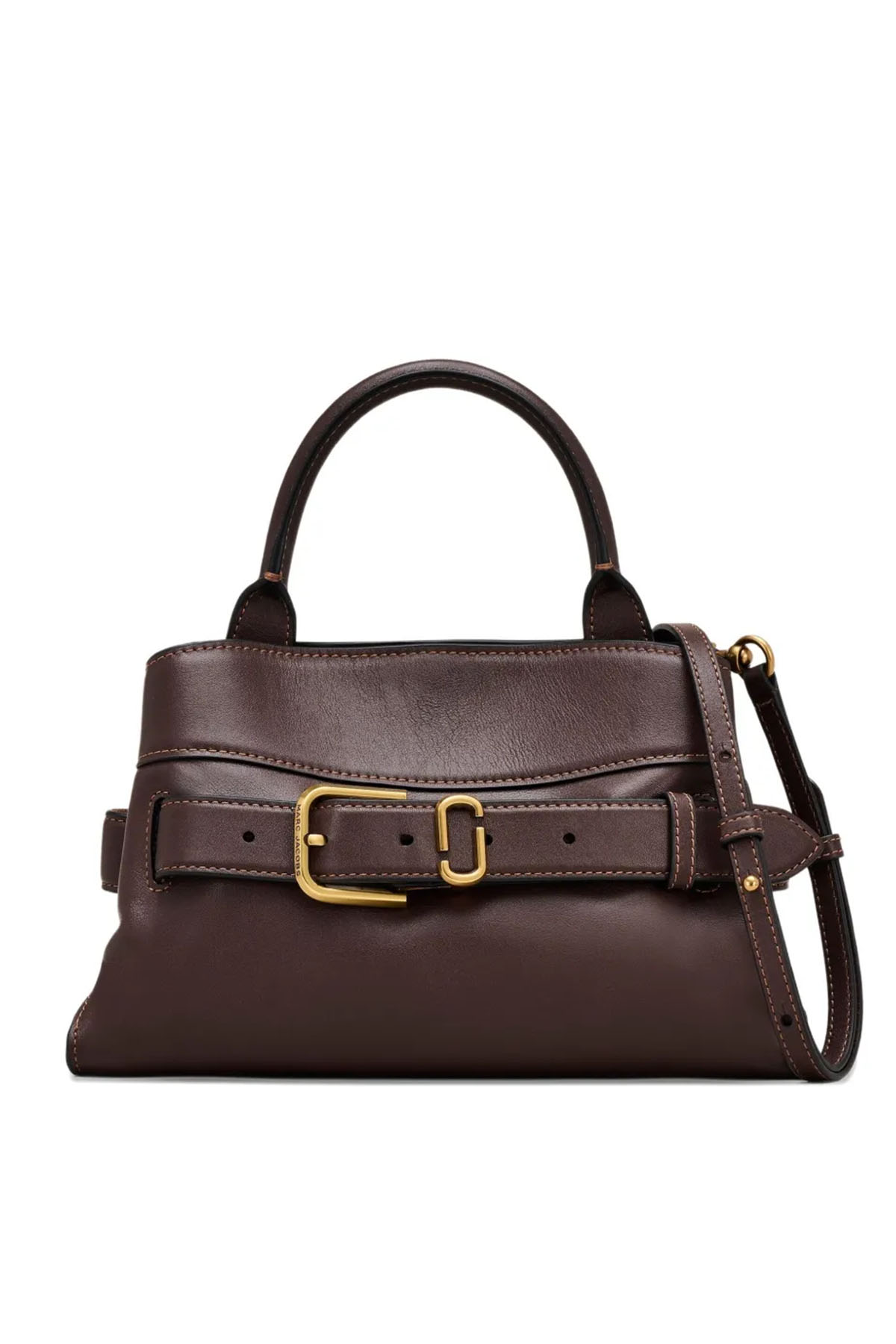 modello in marrone scuro, manico, tracolla regolabile e rimovibile, dettagli color oro, dettaglio fibbia, chiusura superiore con zip.