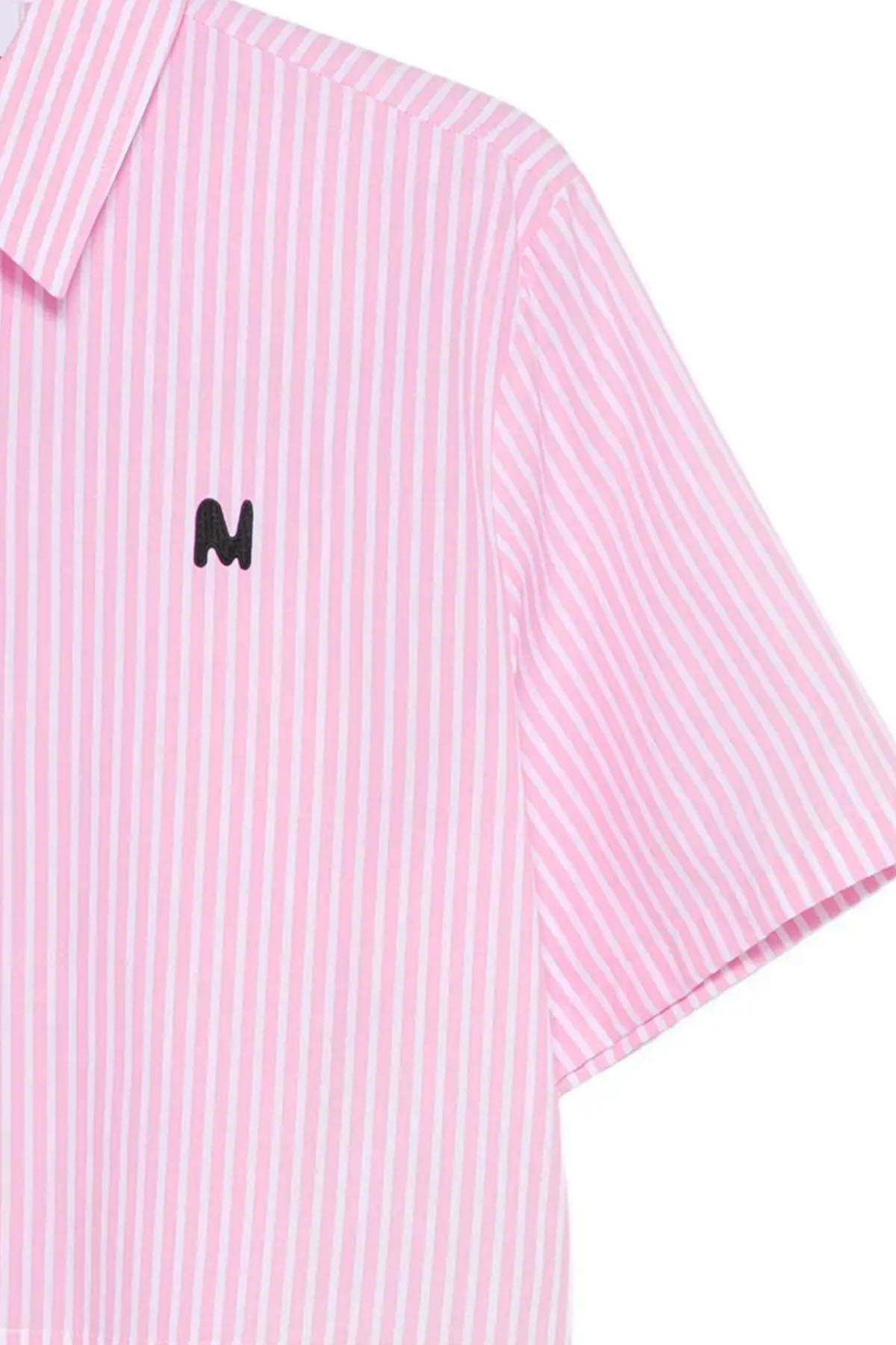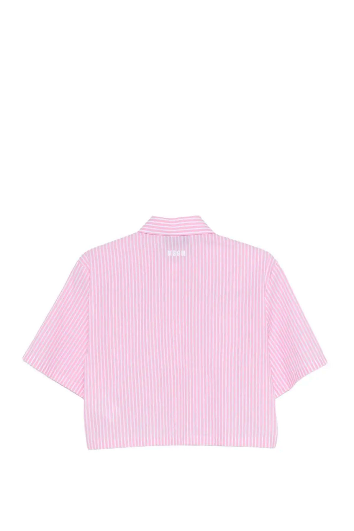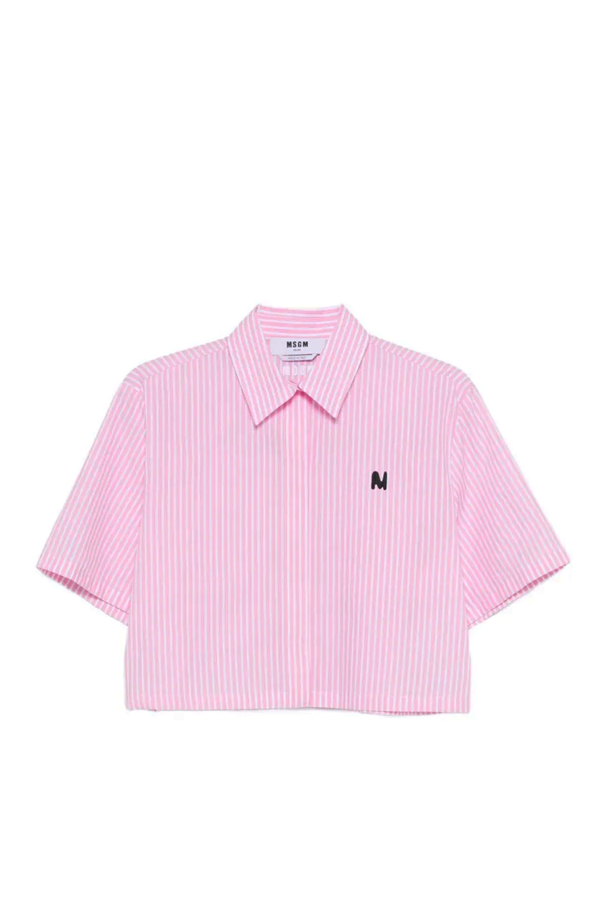 modello rosa/bianco, motivo a righe, colletto, maniche corte, dettaglio ricamato, taglio spalla basso, design crop.