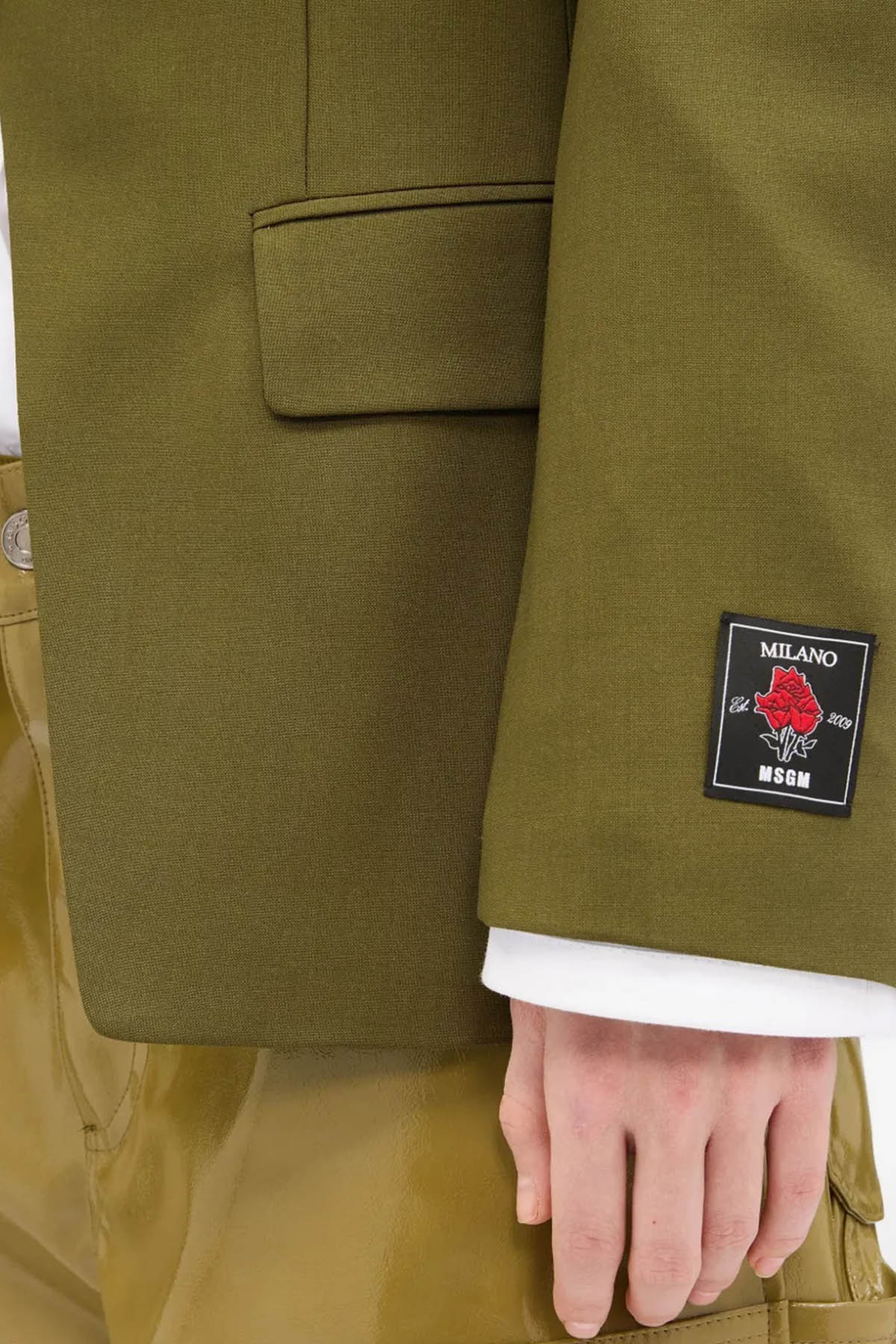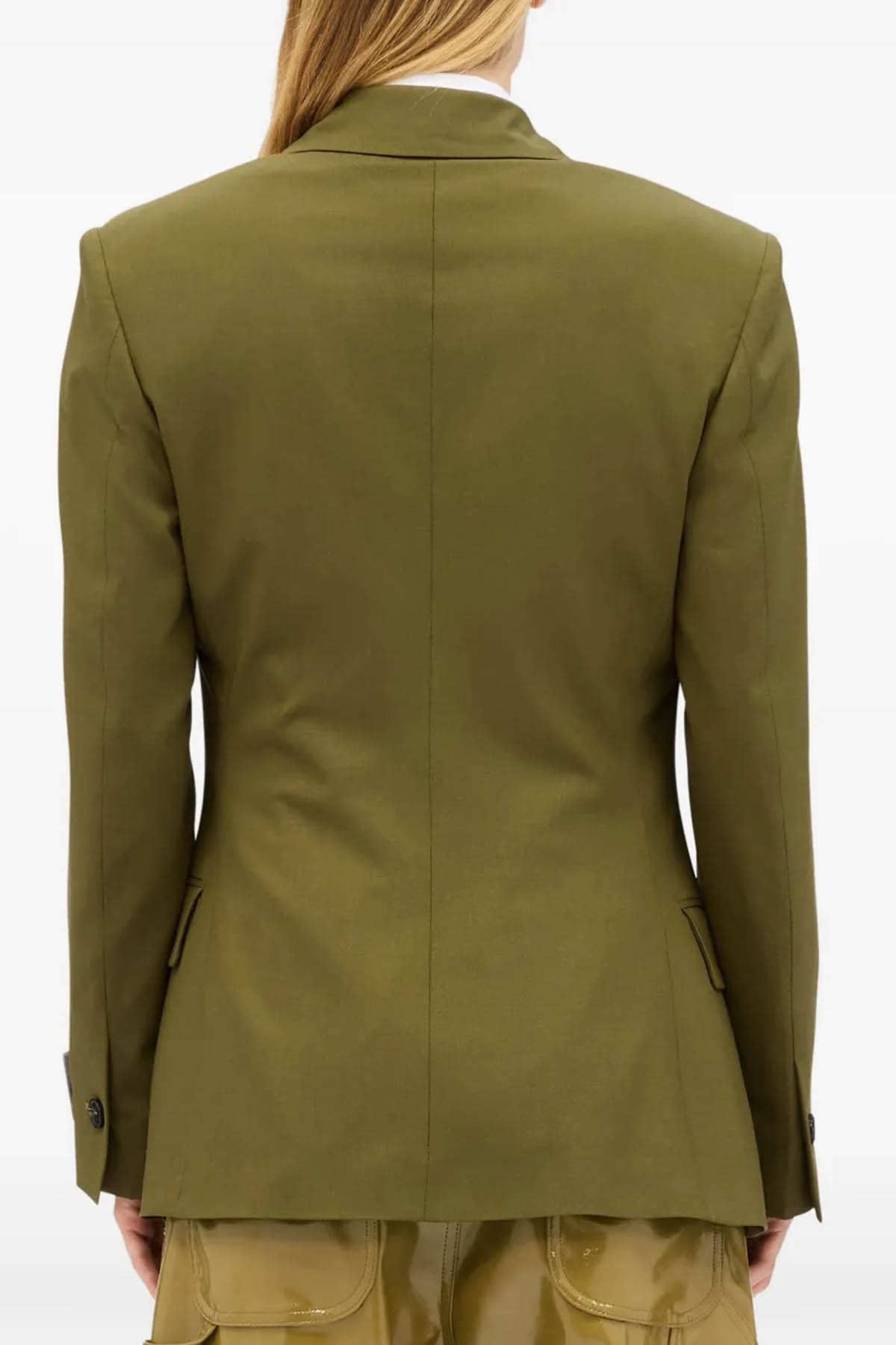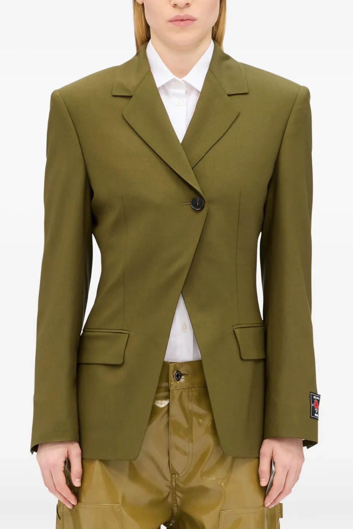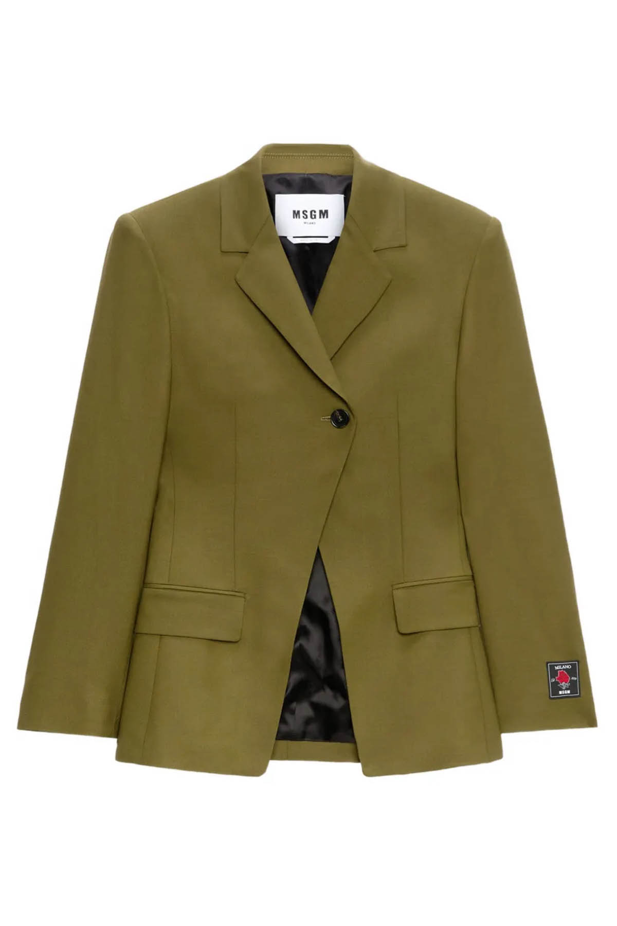 Modello monopetto asimmetrica in fresco lana con revers classico, spalle strutturate e pinces sul davanti che accentuano la silhouette, tasche frontali con patta, polsini con bottoni e spacco centrale sul retro. Dettaglio etichetta sartoriale applicata sulla manica.