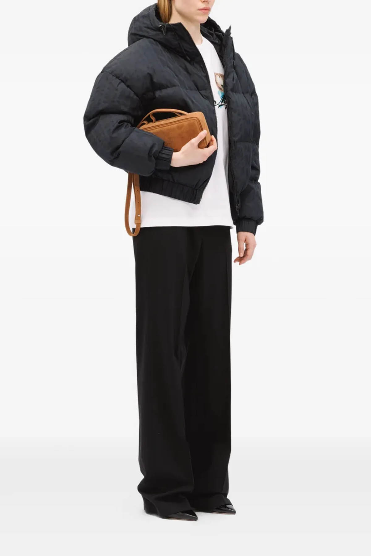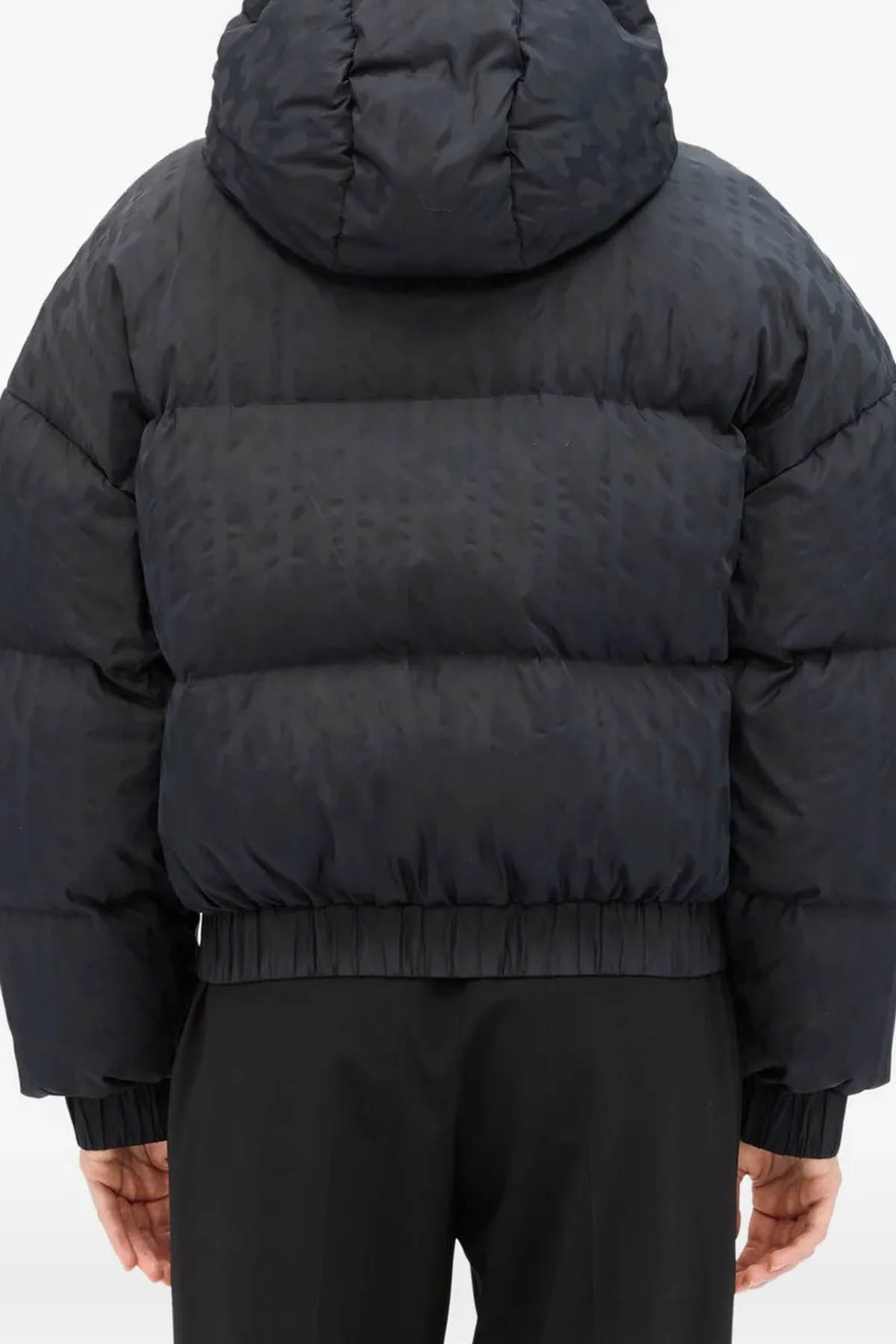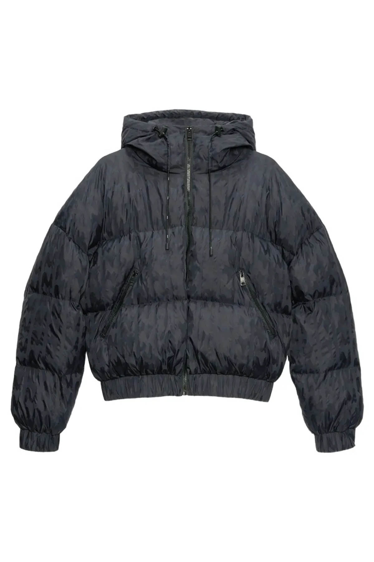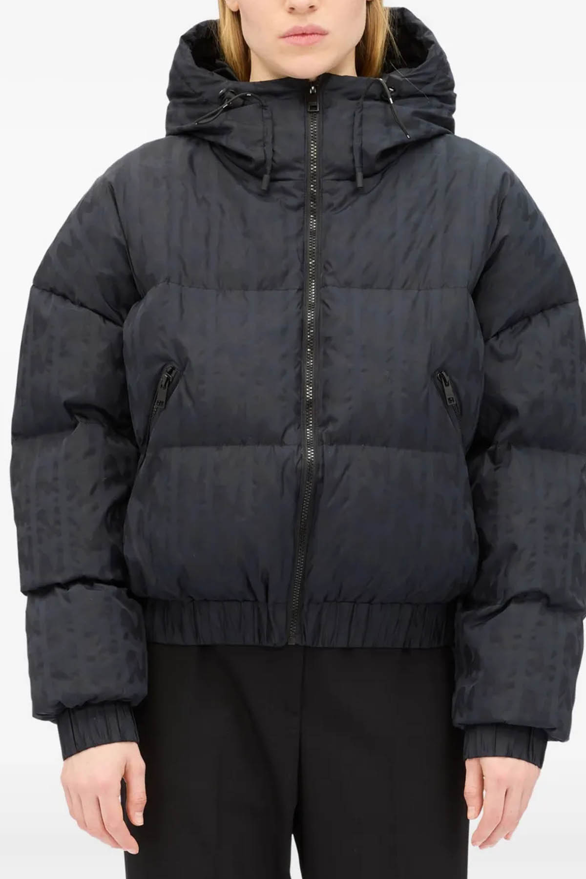 Modello in nylon jacquard con motivo "TheMwave" all-over, cappuccio regolabile con coulisse e stopper, due tasche laterali con zip obliqua e polsini elasticizzati, fondo con elastico interno, chiusura frontale con zip a doppio cursore.