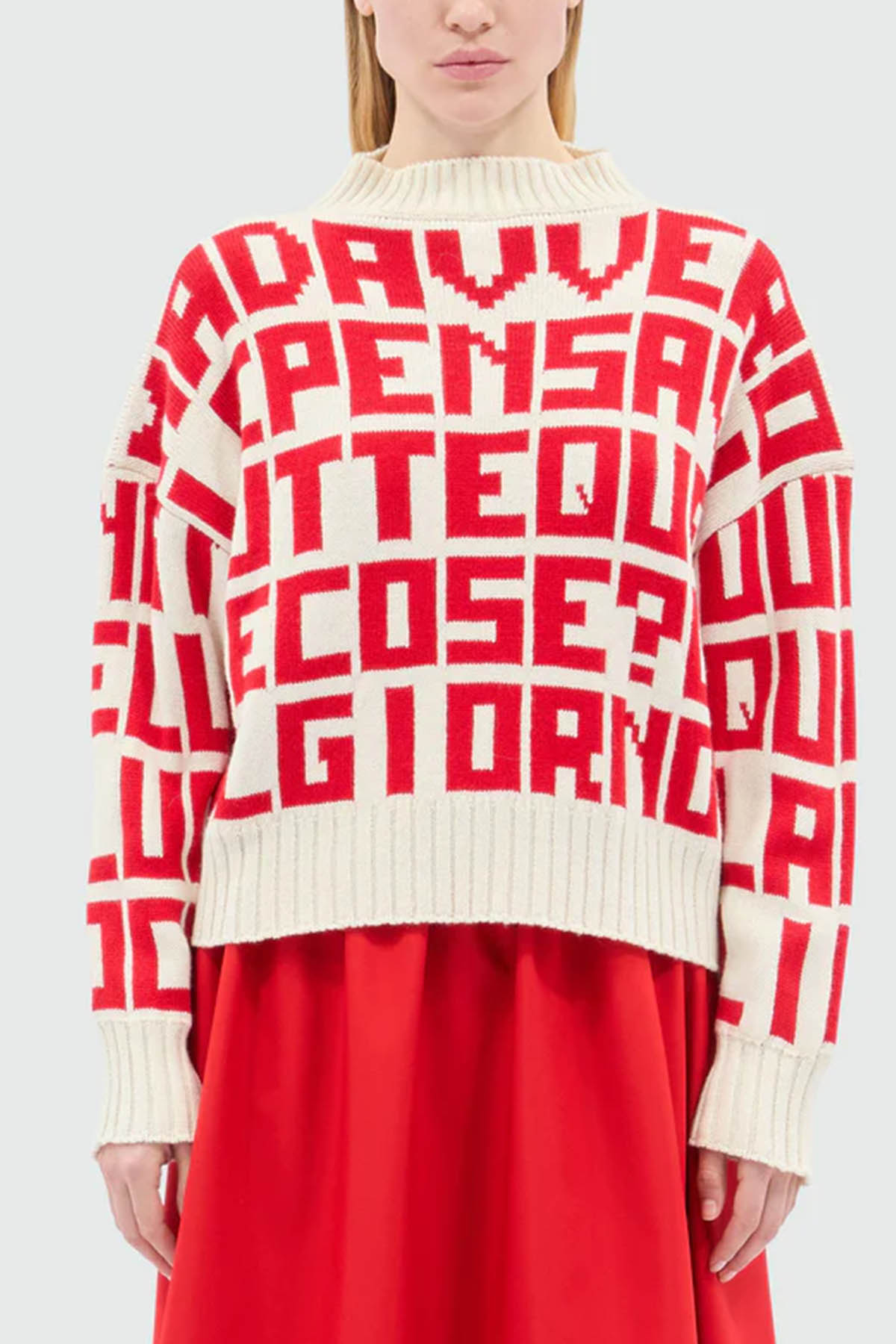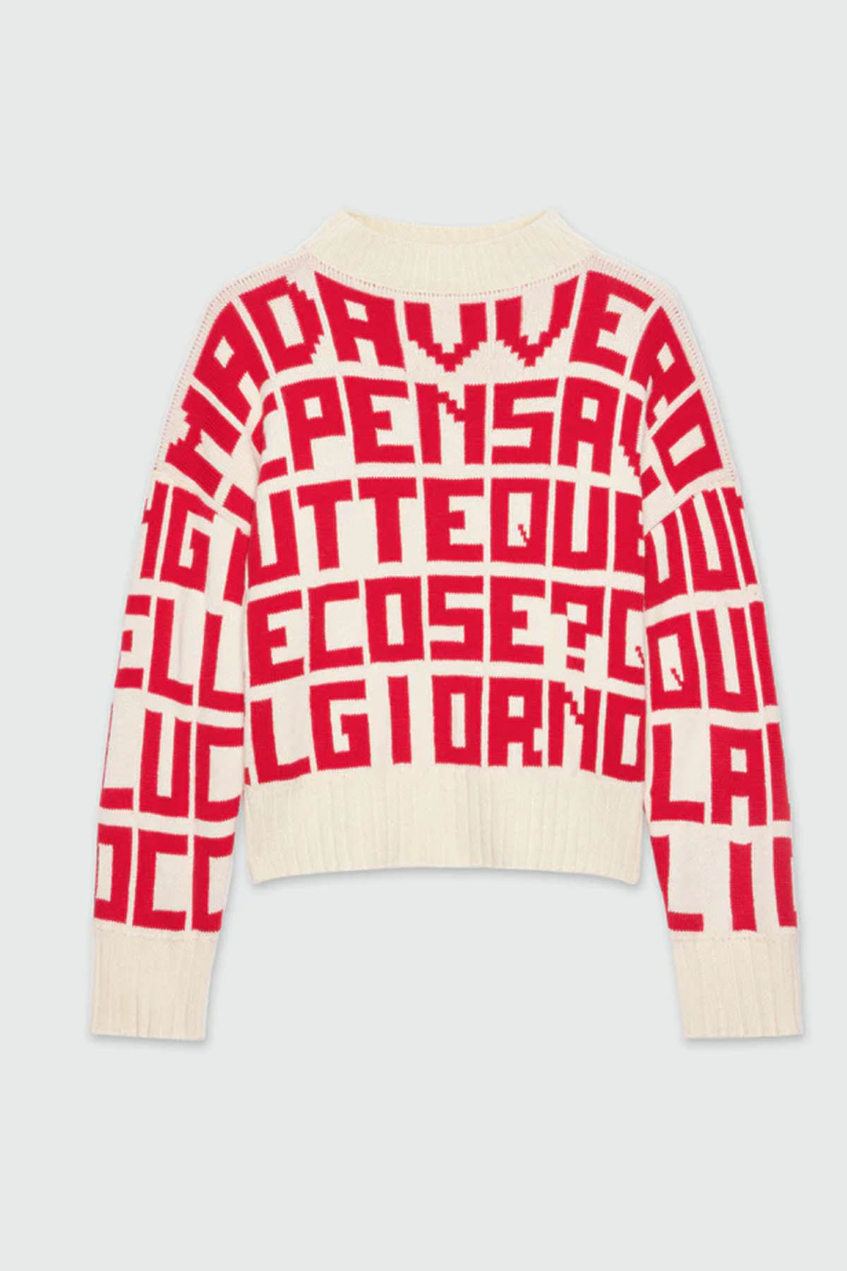 Modello realizzato in filato di misto lana, caratterizzata da una lavorazione jacquard con quote di collezione a contrasto all-over, rifinita con collo a lupetto, polsi e fondo a costine, etichetta applicata sul retro.