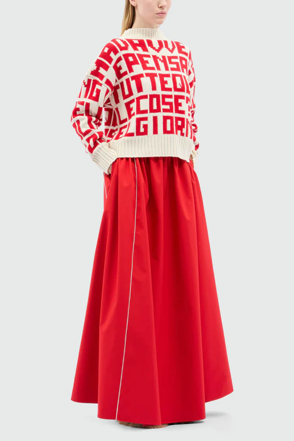 La modella è alta 1,76 e indossa taglia 40.