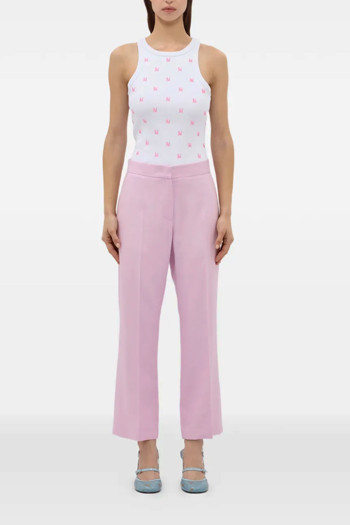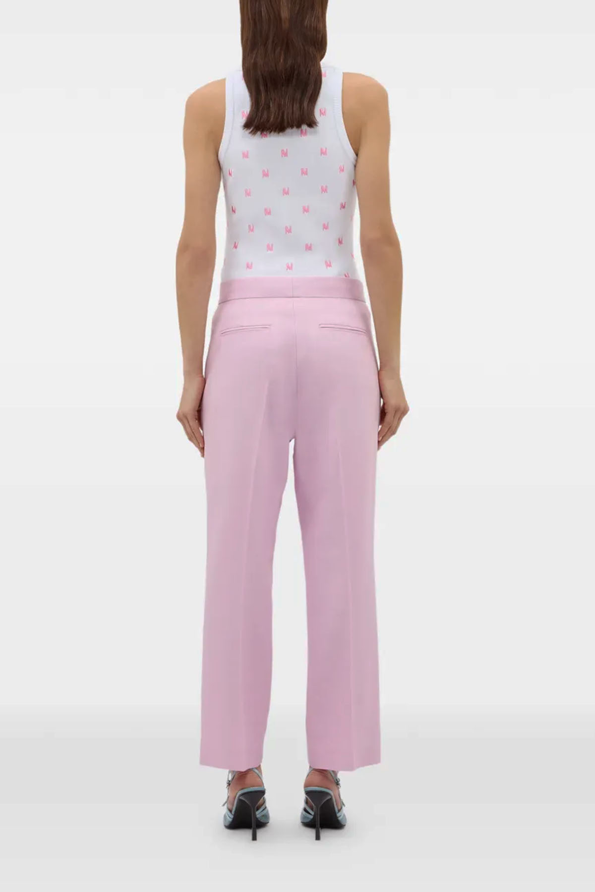 modello rosa pastello, tasche posteriori a filetto, chiusura frontale nascosta.