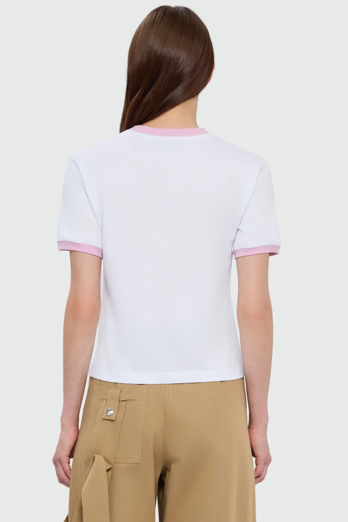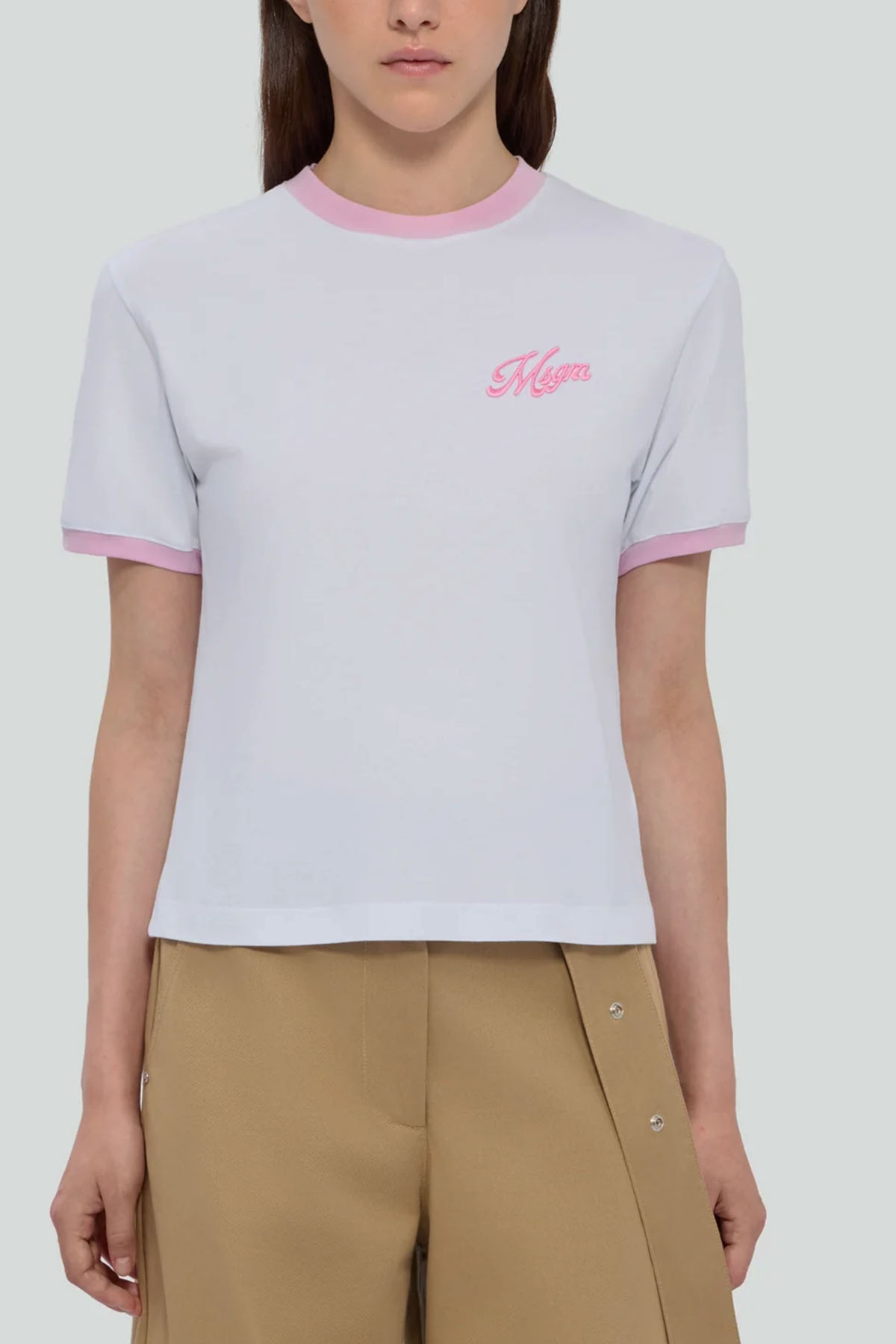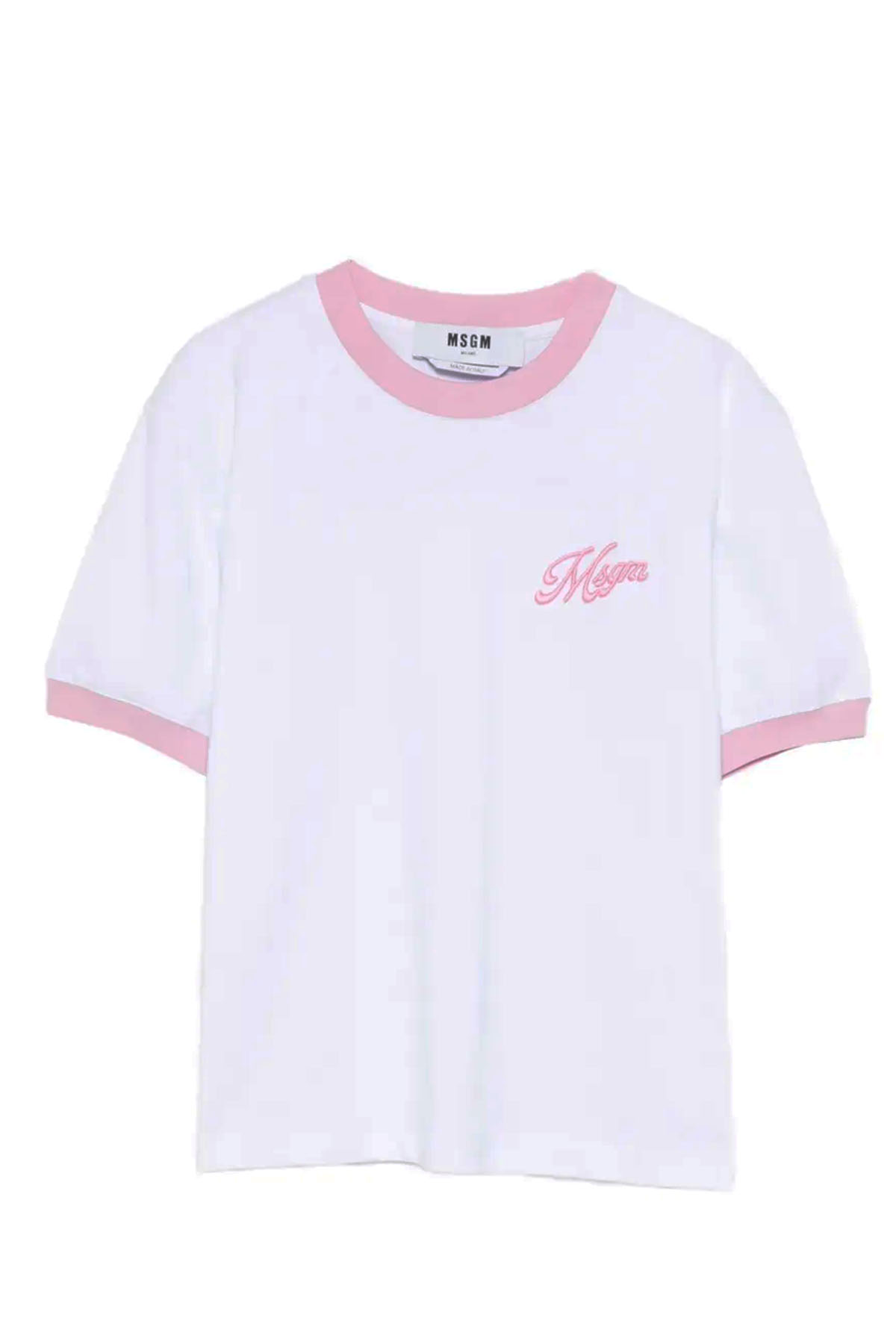 T-shirt in jersey di cotone, ricamo su petto sinistro MSGM italics, girocollo manica corta, colore bianco/rosa.
