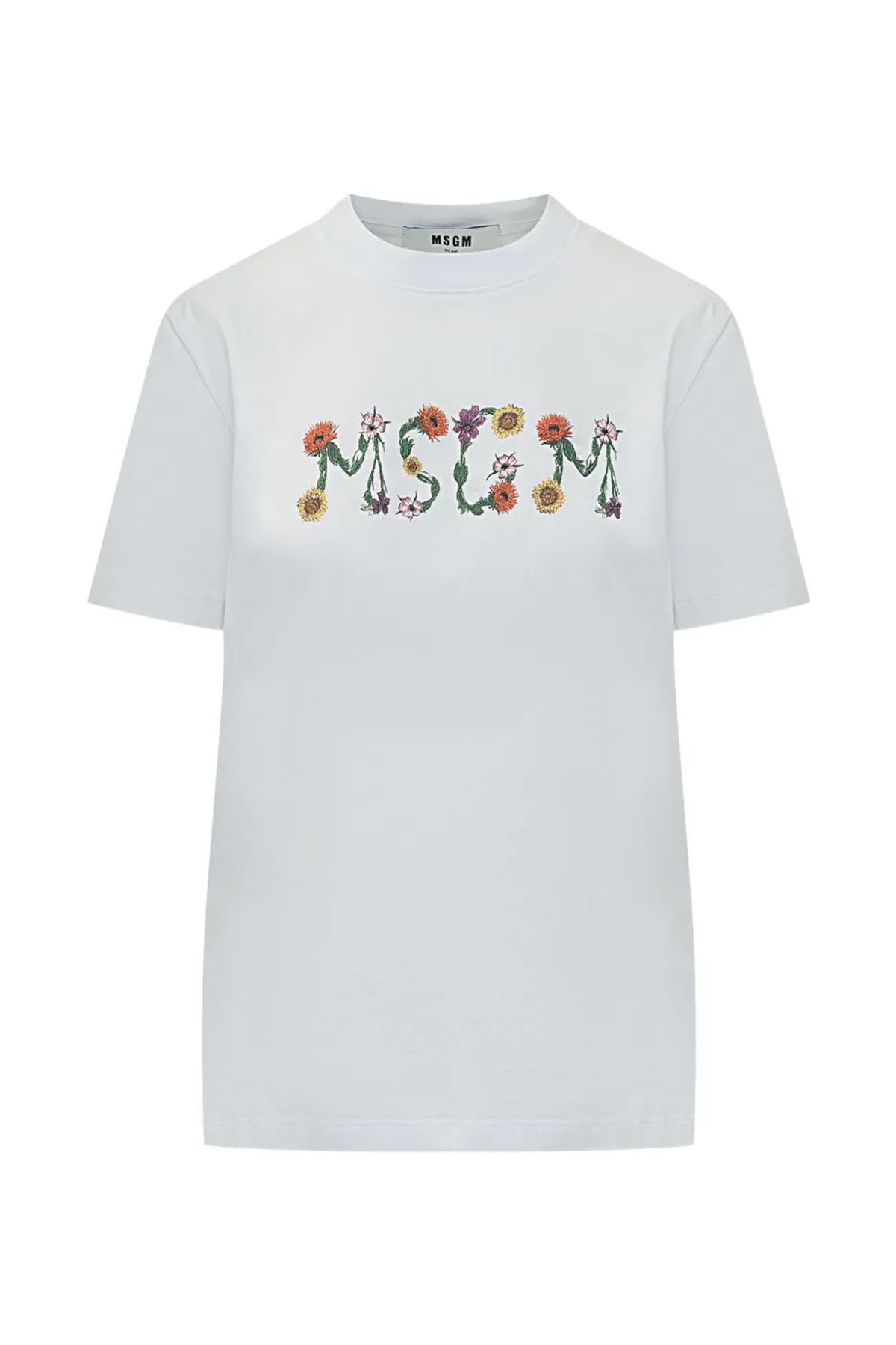 modello girocollo, maniche corte, logo ricamato frontale con fiori.