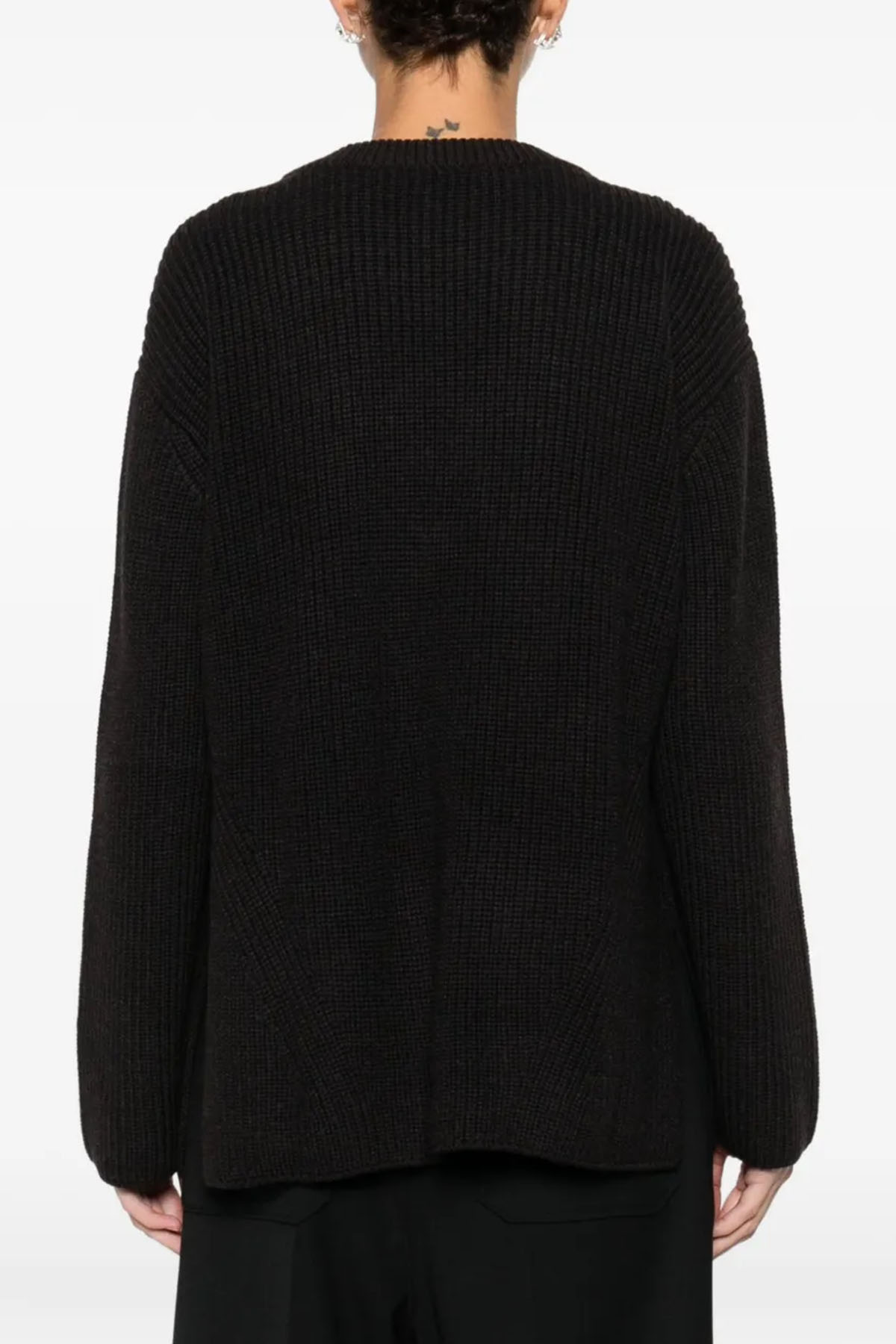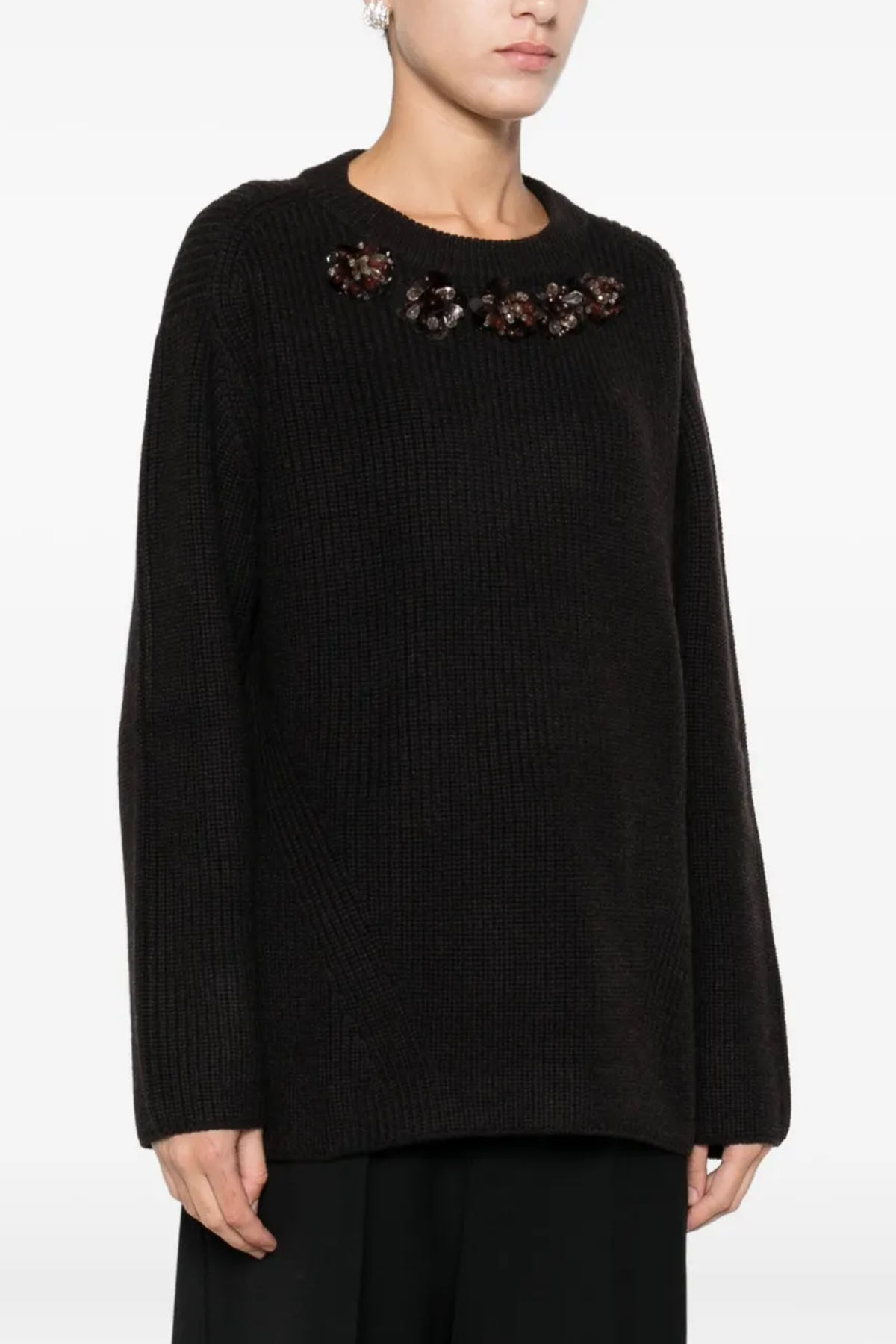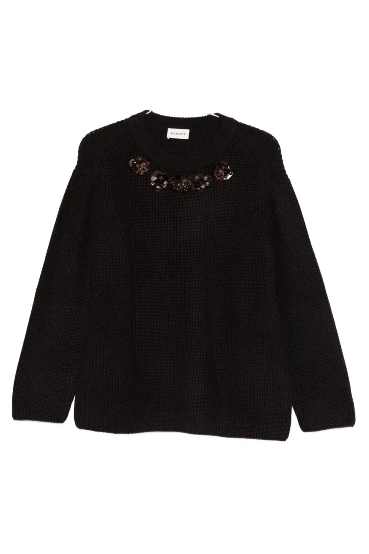 Modello girocollo, manica lunga, applicazioni sul collo, spacchetti laterali, orlo dritto.