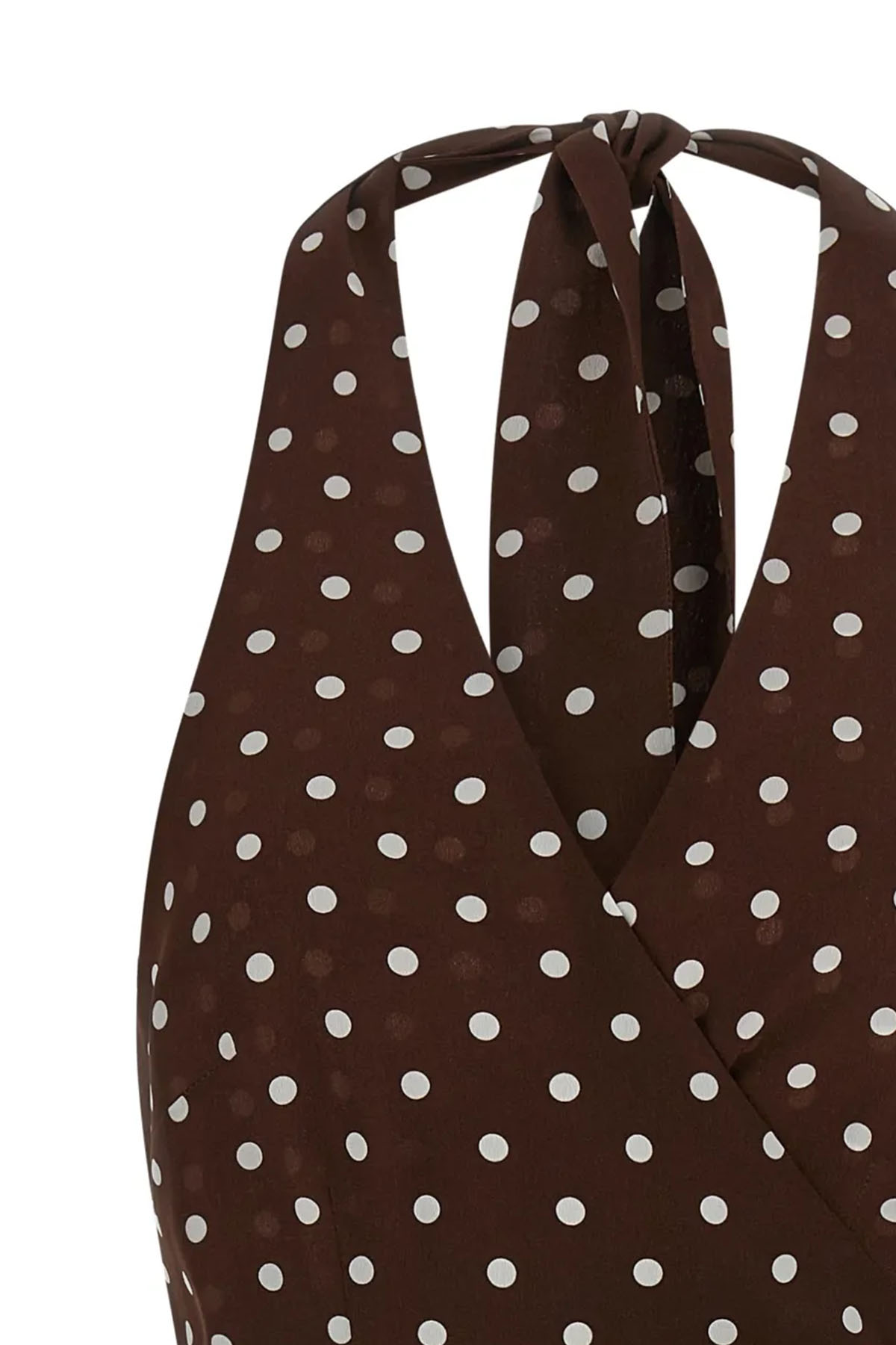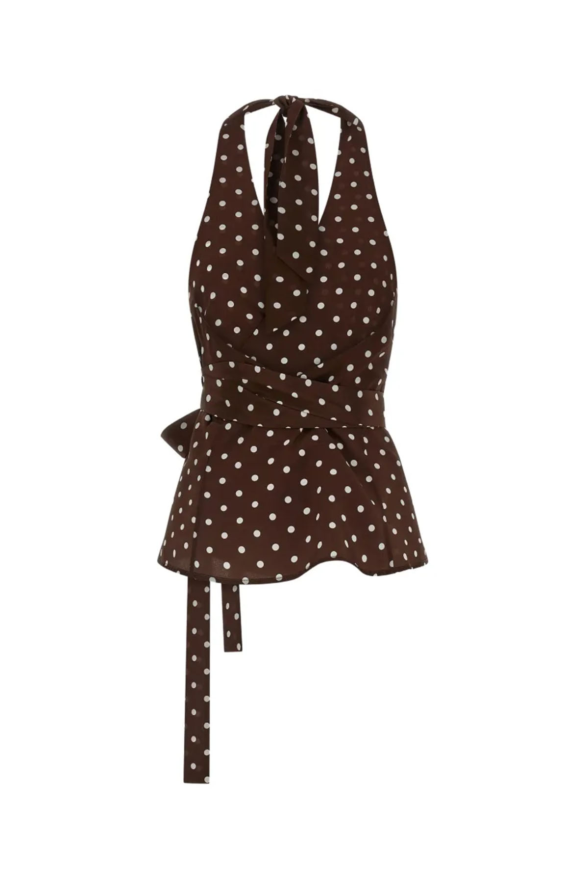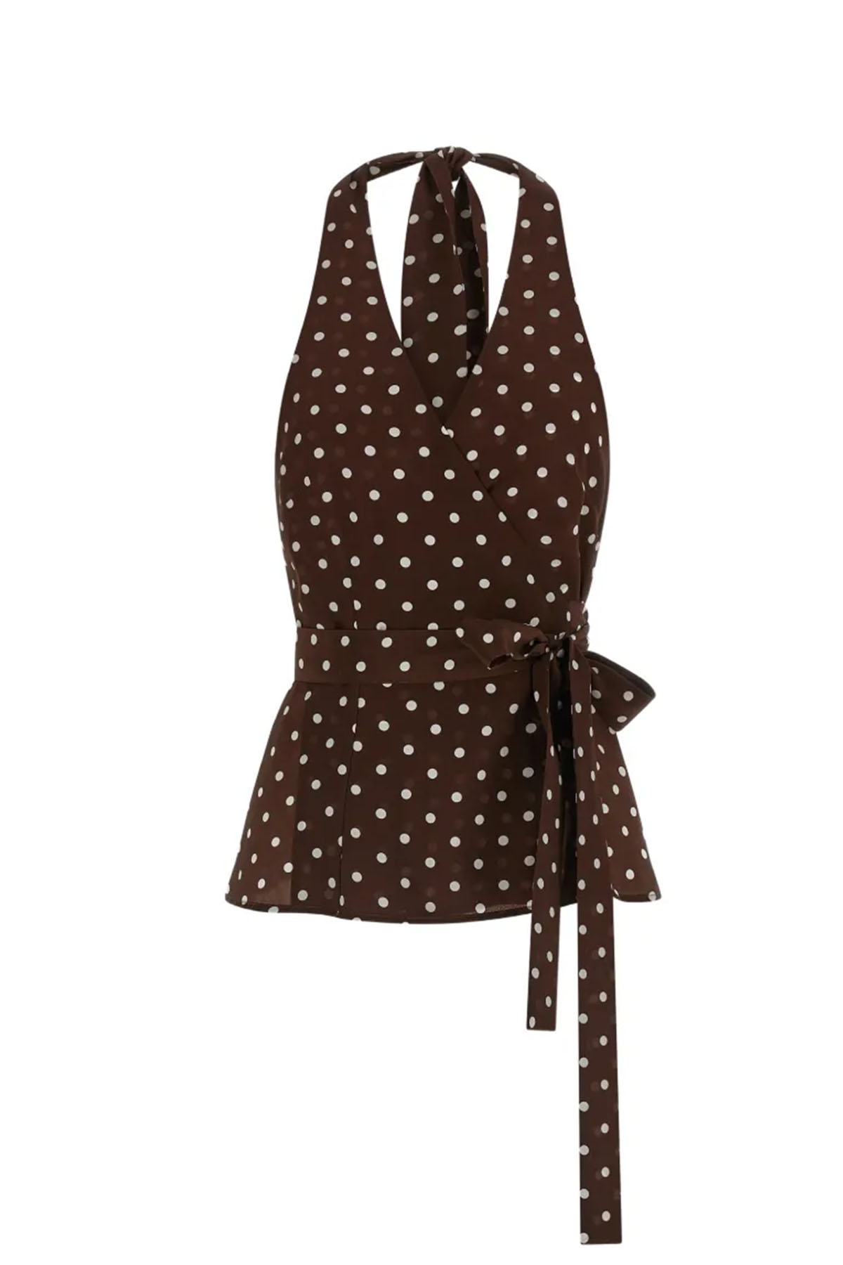 top con stampa a pois marrone/bianchi, scollo sul retro, chiusura con nodo, design a portafoglio, nodo laterale.