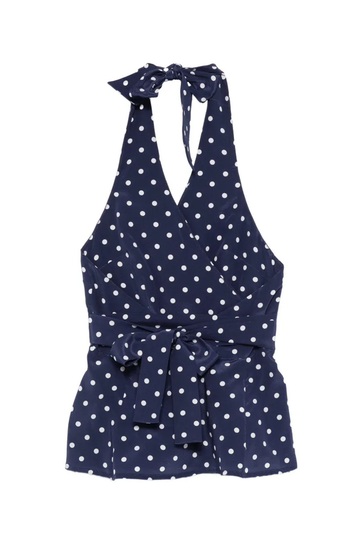 top con stampa a pois blu/bianchi, scollo sul retro, chiusura con nodo, design a portafoglio, nodo laterale.