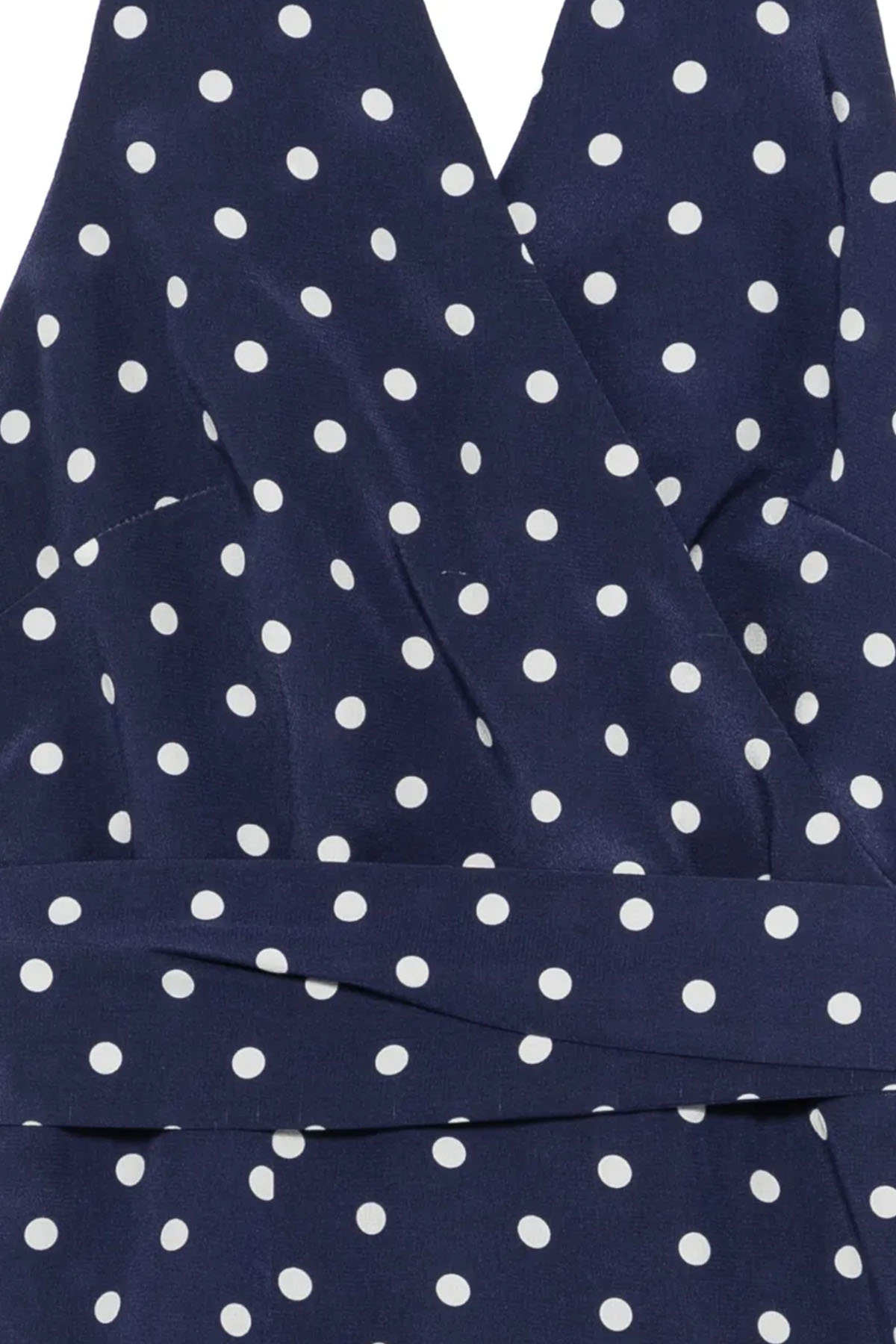 Aggiungi al carrellotop con stampa a pois blu/bianchi, scollo sul retro, chiusura con nodo, design a portafoglio, nodo laterale.