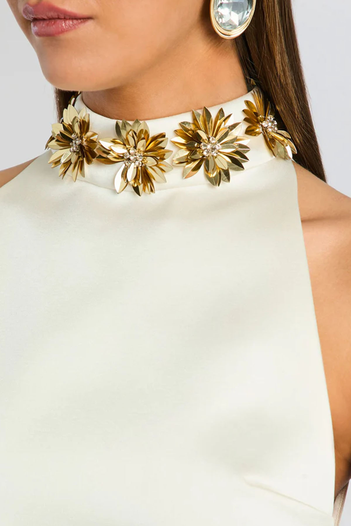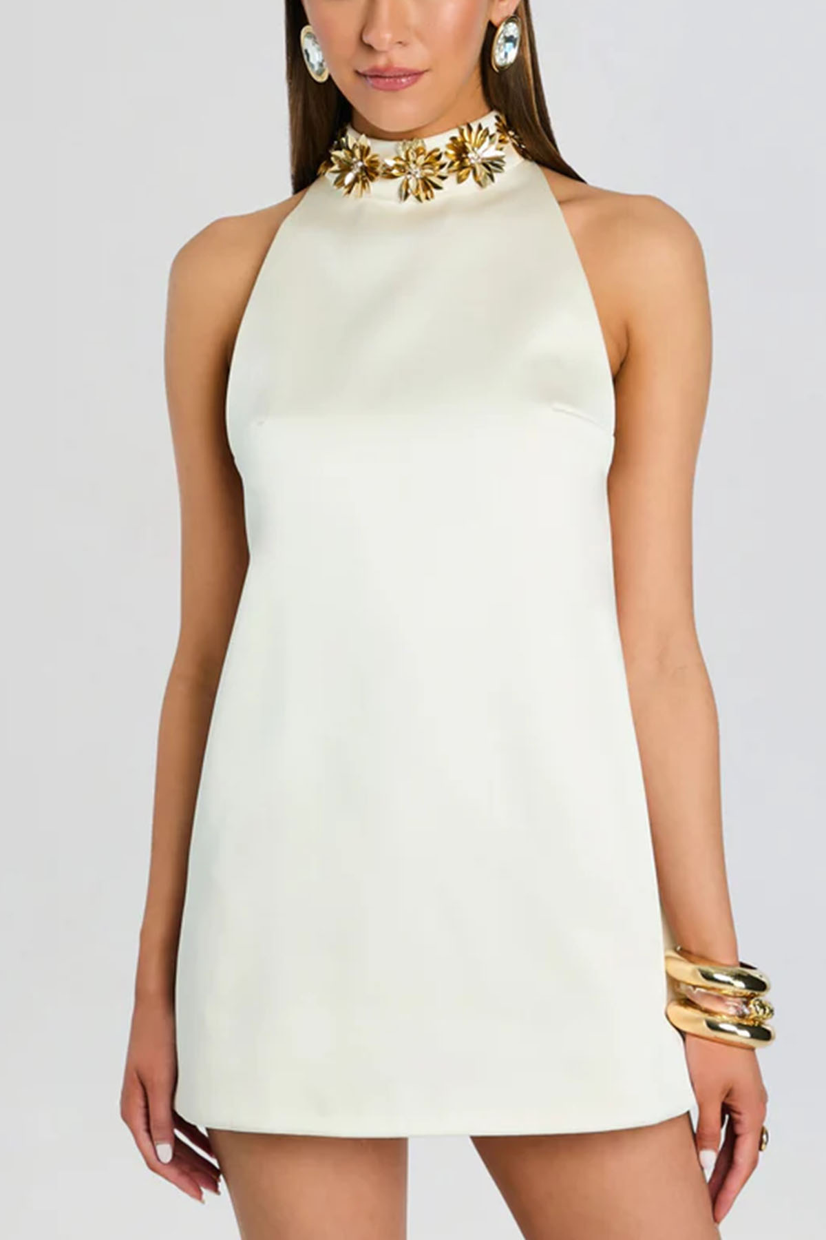 mini abito a tubino in lussuoso raso con scollo alto impreziosito da delicati ricami floreali dorati, rifinito con una cerniera posteriore nascosta, offre una silhouette strutturata, colorazione Crema/Oro.