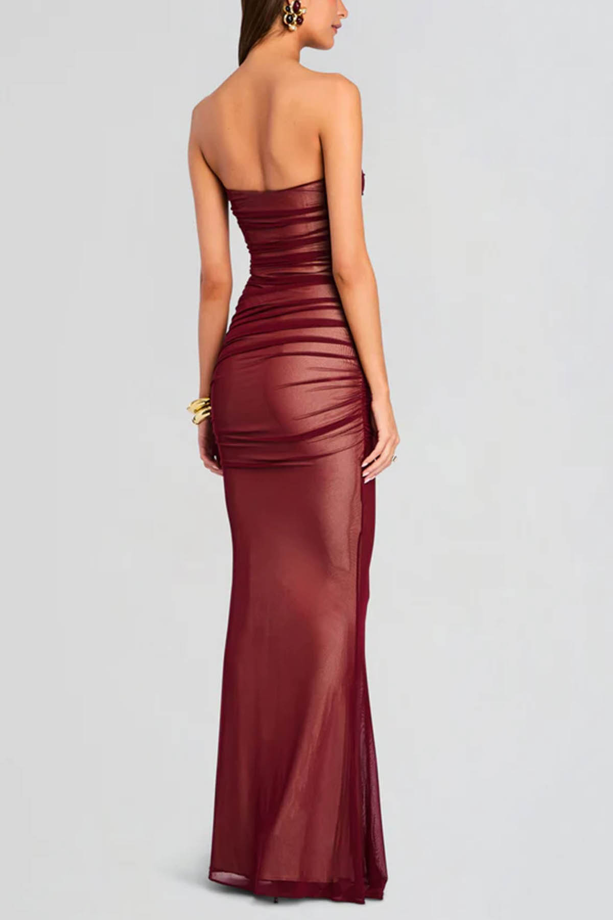 Modello senza spalline, chiusura con zip nascosta, arricciature sul davanti, design lungo e aderente.