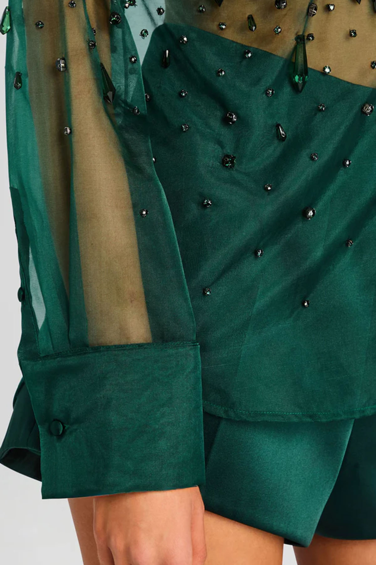 Modello con colletto, manica lunga, abbottonatura frontale nascosta, design trasparente, impreziosita da scintillanti strass.