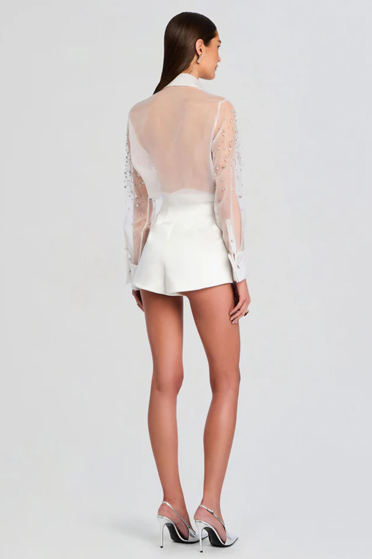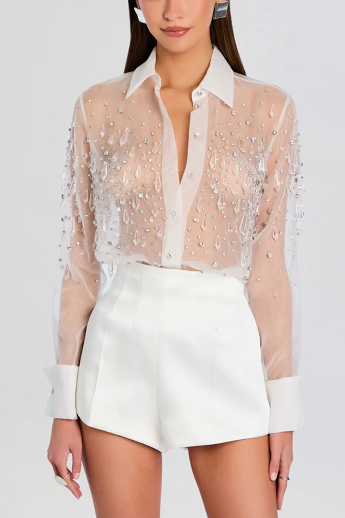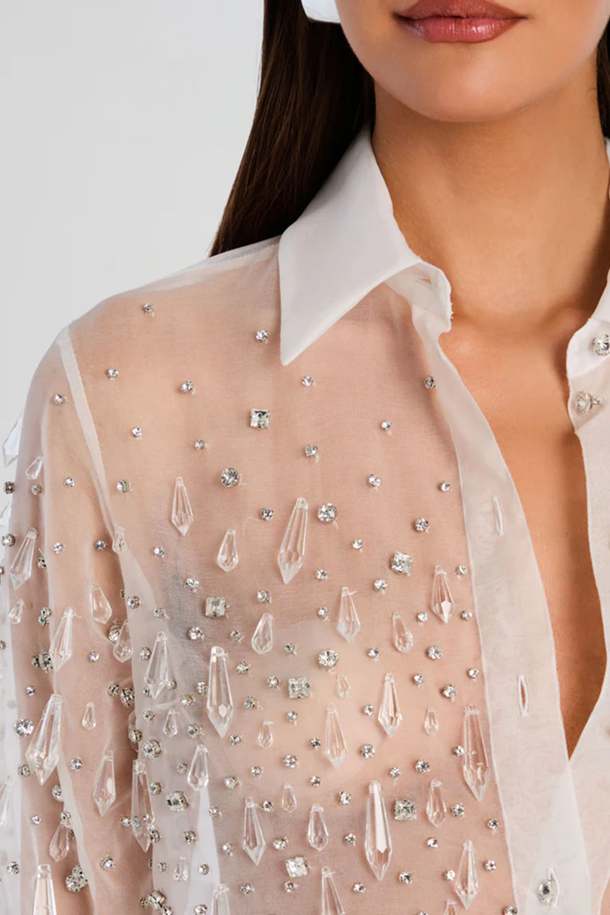 camicia trasparente con colletto impreziosito da scintillanti strass, delicata trasparenza e i dettagli luccicanti creano un look elegante, abbottonatura frontale, manica lunga, colore bianco.